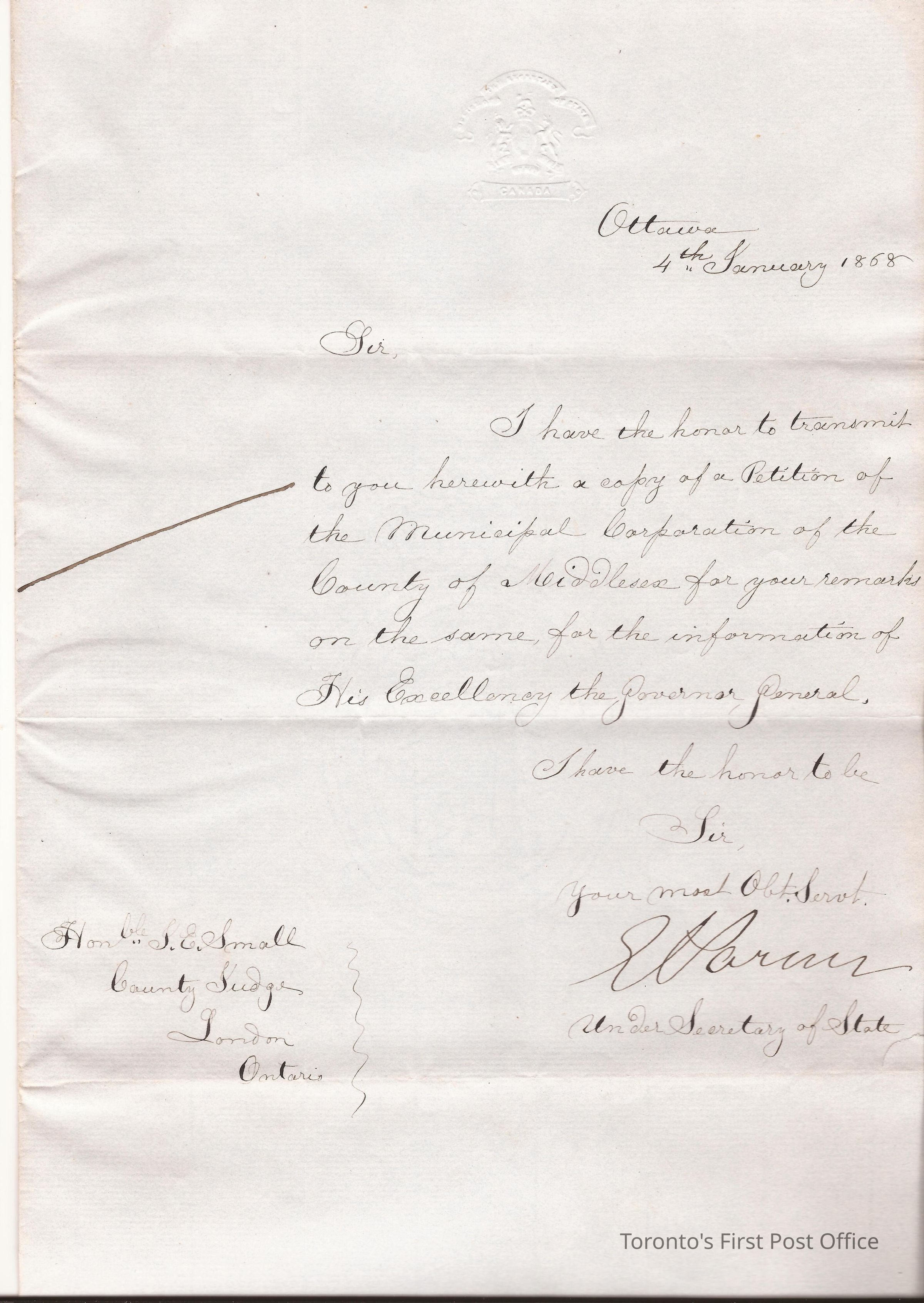 Letter; to Honble S.E. Small, County Judge, London, Ontario; from EL Permer, Undersecretary of State; re: petition for Small's information and remarks for Governor Generals information; black ink on grey laid paper; watermark: "TH SAUNDERS 1862".Update Date
