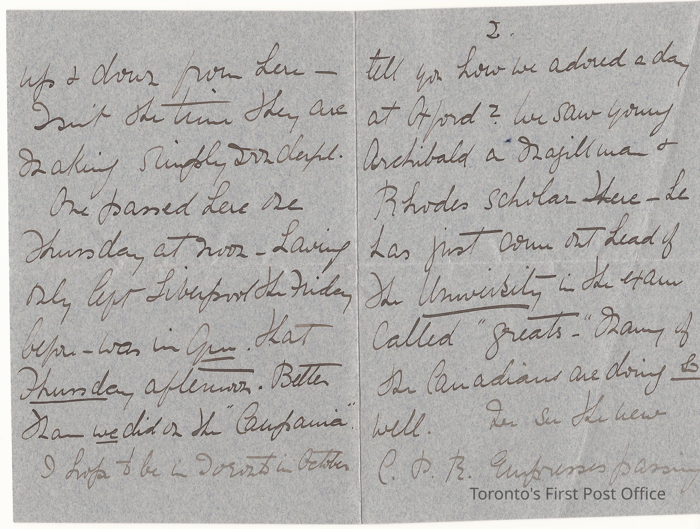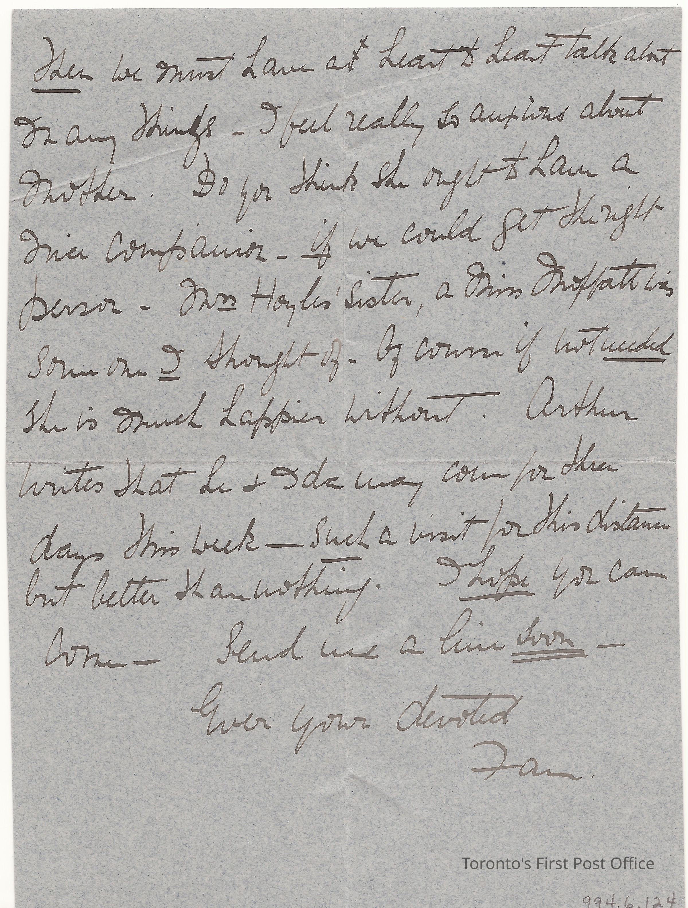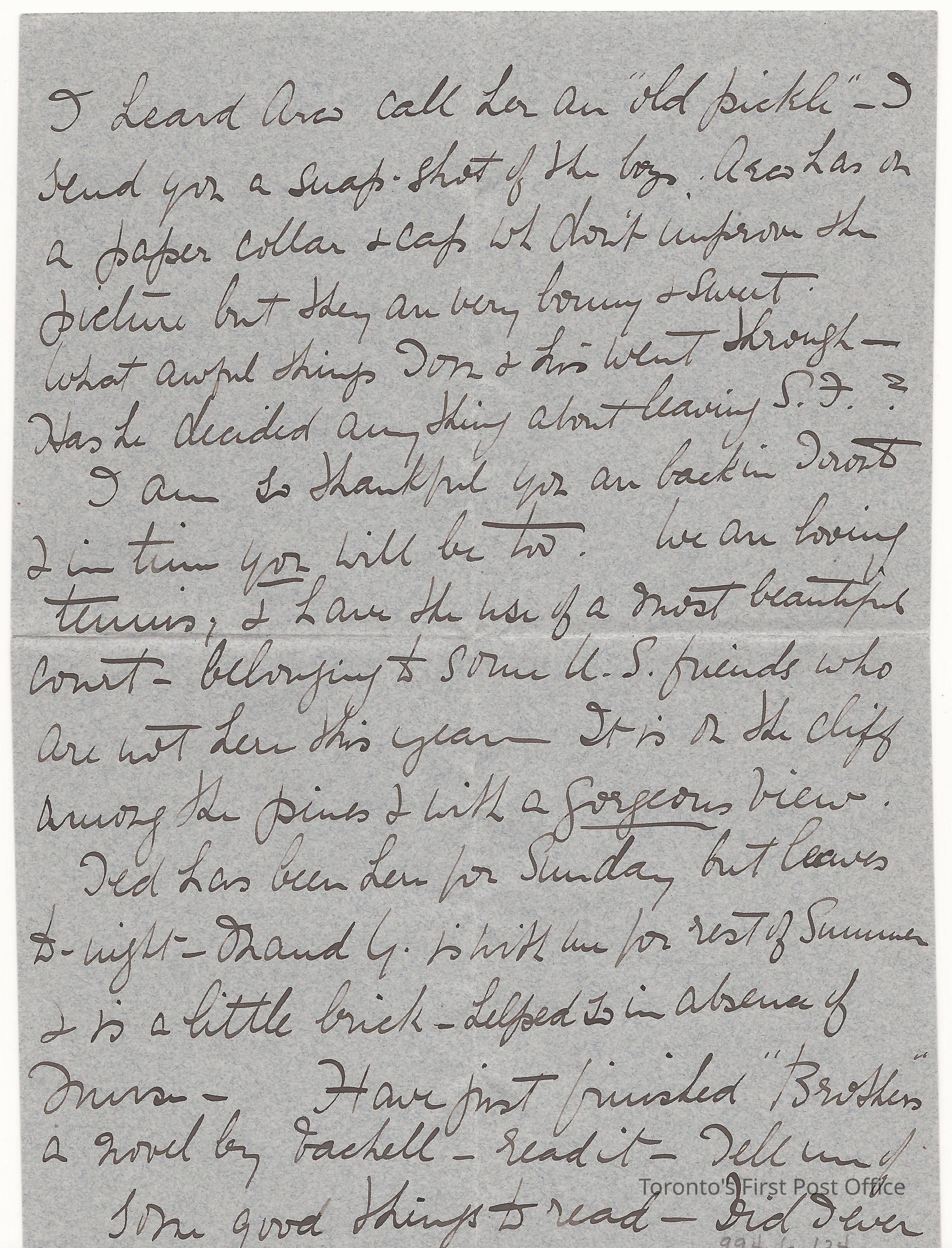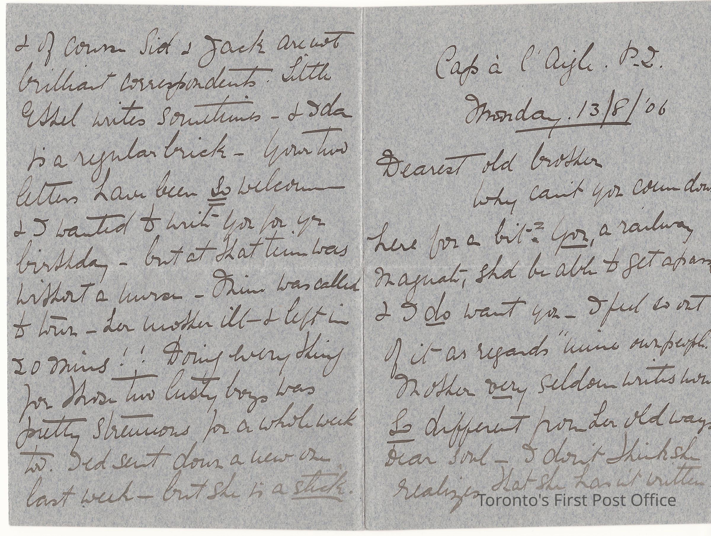 Letter; to "dearest old brother"; from Fan; dated Cap a l'Aigle, PQ, Monday, 13/8/06; re: missing family, children's nurse called away, tennis, mother might need companion; black ink on heavy grey-blue paper.Dimensions