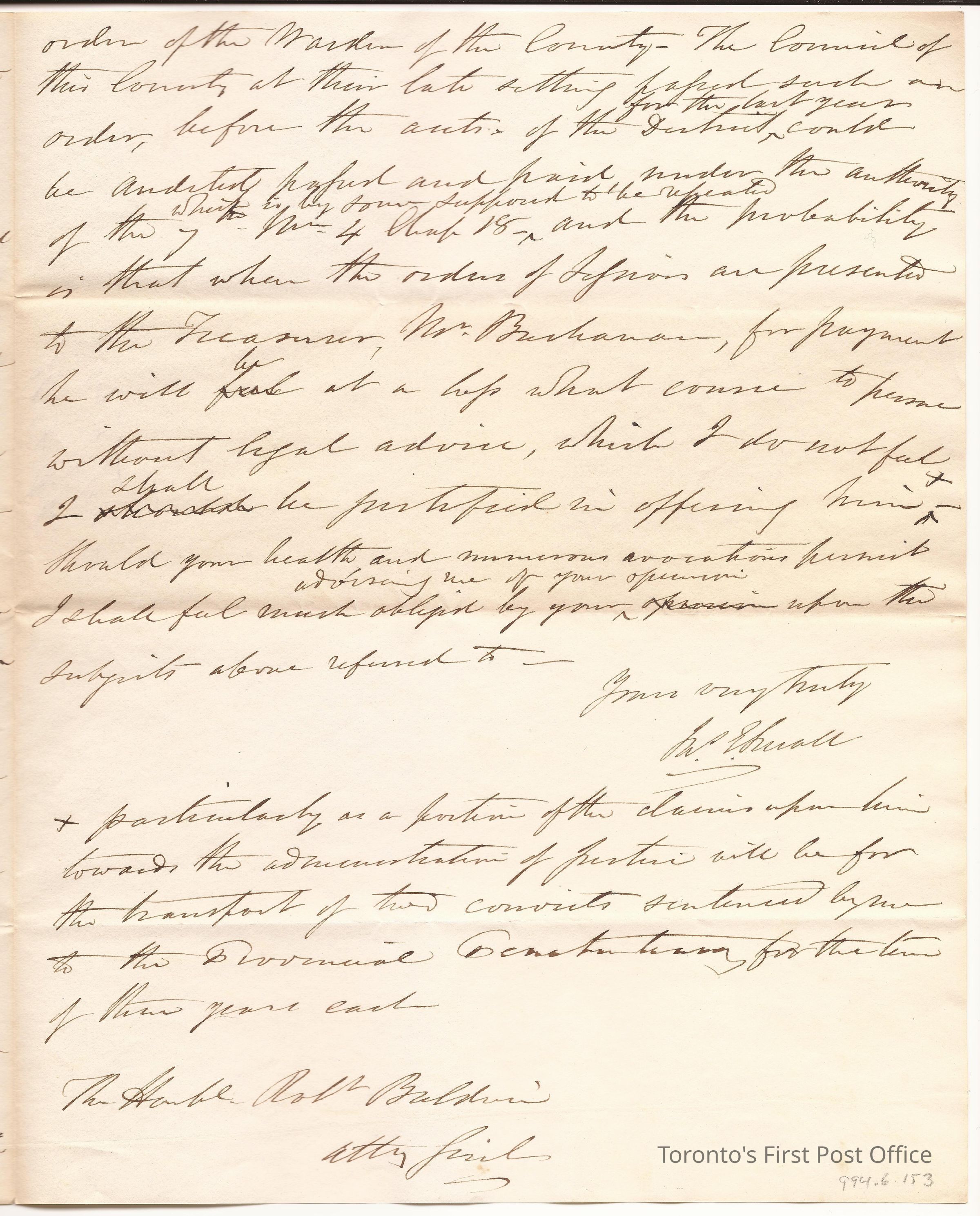 Letter; to the Honble Robt Baldwin Atty Genl; from Jas. E. Small; re: J. E. Small is unhappy about certain happenings within the judicial system, especially those concerning the role of the Justice of the Peace; edited; black ink.Dimensions