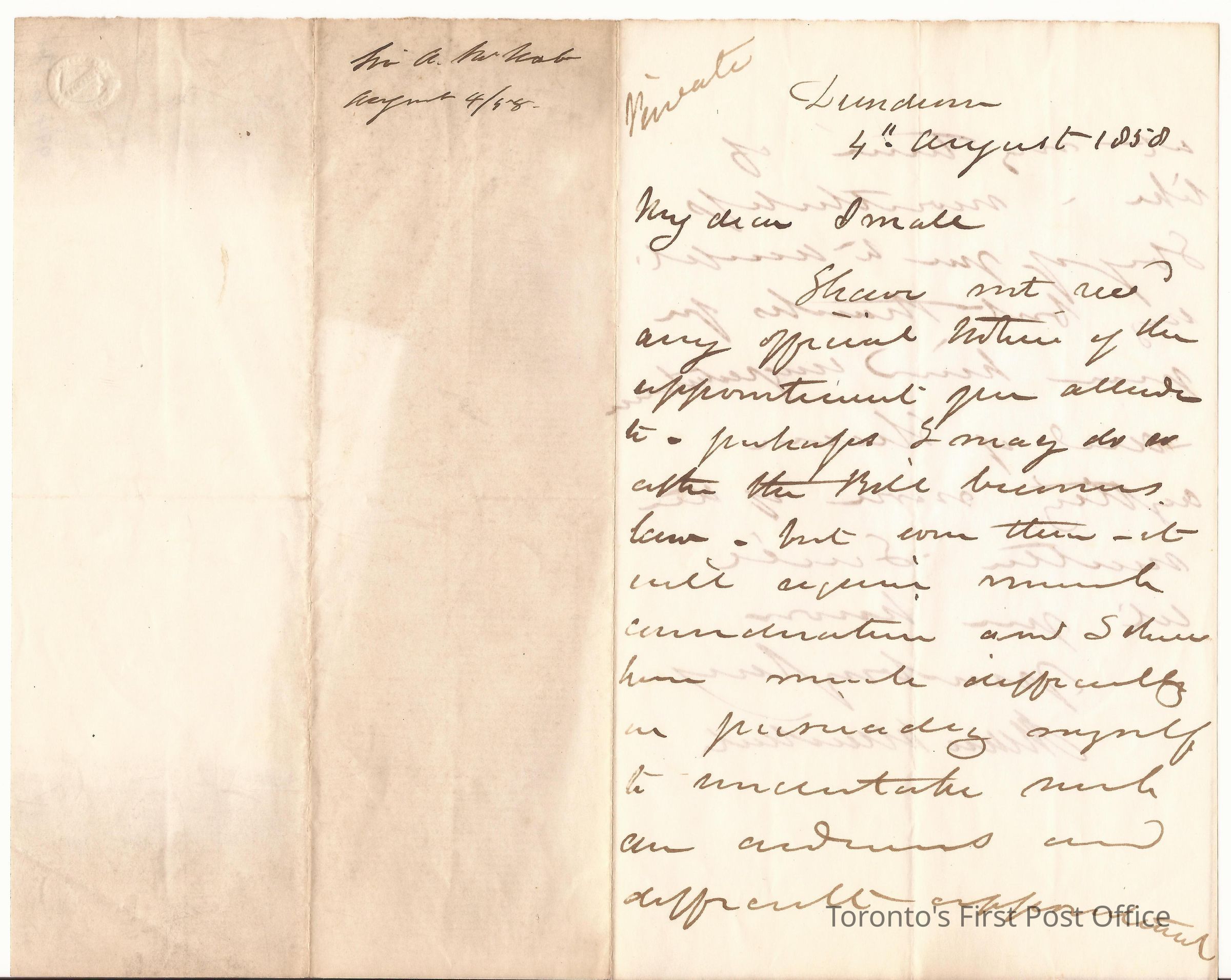 Letter; to Jas. E. Small; dated Dundurn, 4th August 1858; re: McNab has been congratulated for an appointment is he is to receive, but has not heard of it yet, but has his doubts; black ink on laid paper; watermark: "MOINIER'S".Update Date