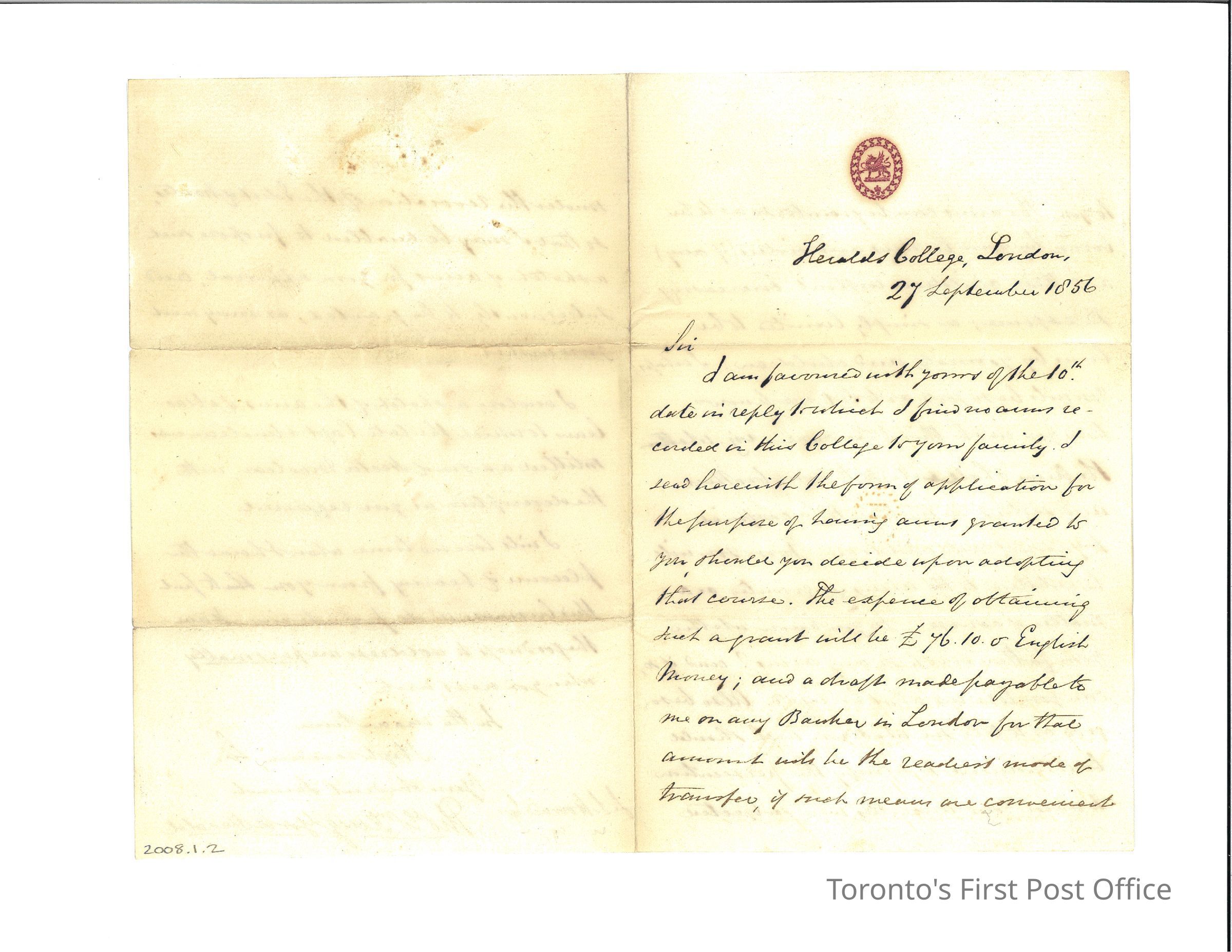 Letter on cream laid paper; dated Heralds College, London, 27 September 1856; black ink manuscript; signed "Thos Wm King, York Herald"; red crest at top of first page of dragon within wreath with a victorian crown; letter regarding James Scott Howard's application for the granting of arms, including information, payment needed to proceed, and who may use the arms when granted; 1 page, folded, three pages of writing.Dimensions