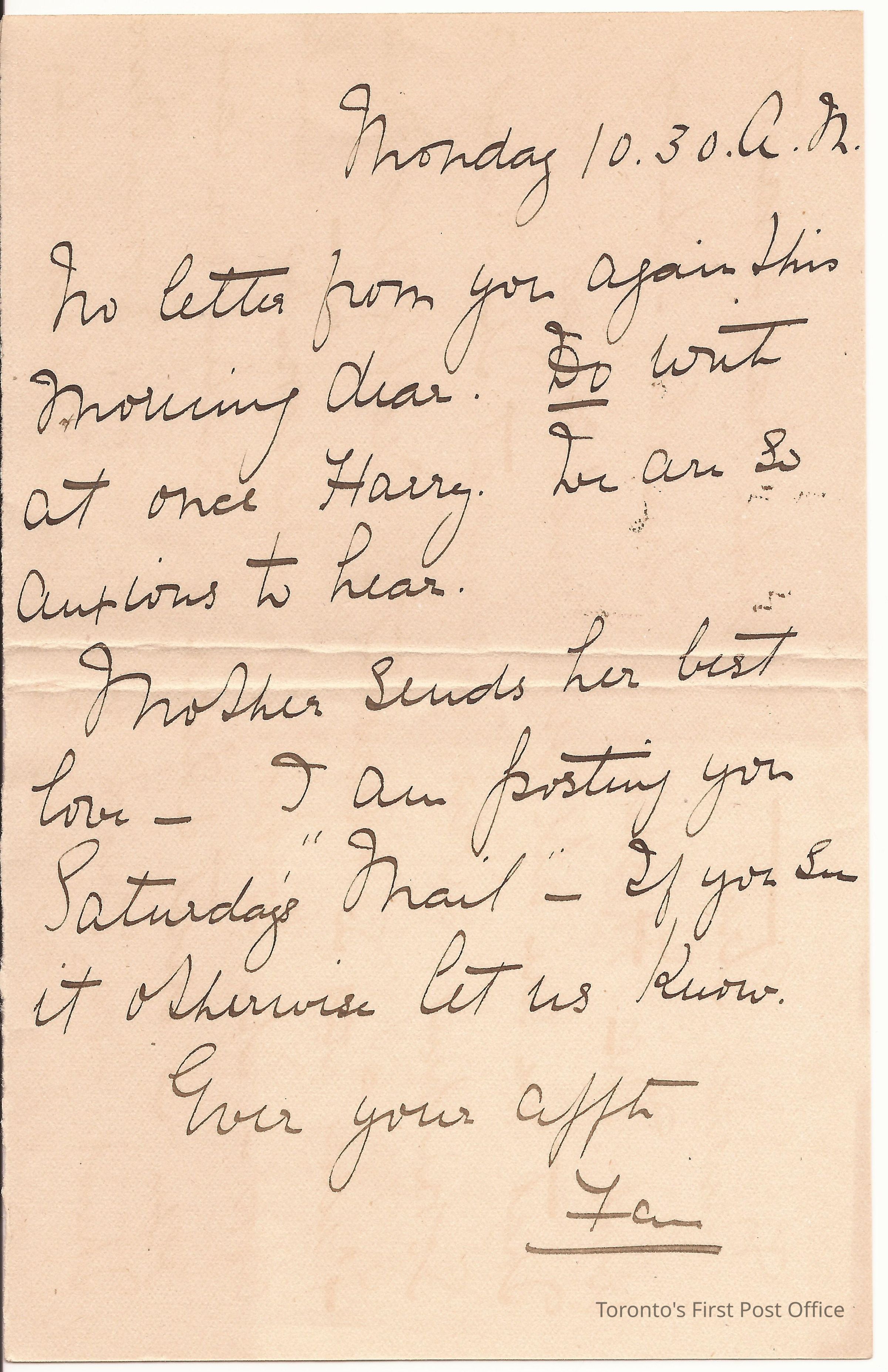 Letter; to Harry; from Fan; re: a reminder for Harry to write; watermark "CHARTA"; dated: Toronto Ontario Canada, 142 Bloor St. W. Monday 10:30 A.M. 1896(?).Dimensions
