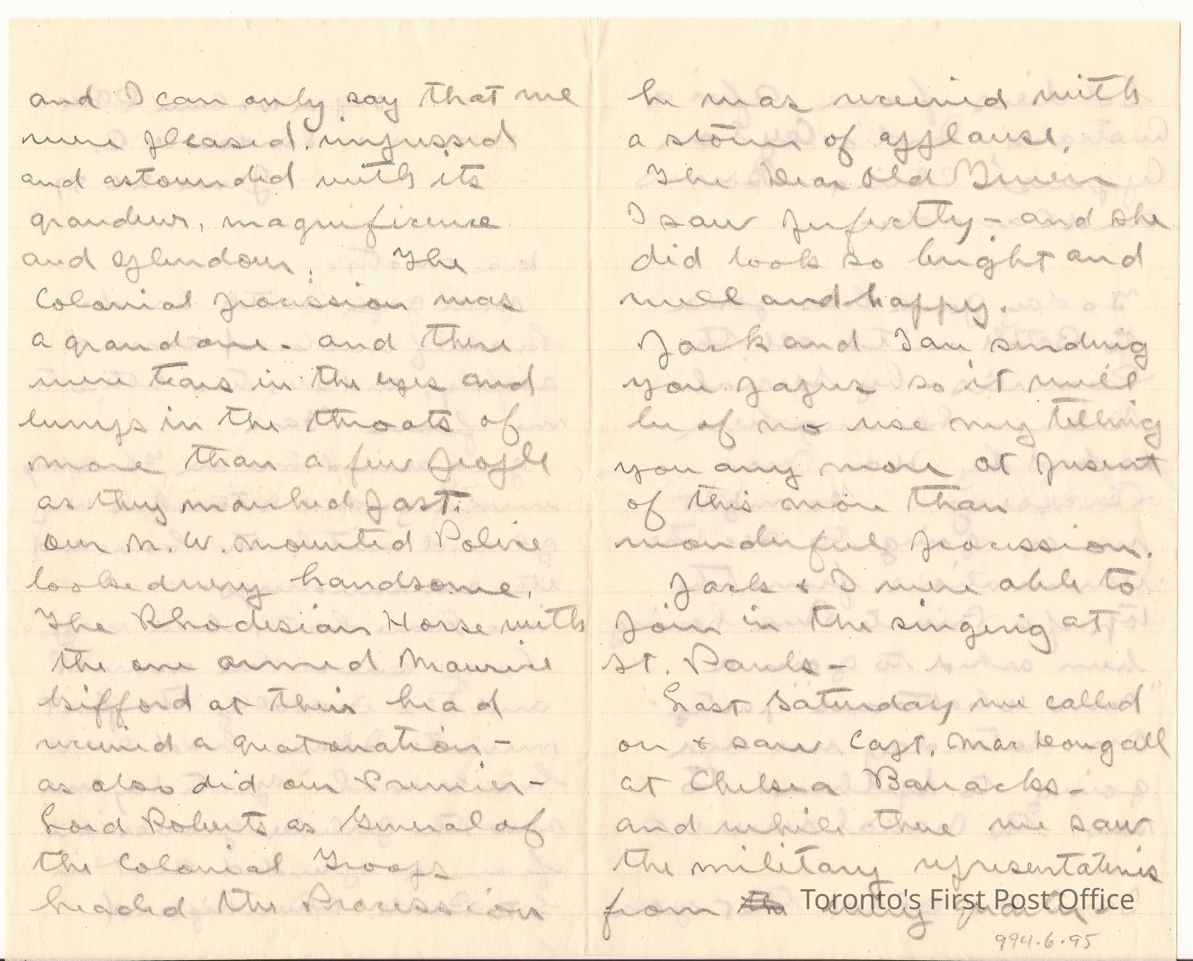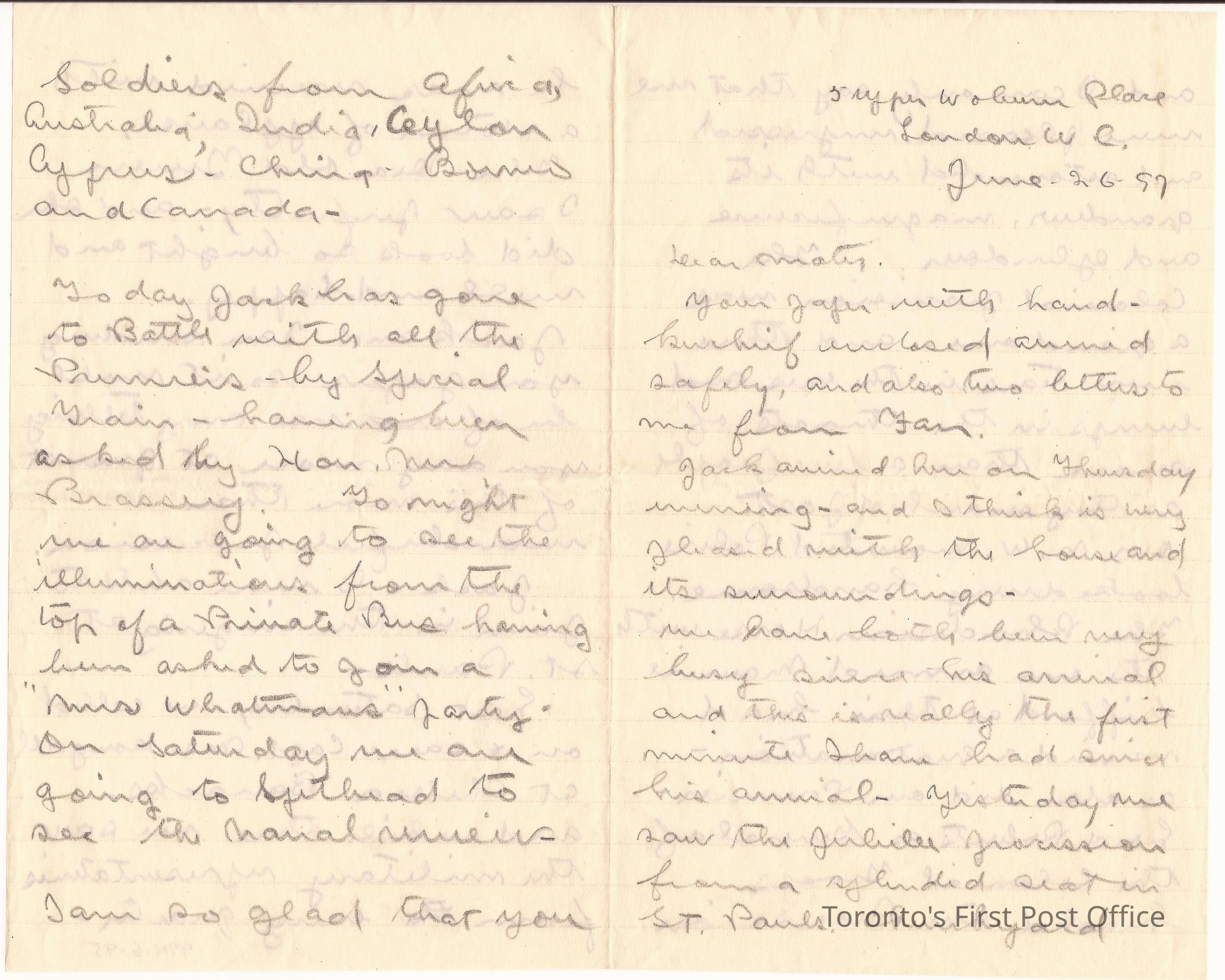 Letter; to Maty(?); from Arthur; watermark: "SILVERBURN LINEN"; pencil; re: personal, Jubilee procession, horses, Queen, N.W. Mounted Police, etc.; dated: 5 Upper Woburn Place London WC June 26 97.Update Date