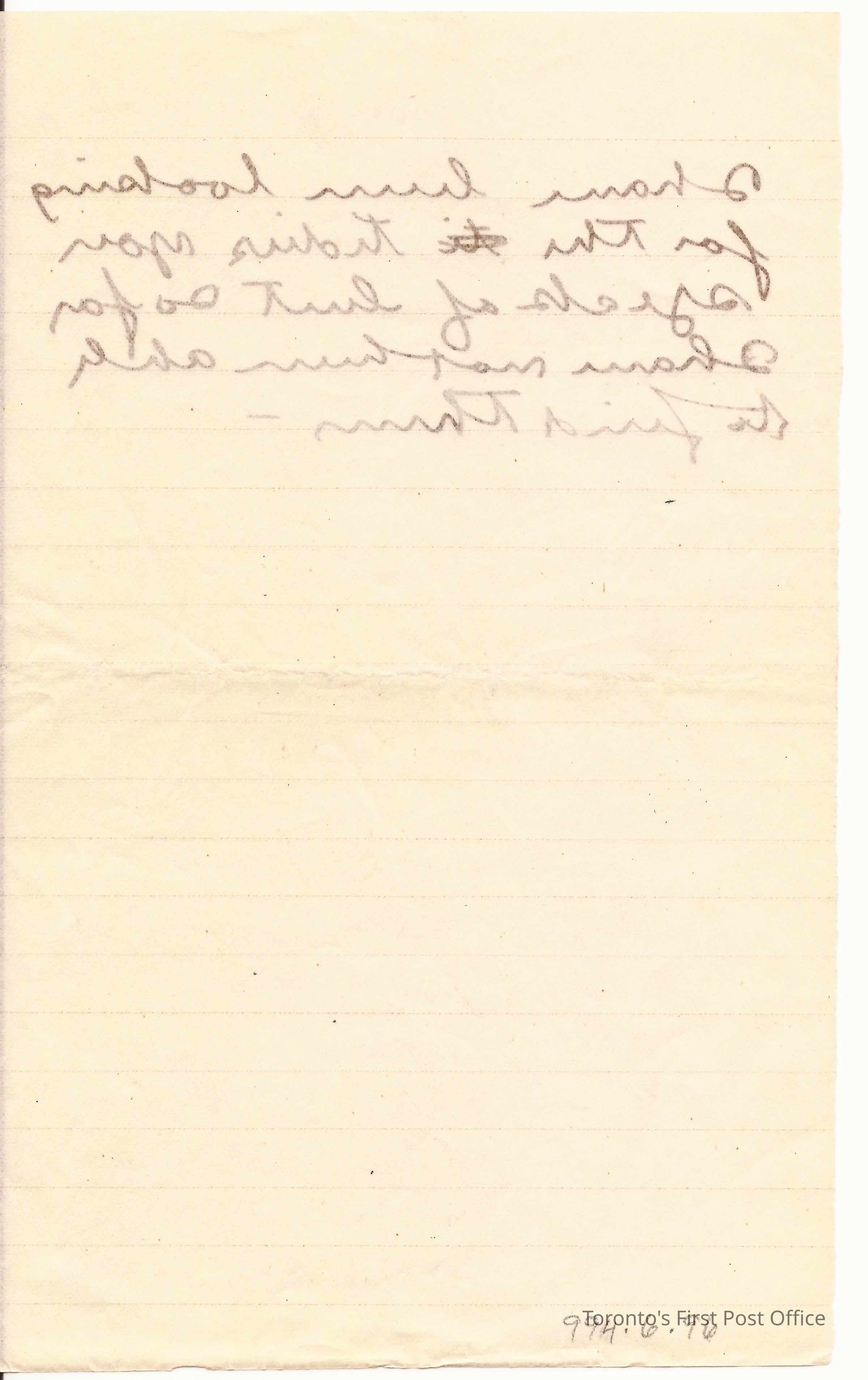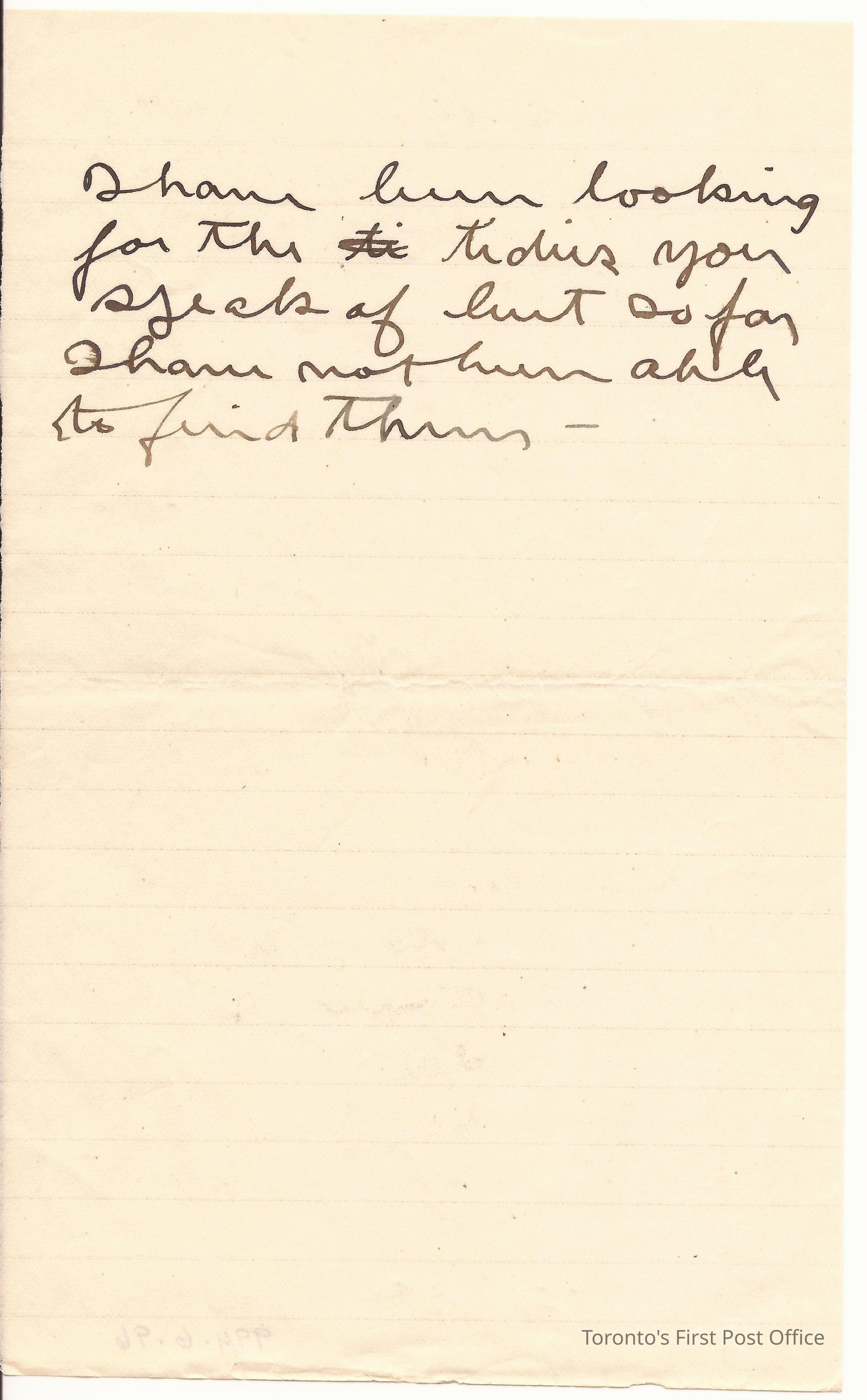 Letter; incomplete; black ink; incomplete watermark; re: writer has not been able to find "tidies"; ruled paper; black ink.Dimensions