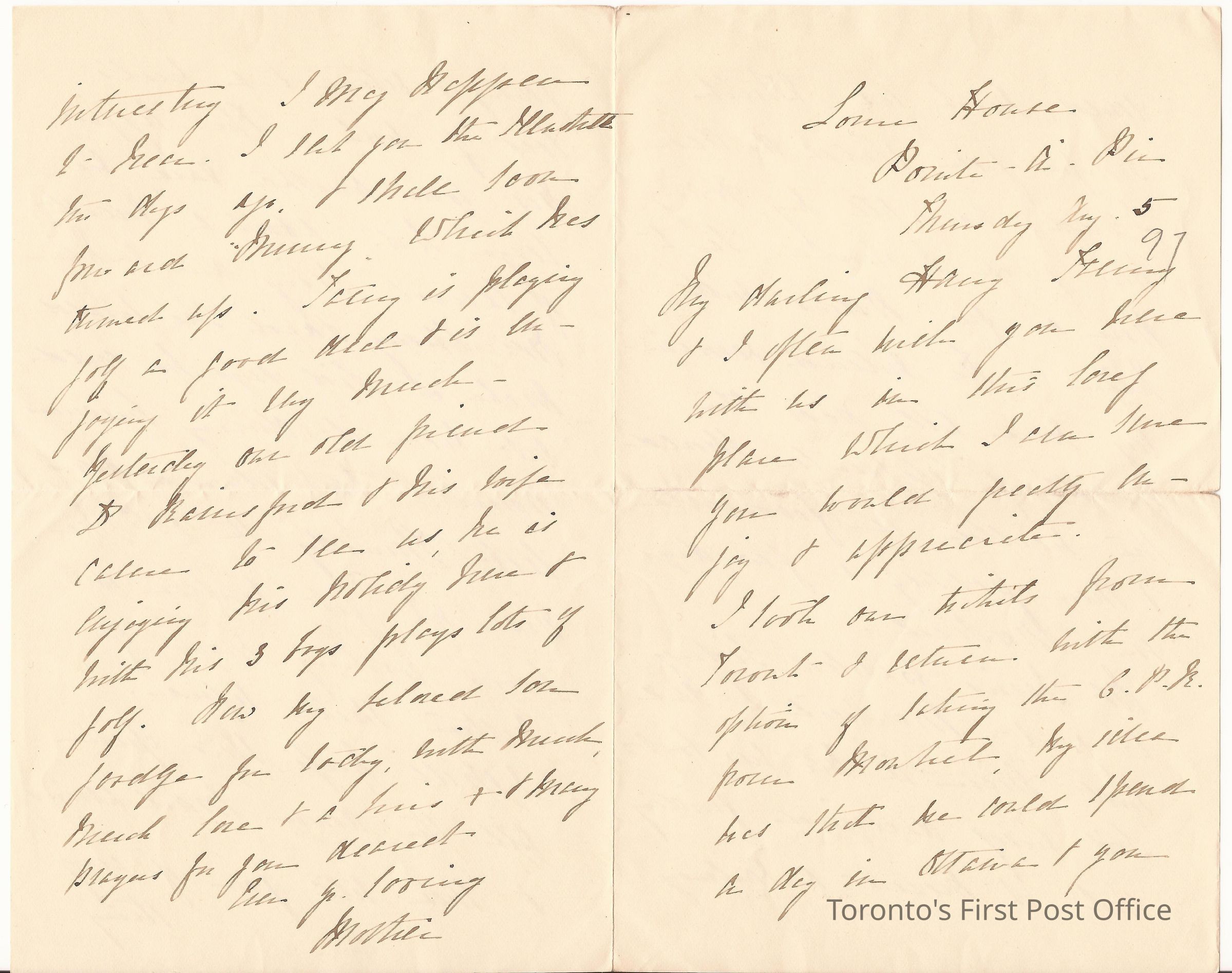 Letter; to Harry; from Mother; re: Fanny's and Mother's holiday at Louie House with lots of golf, CPR itinerary, meeting of friends; dated Louie House Pointe-a-Pic Thursday Aug 5 97; black ink on heavy paper.Dimensions