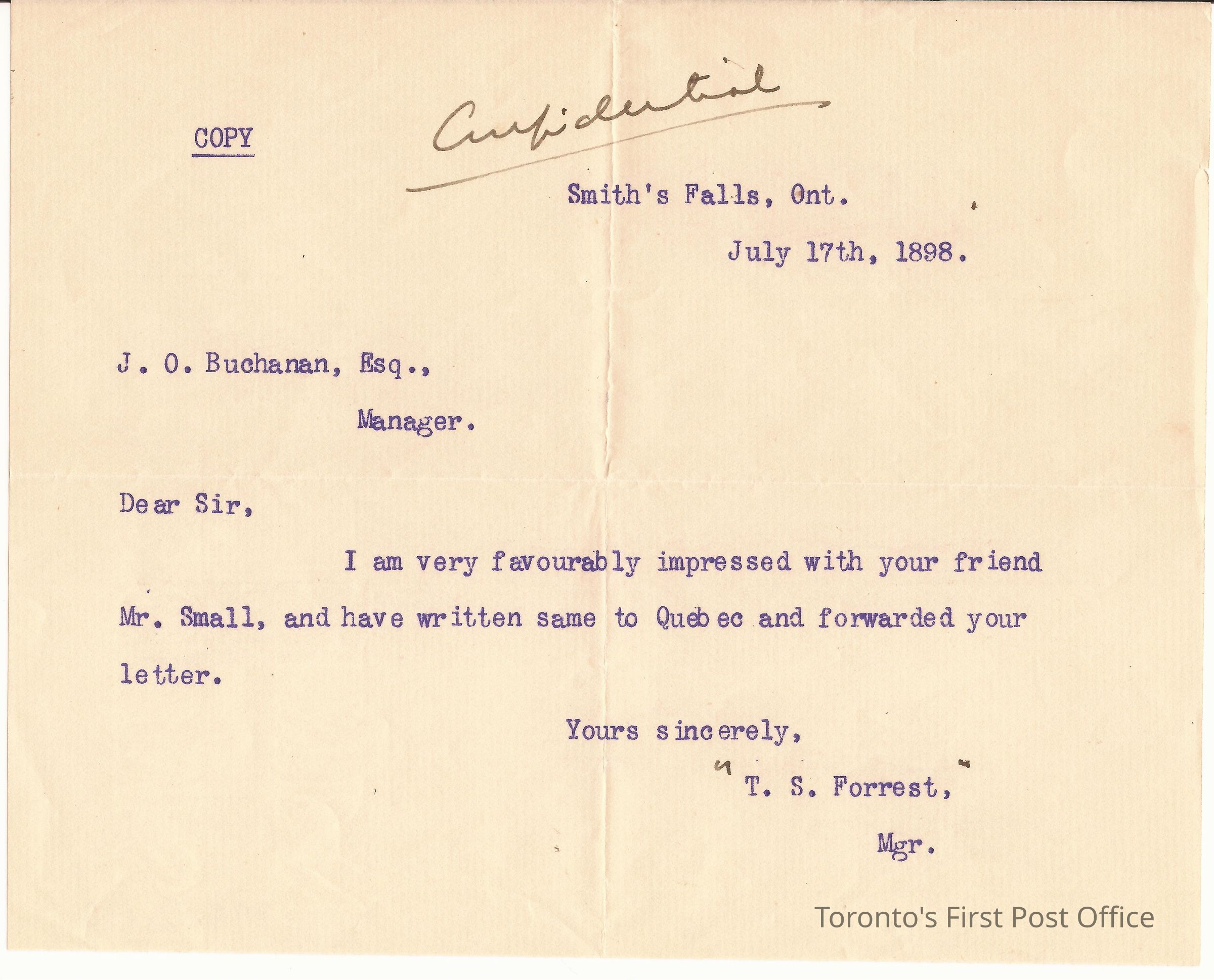 Letter; from T.S. Forest, Mrs.; to J.O. Buchanan, Esq., Manager; re: Forest is impressed with Mr. Small and forwarded J.O. Buchanan's letter to headquarters in Quebec; marked "Copy", "Confidential"; laid paper; half page only; watermark: "TECUMSE LINEN" incomplete.Dimensions