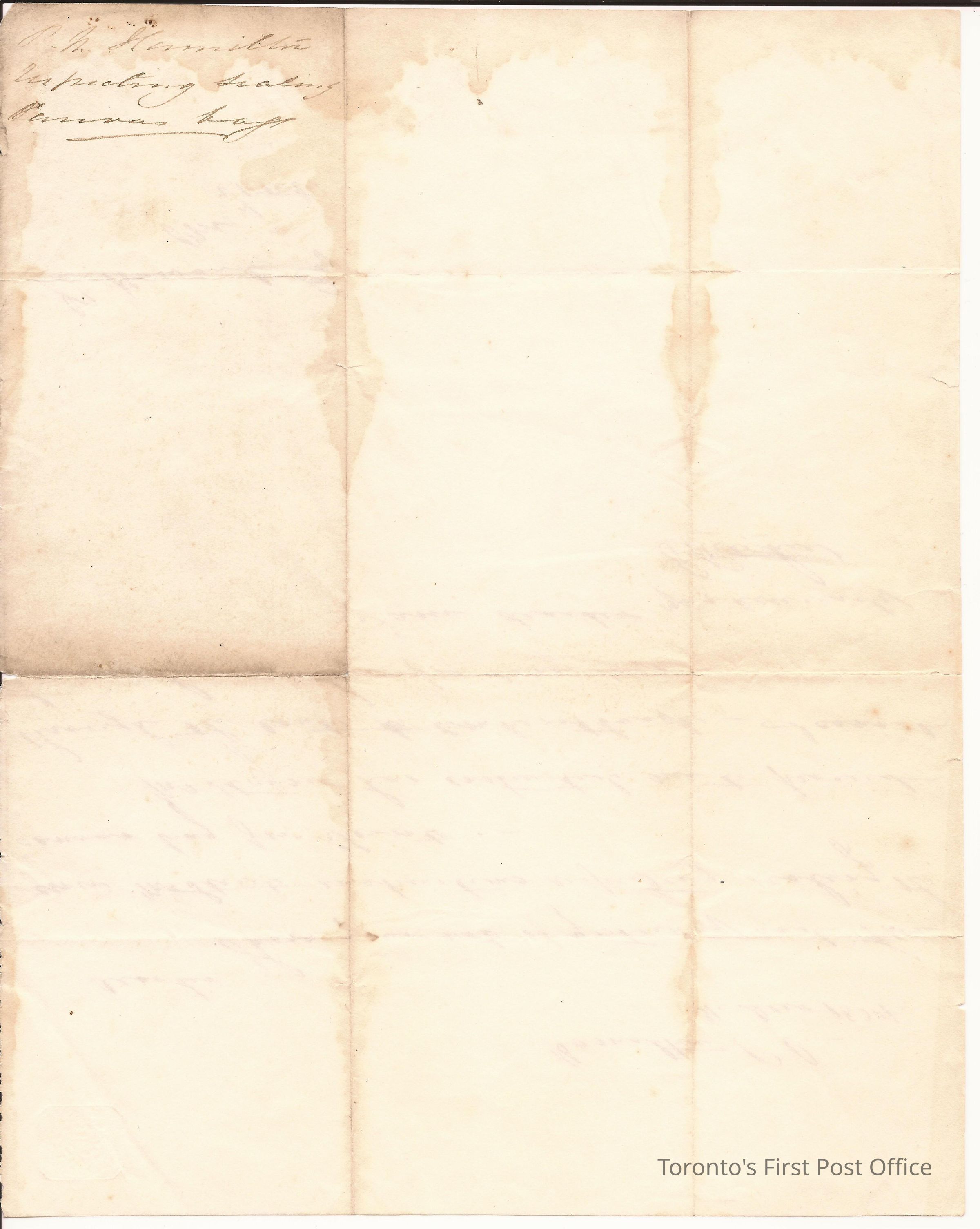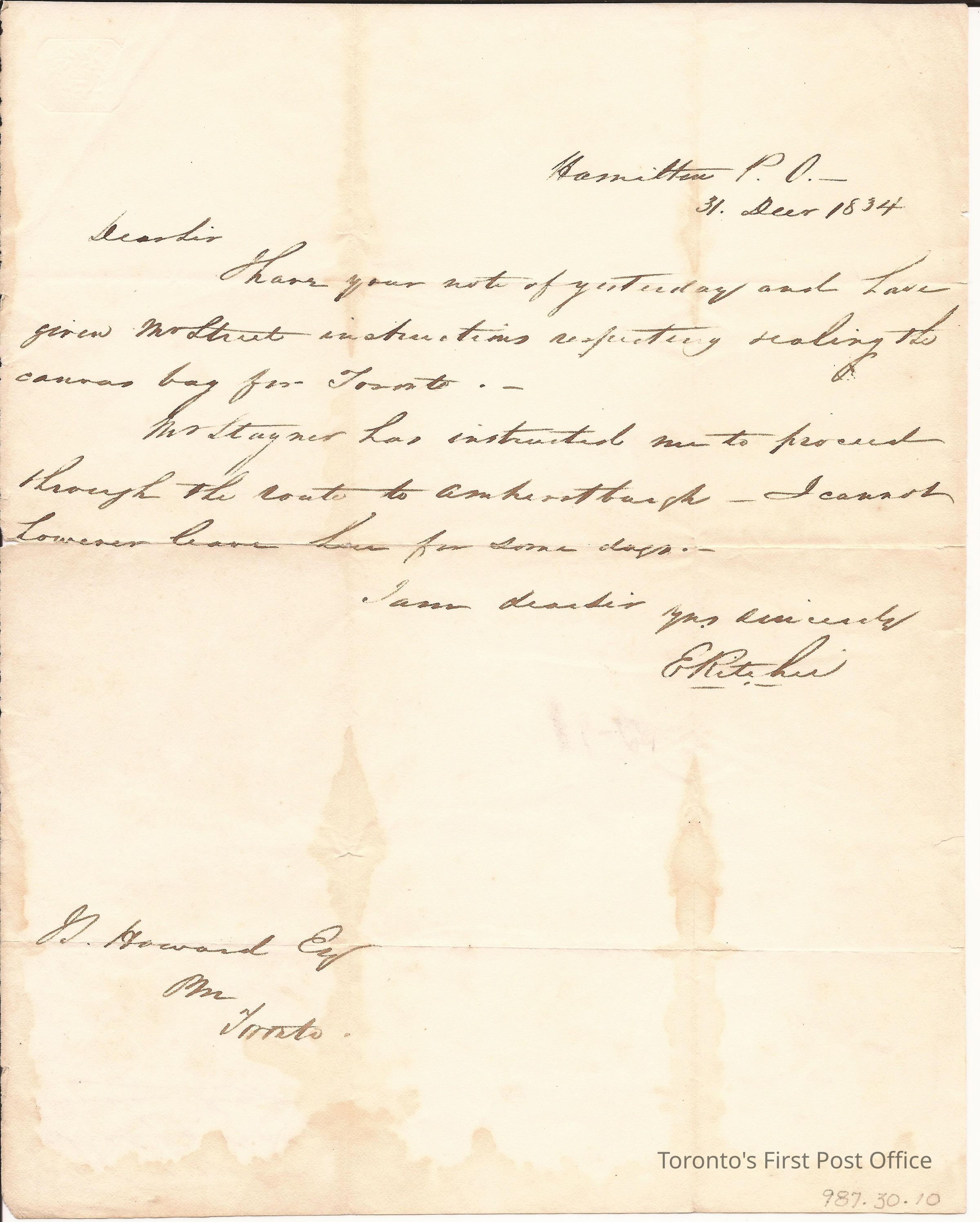 Letter from E. Ritchie, Postmaster, Hamilton, to J.S. Howard, Postmaster, Toronto; on light brown paper; no postmarks or address; dated: 31 Dec 1834; indented emblem in upper left corner.Dimensions