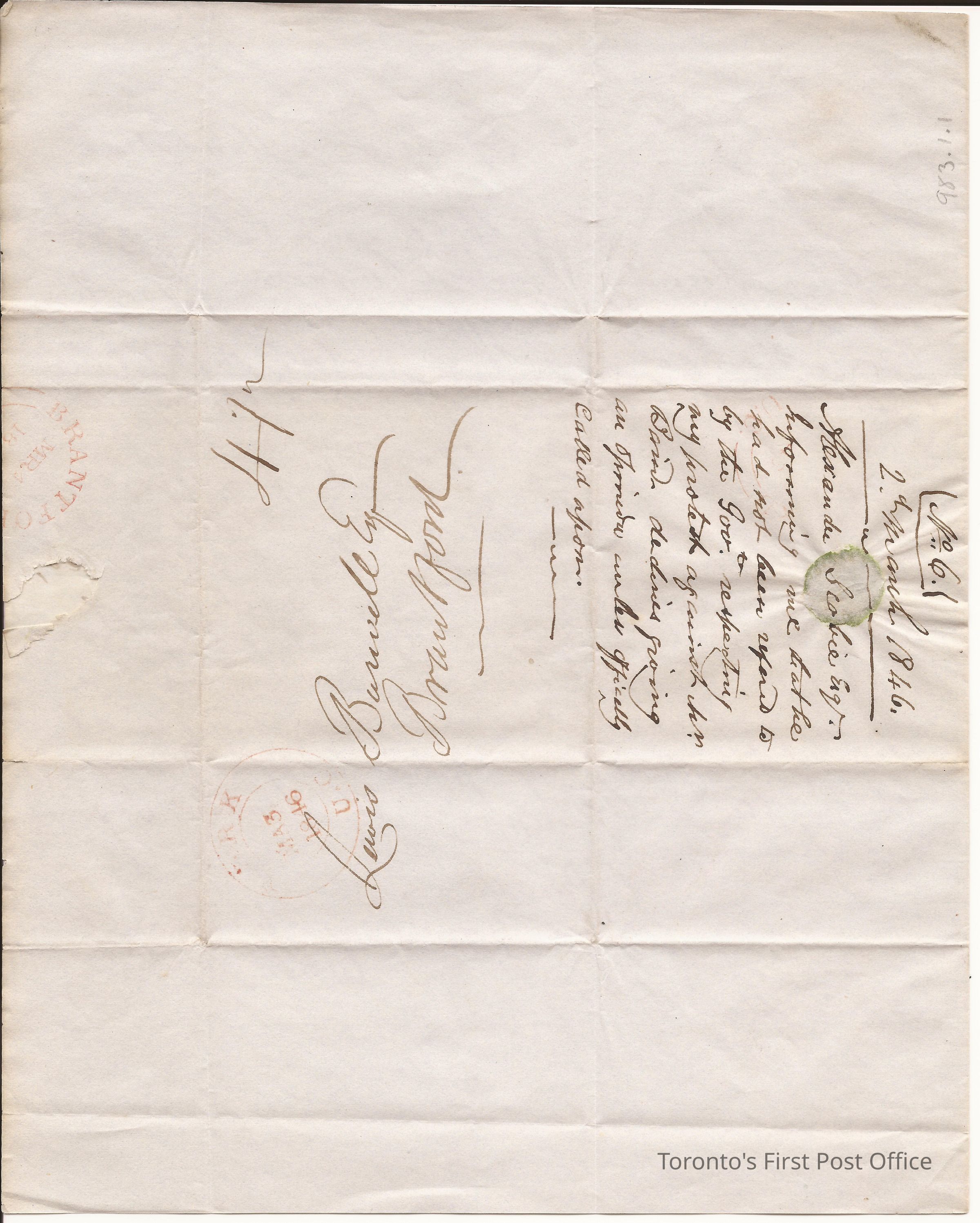 Black ink; pastel green paper with blue ruled lines; written on half a page; green wafer seal; addressed to Lewis Burwell, Brantford; from Alex Scobie, York; dated: March 2, 1846; A. Scobie does not feel he should express opinion of Charles Bain of Seneca living in a state of adultery with a female; two date stamps (York and Toronto).Dimensions
