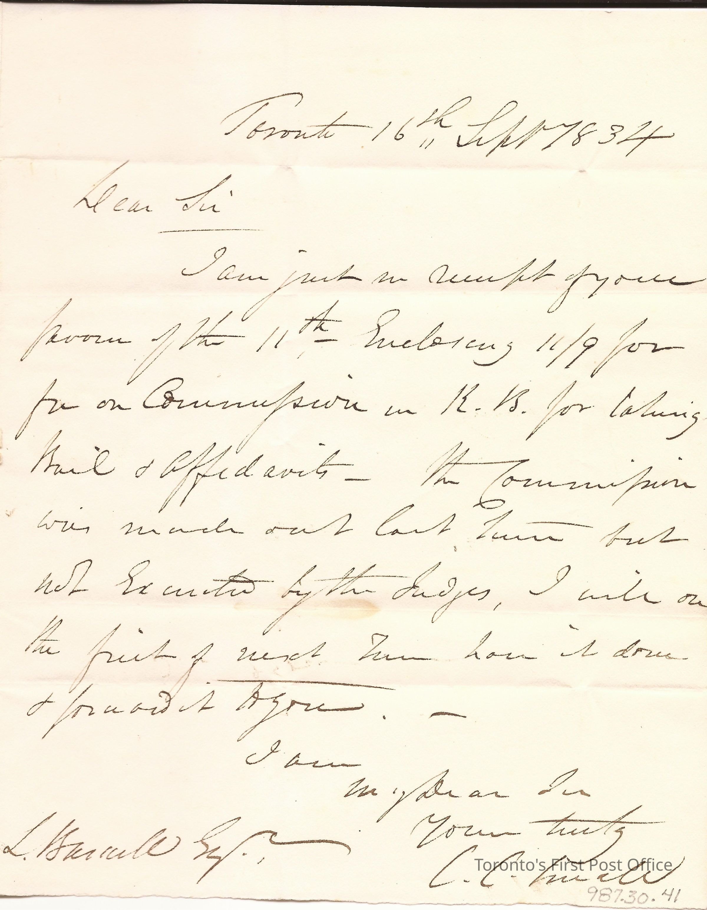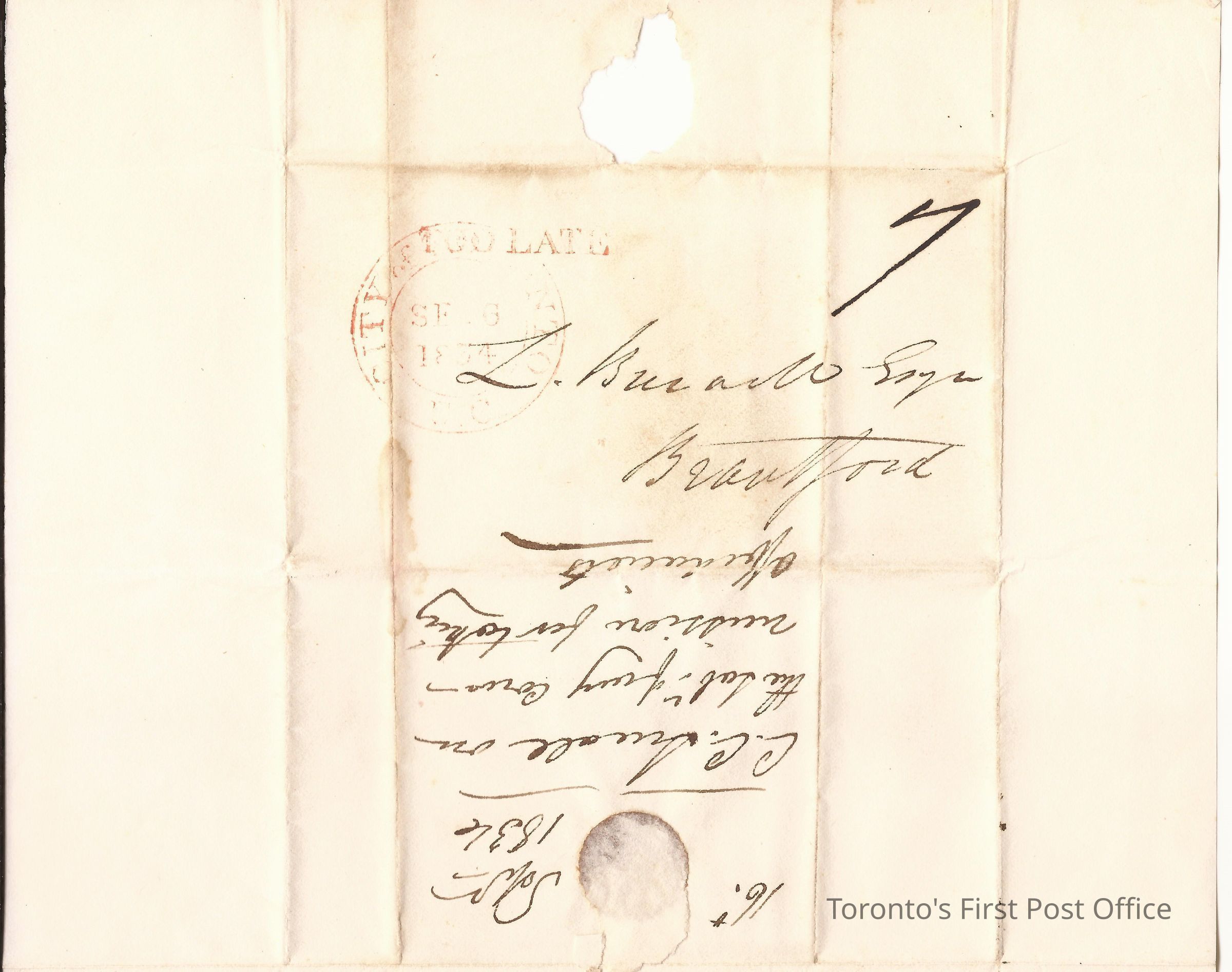 Letter from Charles Coxwell Small; Toronto Commissioner of Court of Common Pleas; to Lewis Burwell, Brantford; dated: Toronto 16th Sept 1834; postmarks: "CITY OF TORONTO SE 6 1834 U.C.", "TOO LATE"; red wafer seal; re: payment of commission for taking bail and affidavits.Update Date