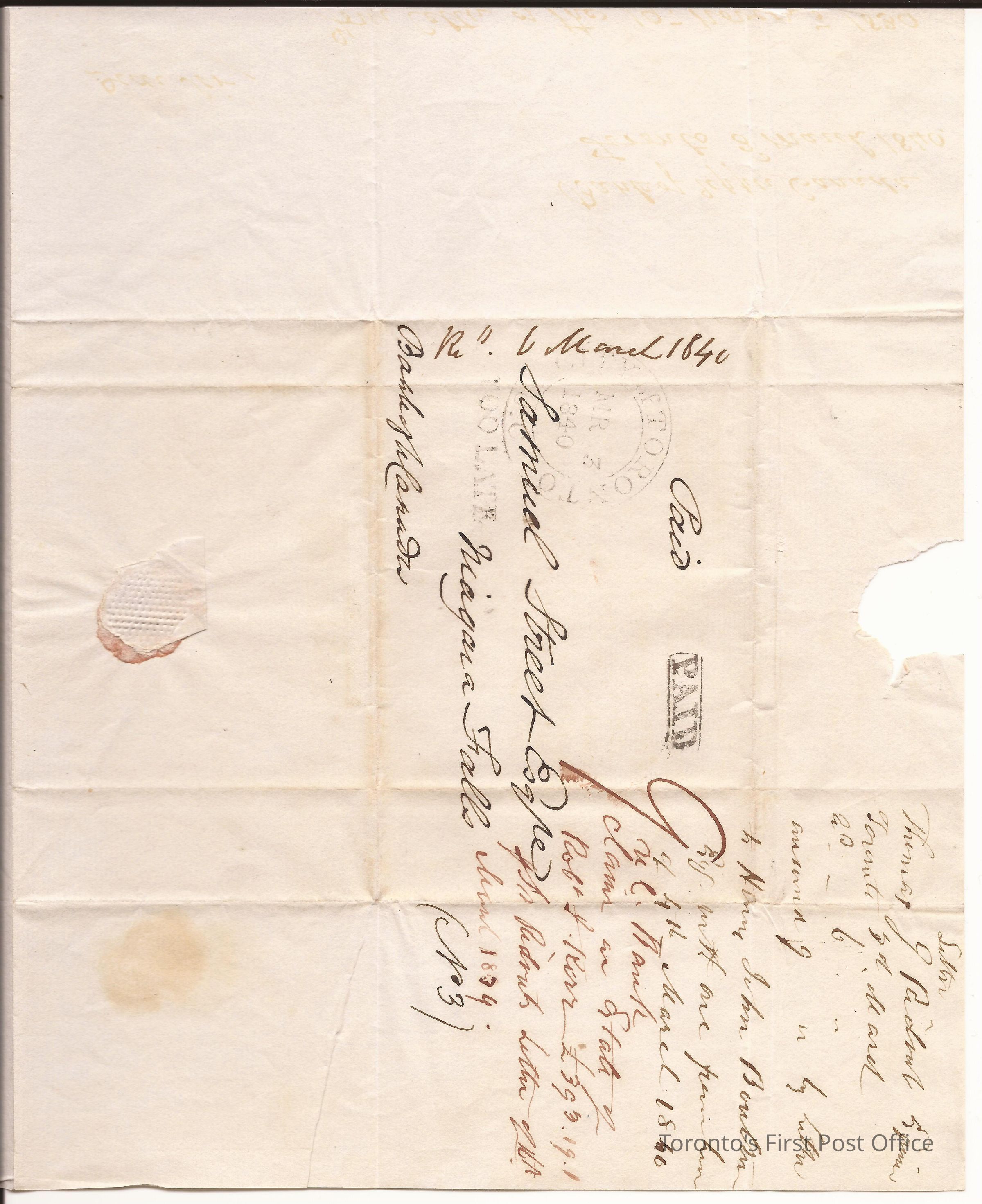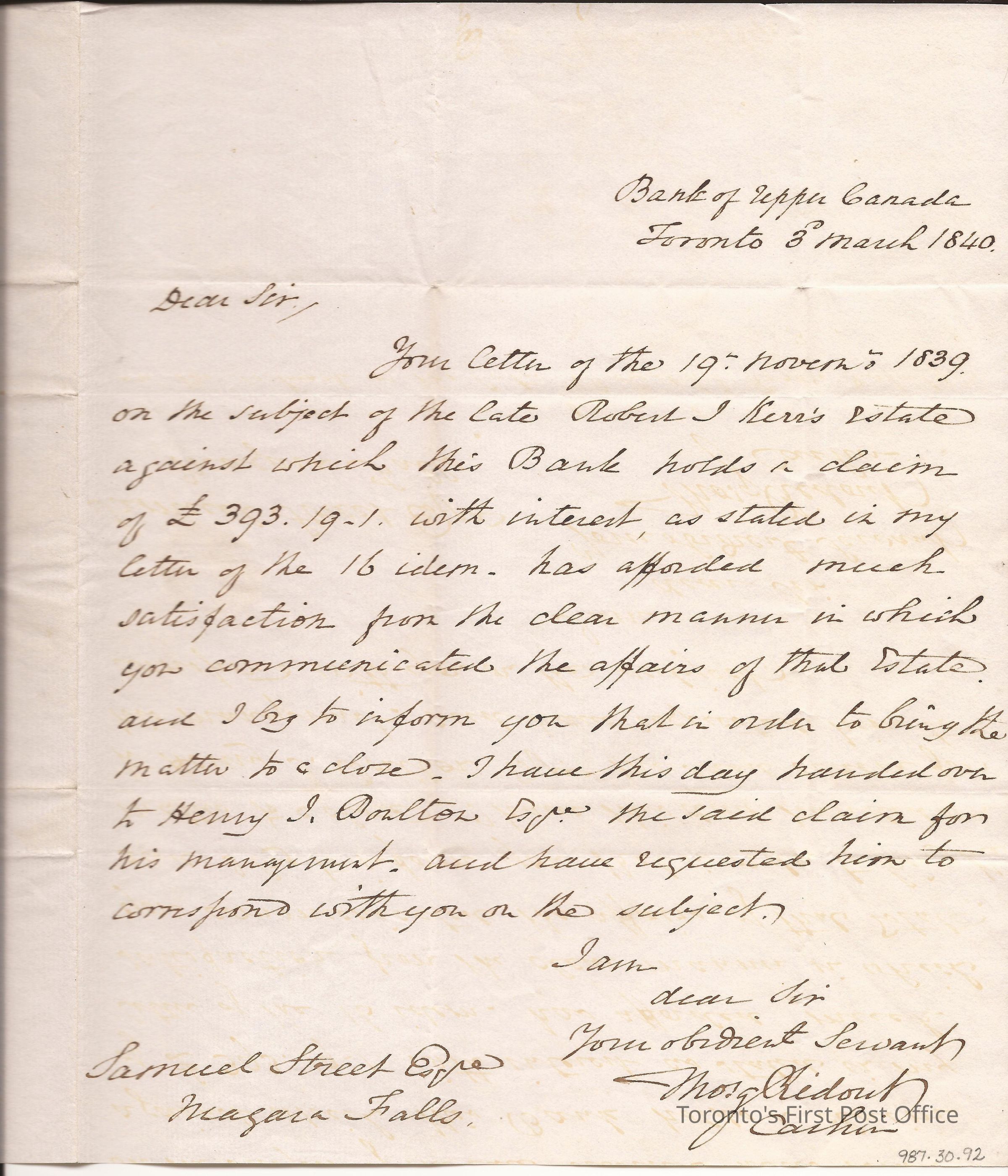 Letter to Samuel Street Esq. Niagara Falls; from Thos. G. Ridout Cashier; dated: Bank of Upper Canada Toronto 3 March 1840; re: Estate of Robert I Kerr bank's claim of £393.19.1 and handed over to Henry I Baulton Esq. from now on; postmarks: 1. black double circle "CITY OF TORONTO MR 3 1840", 2. black stamp "TOO LATE", 3. black stamp: "PAID"; postage: red manuscript "9"; unbleached, laid paper; black and red ink; watermark: crown emblem and initials "JMC".Update Date