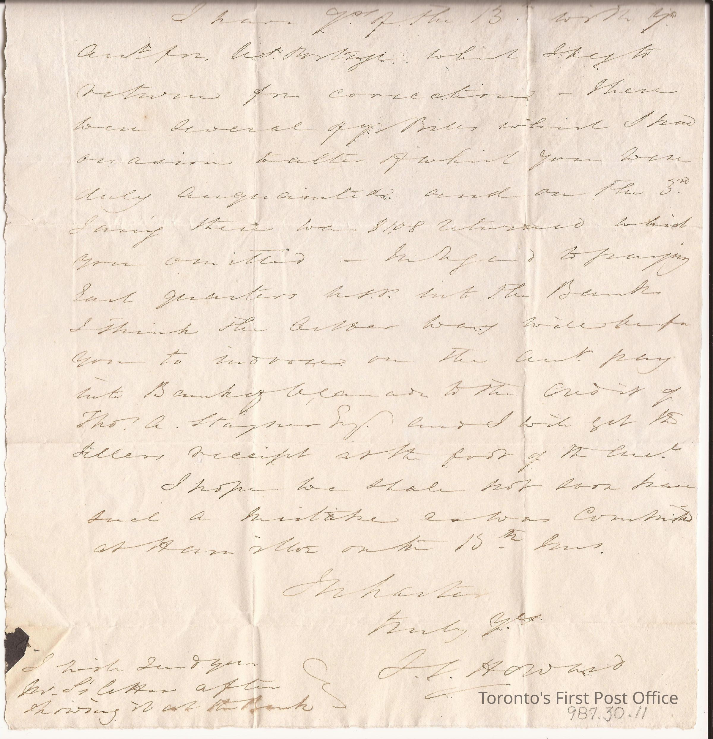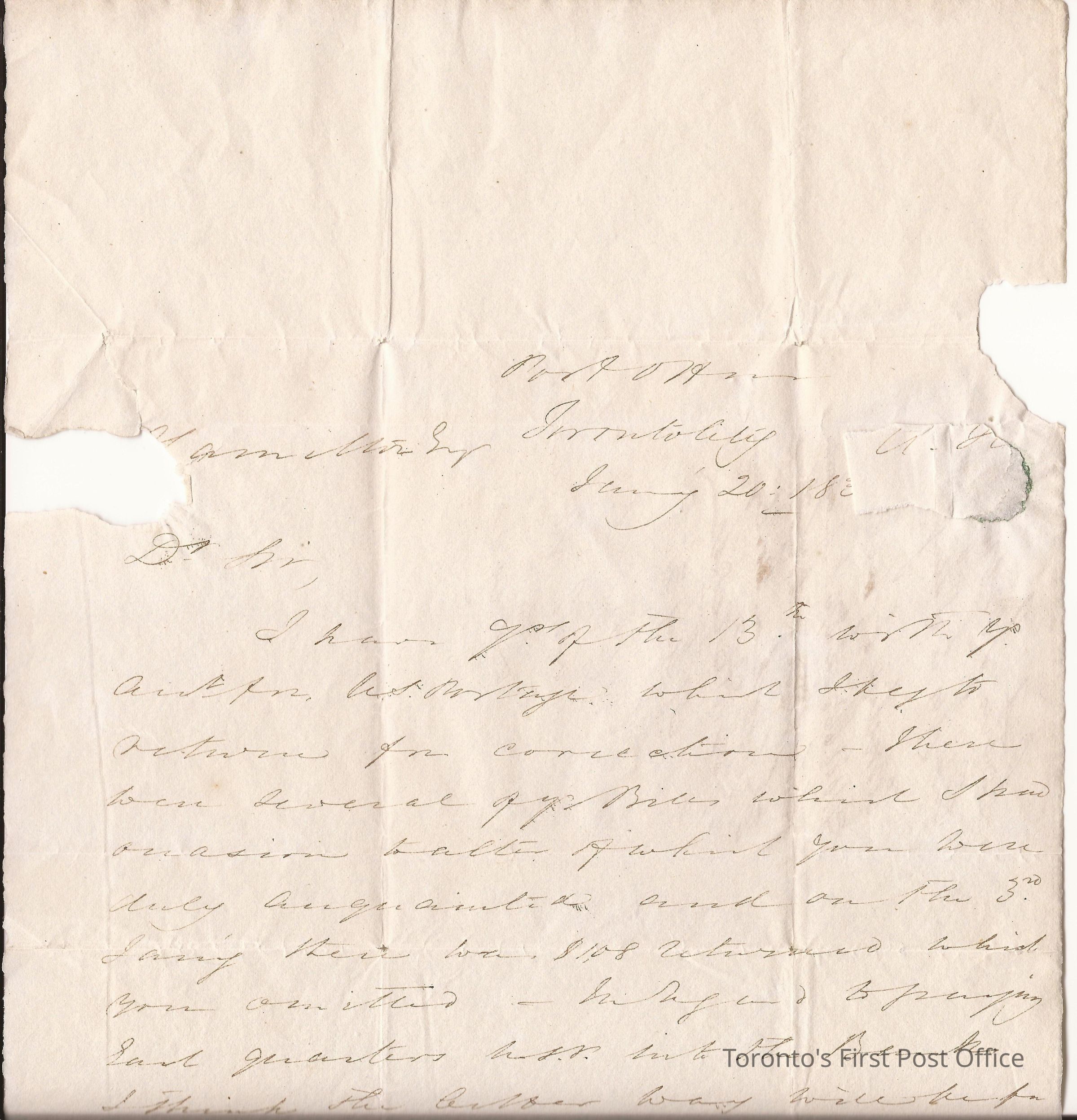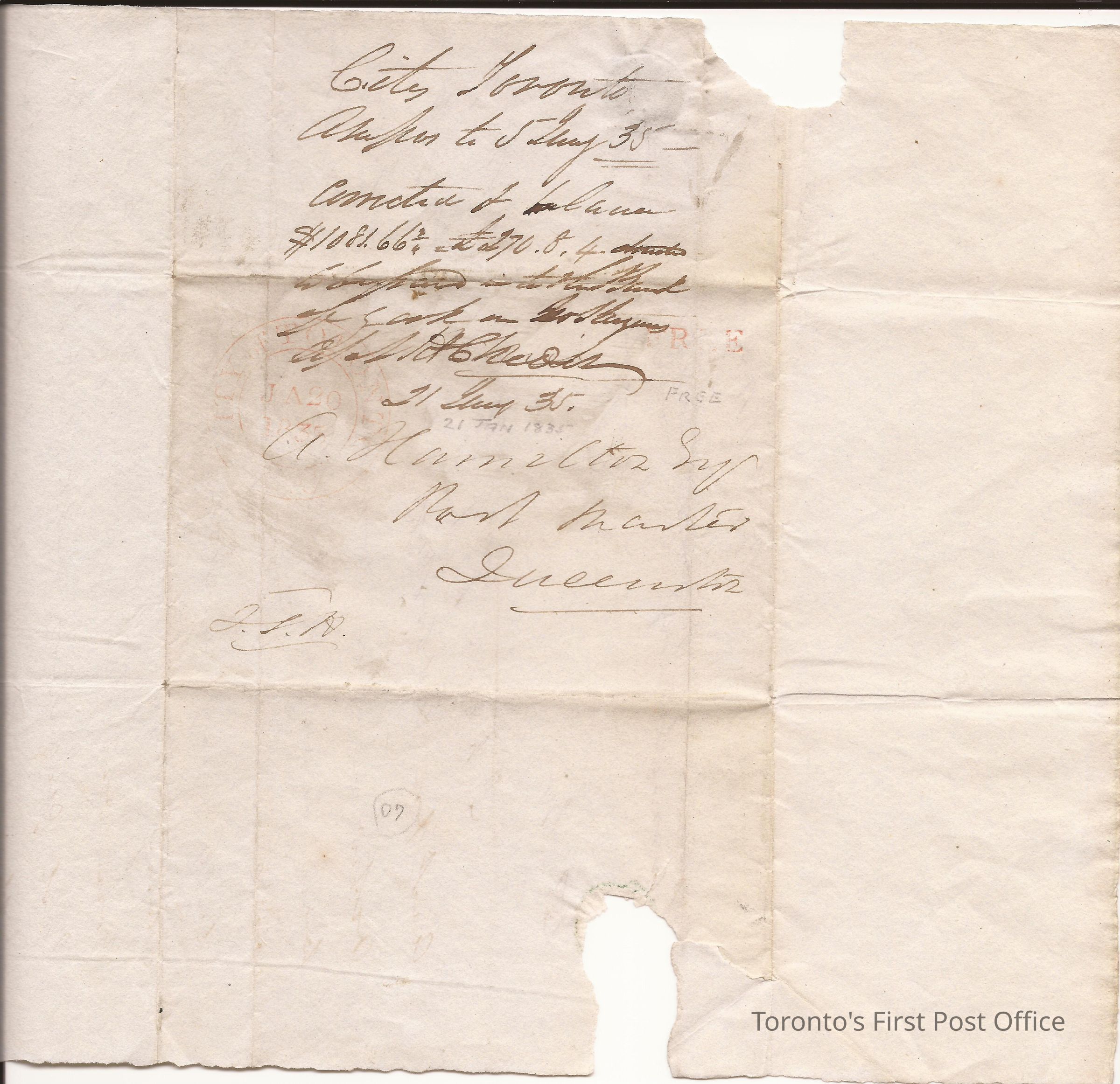 Letter from J.S. Howard, Postmaster, Toronto, to A. Hamilton Esq., Postmaster, Queenston; 20 January 1835; long, light-blue paper with seal; postmarks: "Ja 20 City of Toronto", "FREE" in red ink.Update Date