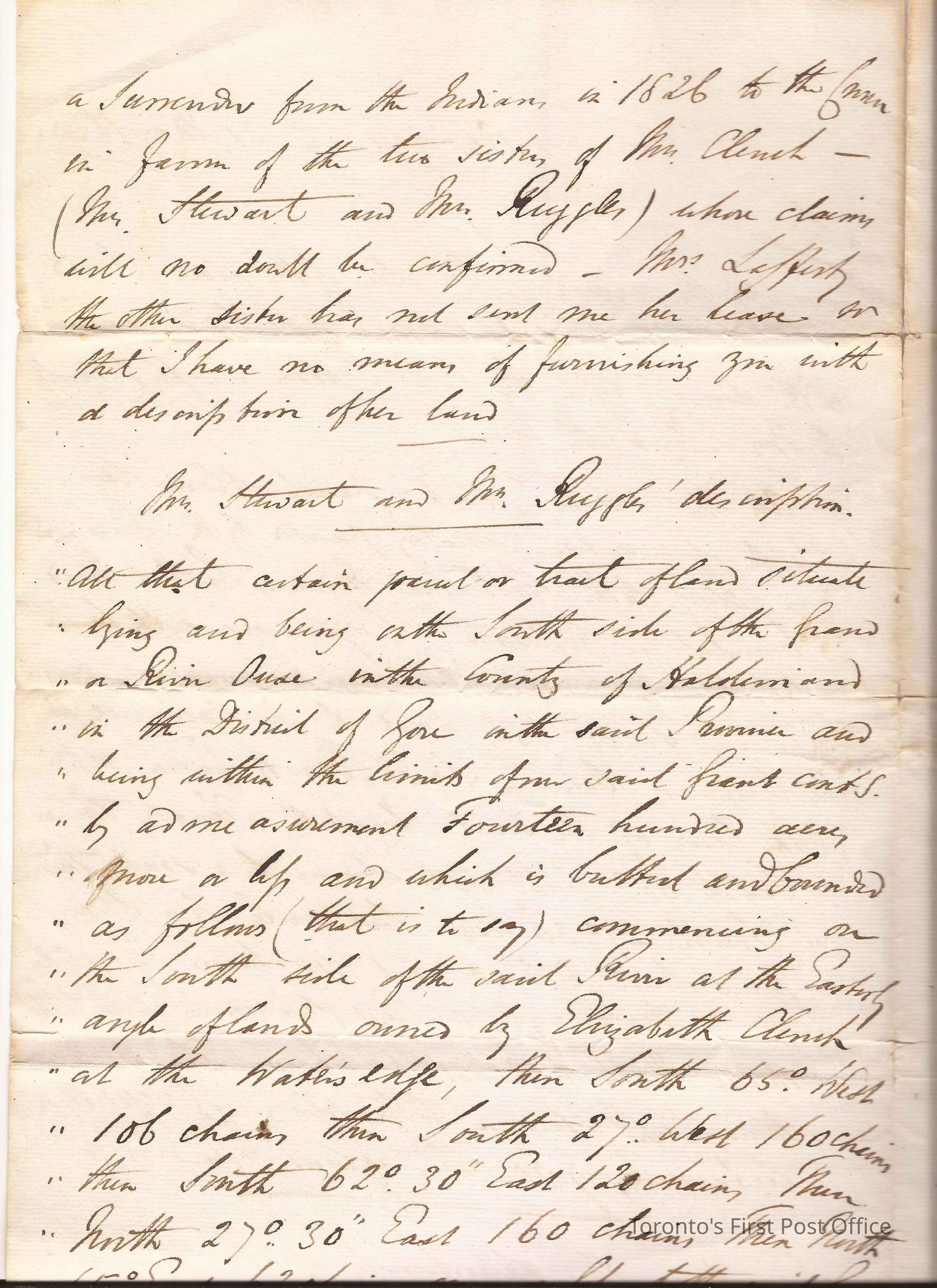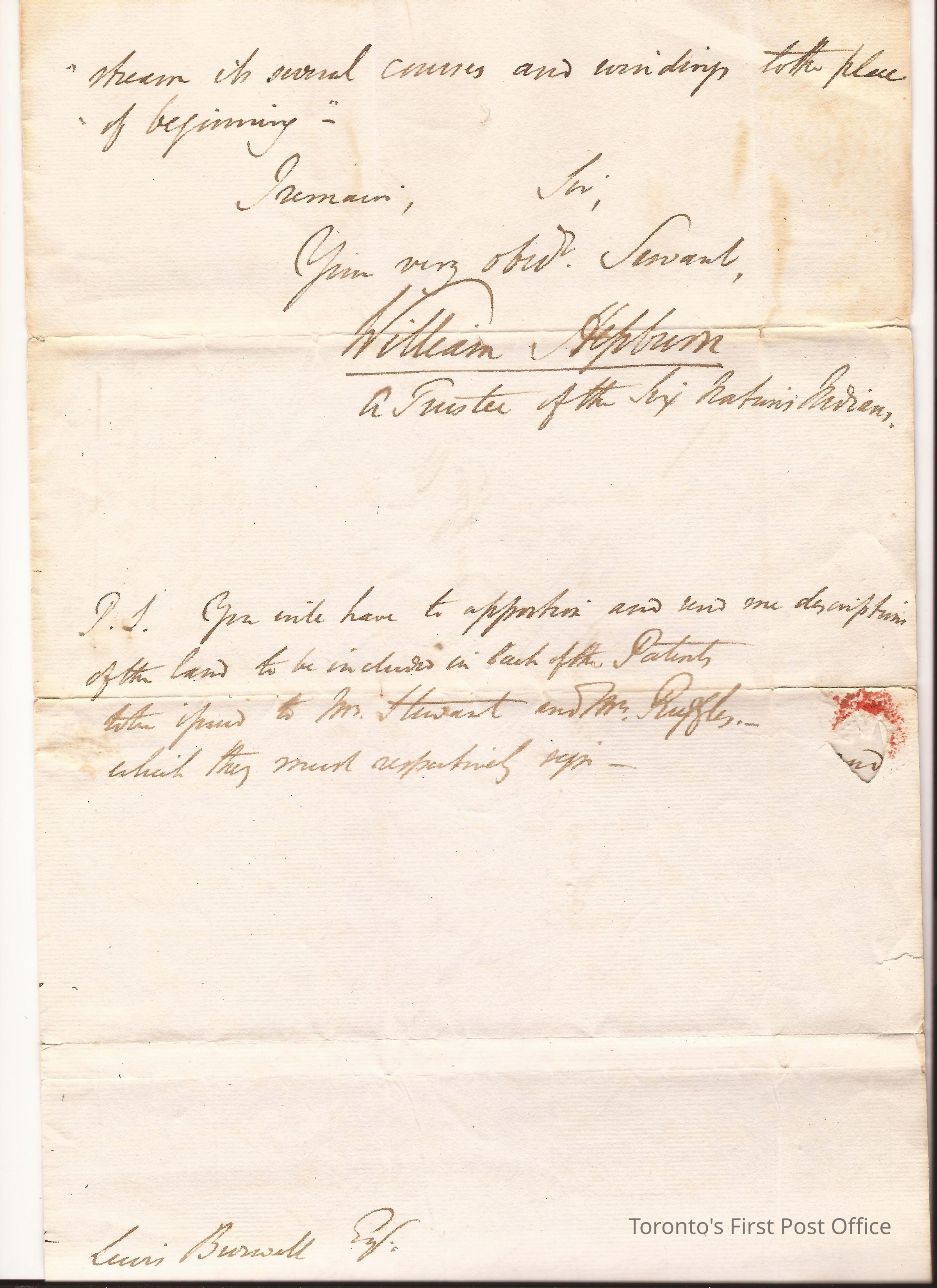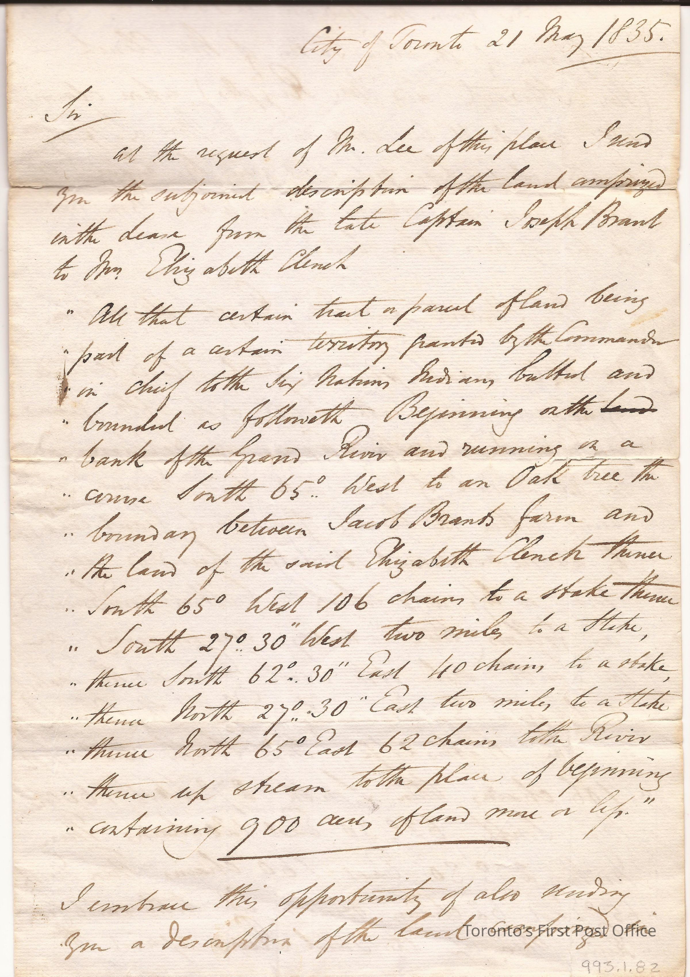 Letter and cover; from William Hepburn, "Acting Trustee of the Six Nations Indians"; to Lewis Burwell Deputy Provincial Surveyor at Brantford; dated: 21 May 1835; marks: red "CITY OF TORONTO", "MY 21 1835"; rated "7"; 4 pp.; watermark: "W & F Fincher 1826"; red wafer seal; re: description of land leased by Mrs. Elizabeth Cleuch from the late Captain Joseph Brant.Update Date