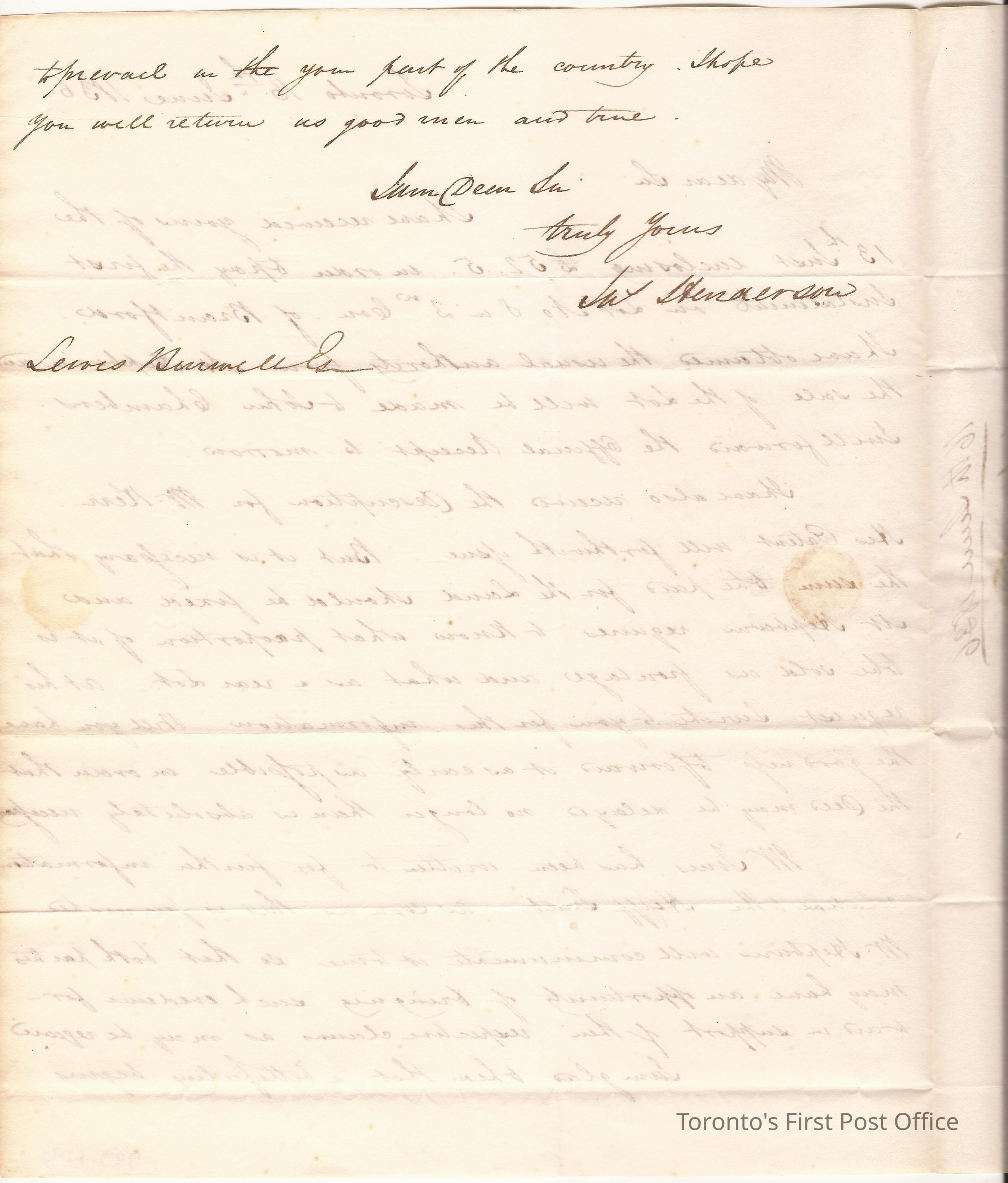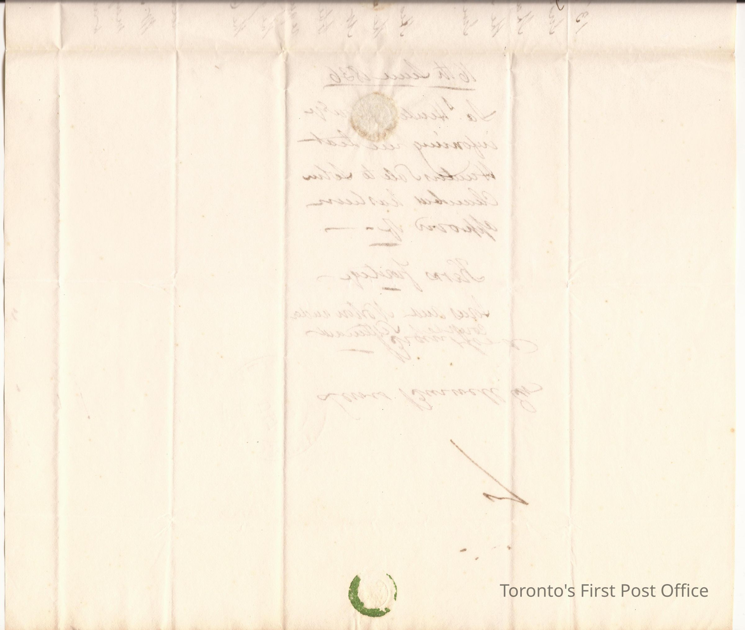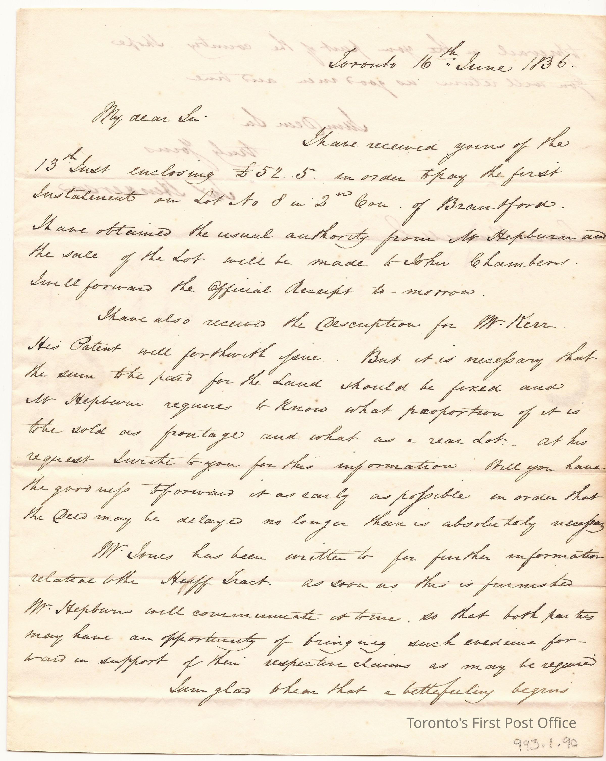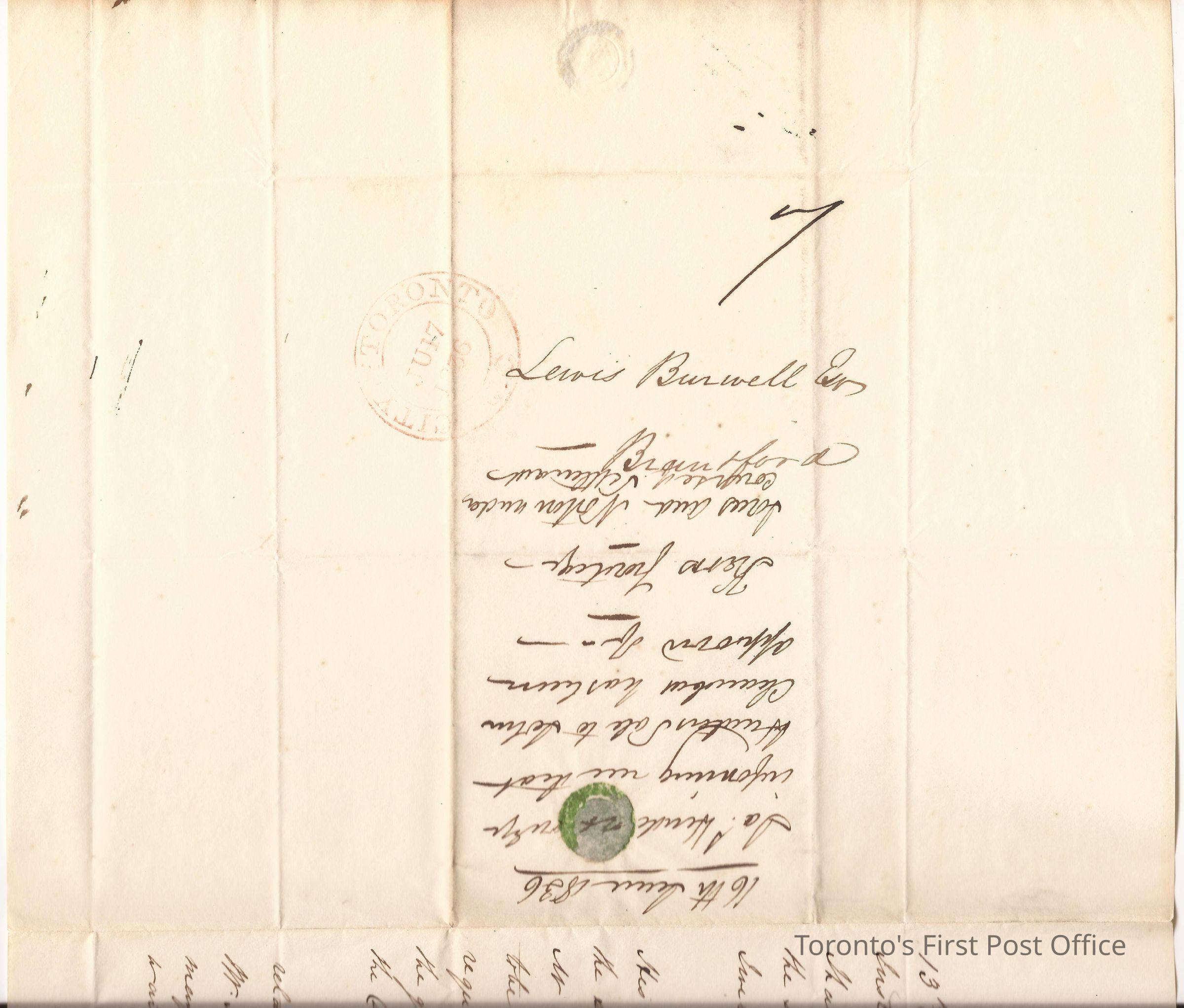 Letter and cover; from James Henderson, Commissioner of Crown Lands Office; to Lewis Burwell, Deputy Surveyor at Brantford; dated: 16 JUNE 1836; marks: red "CITY OF TORONTO", "JU 17 1836"; rated "7"; 3 pp.; green wafer seal; watermark: "J&J TOWN TURKEY MILL 1834"; re: 1st installment on Lot 8 2nd Con. of Brantford, purchase of land by Mr. Ker for description of lot, how much frontage and how much rear, further information re Hanff Tract.Update Date