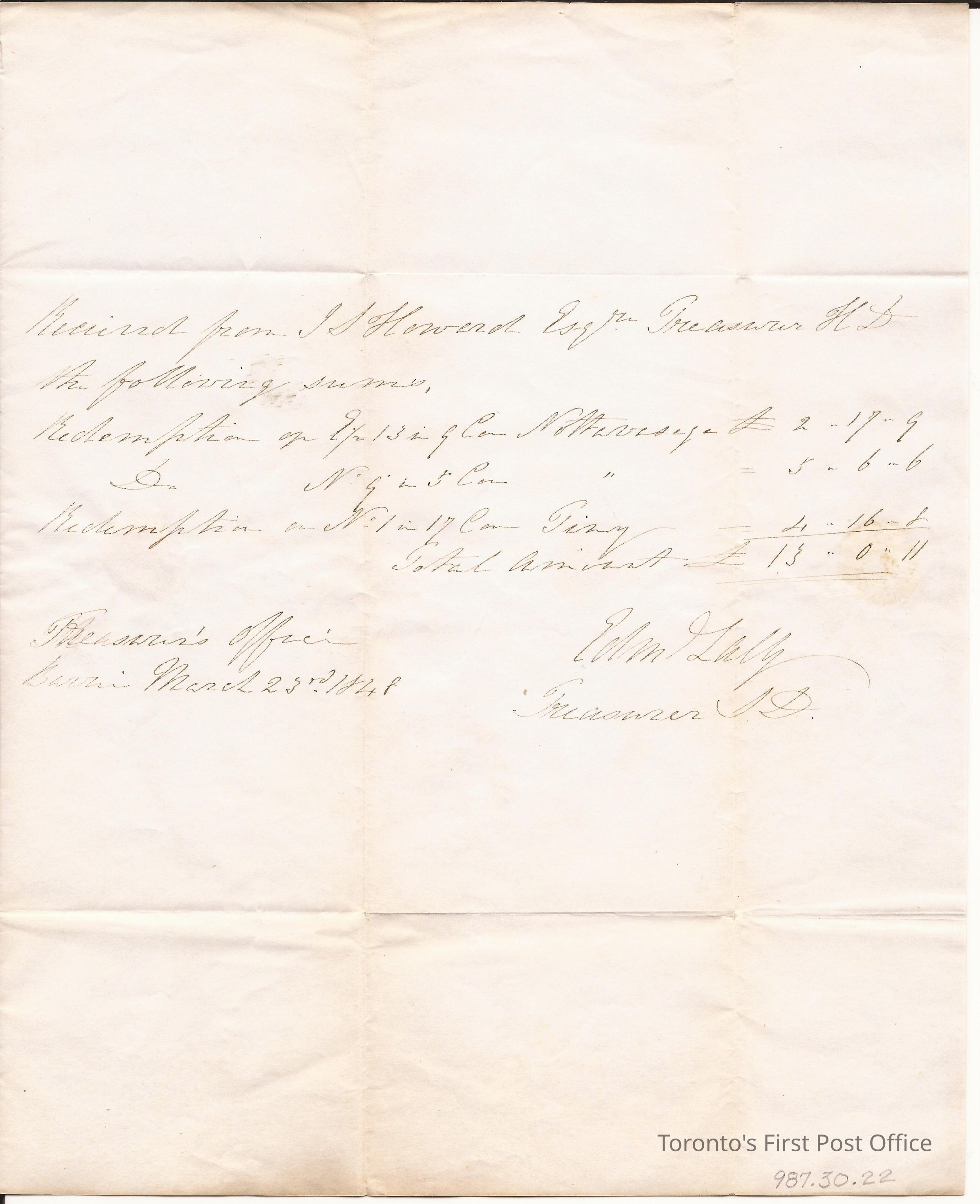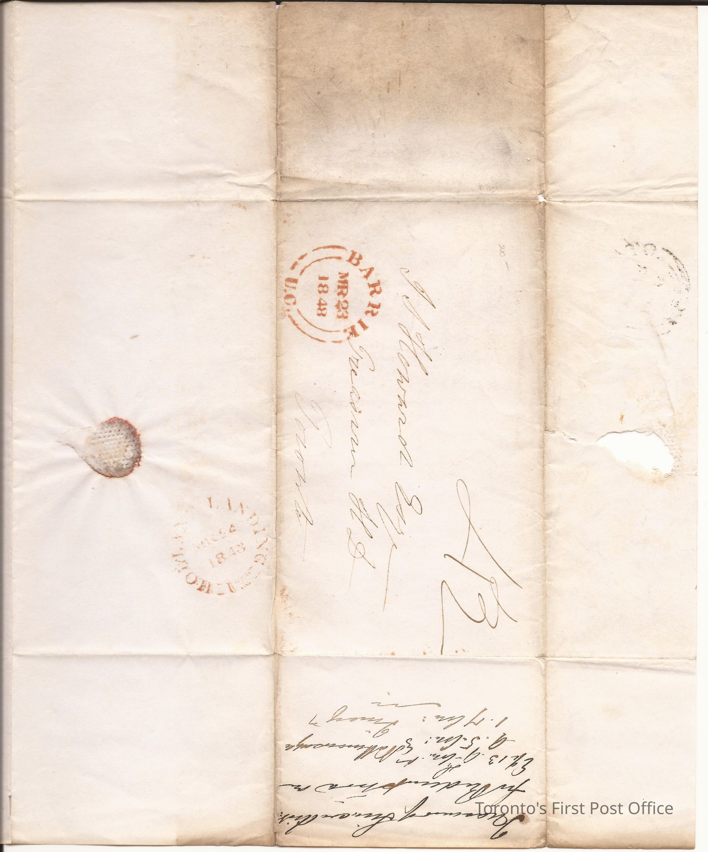 Letter from Edm. Galy(?), Treasurer of Simcoe District, Barrie; to J.S. Howard, Treasurer of the Home District, Toronto; March 23 1848; white paper; watermark: "T NASH"; postmarks: "BARRIE MR 23 HOLLAND LANDING MR 24, '848"; two pages.Update Date