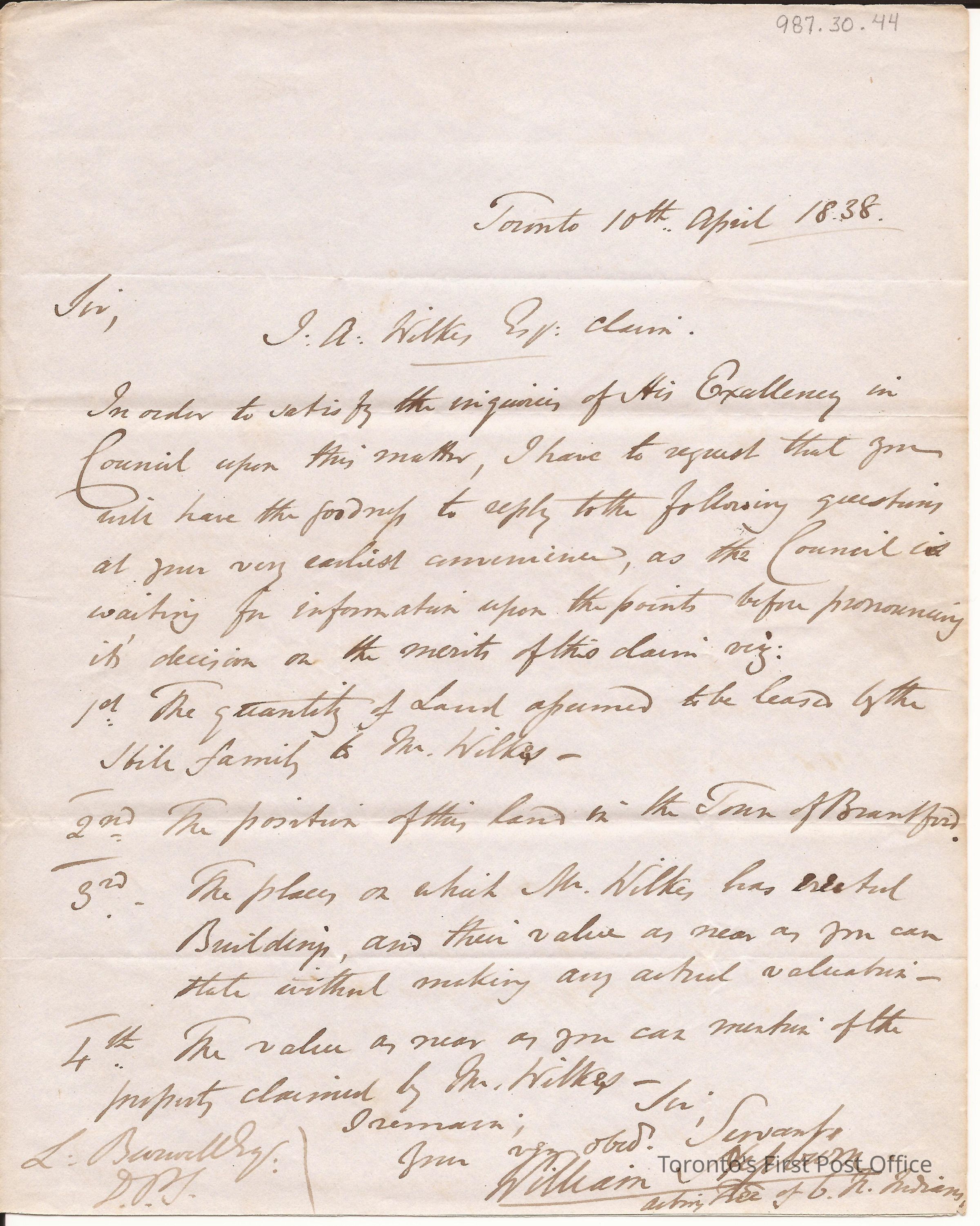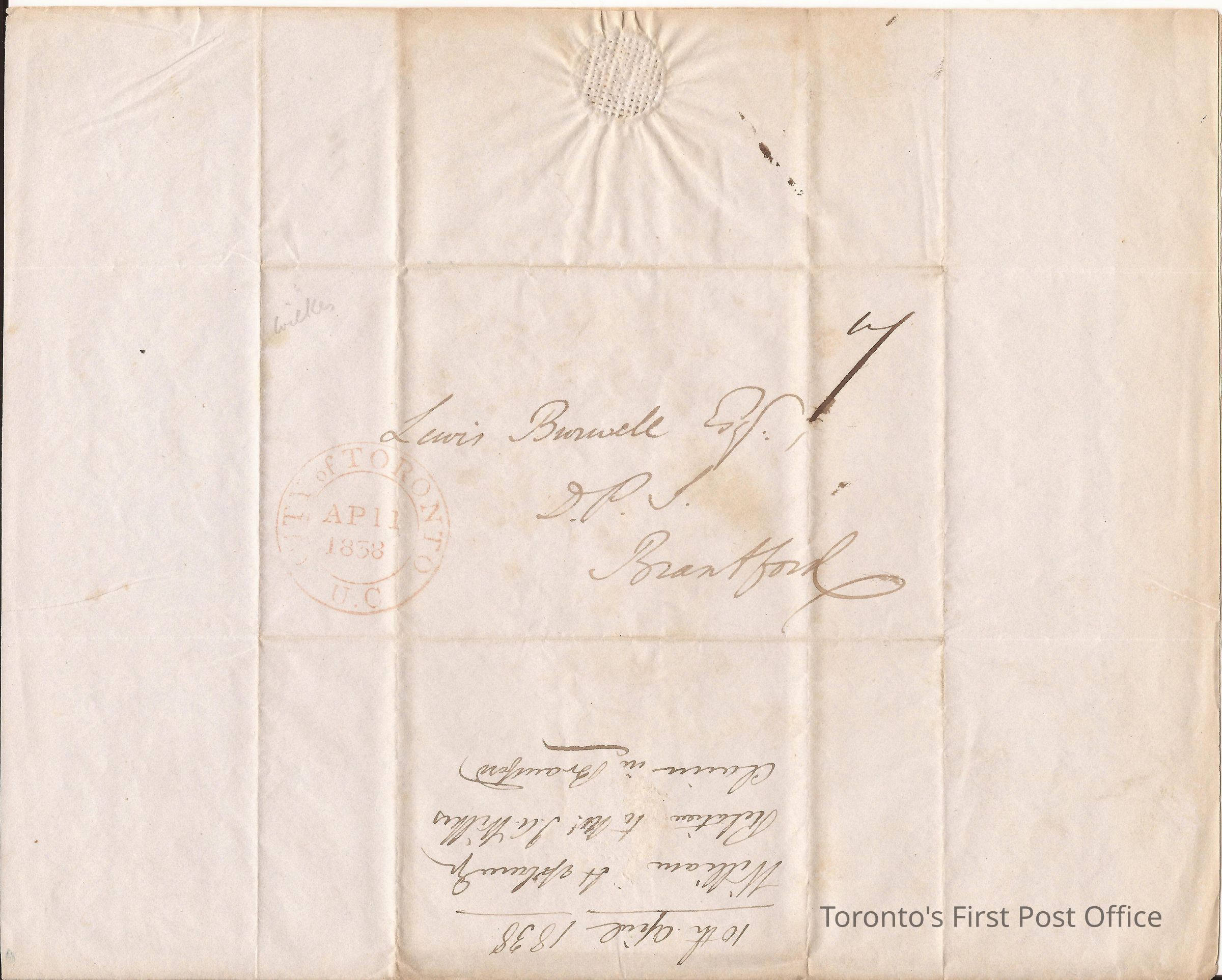 Letter from William Hepburn, Acting Trustee of Six Nations Indians, Indian Office, Toronto; to Lewis Burwell, Deputy Provincial Surveyor, Brantford; dated: Toronto 10 April 1838, postmarks: "CITY OF TORONTO AP11 1838 U.C."; re: awaiting answers to questions re: land sales and claims, leases and value; red wafer seal.Update Date