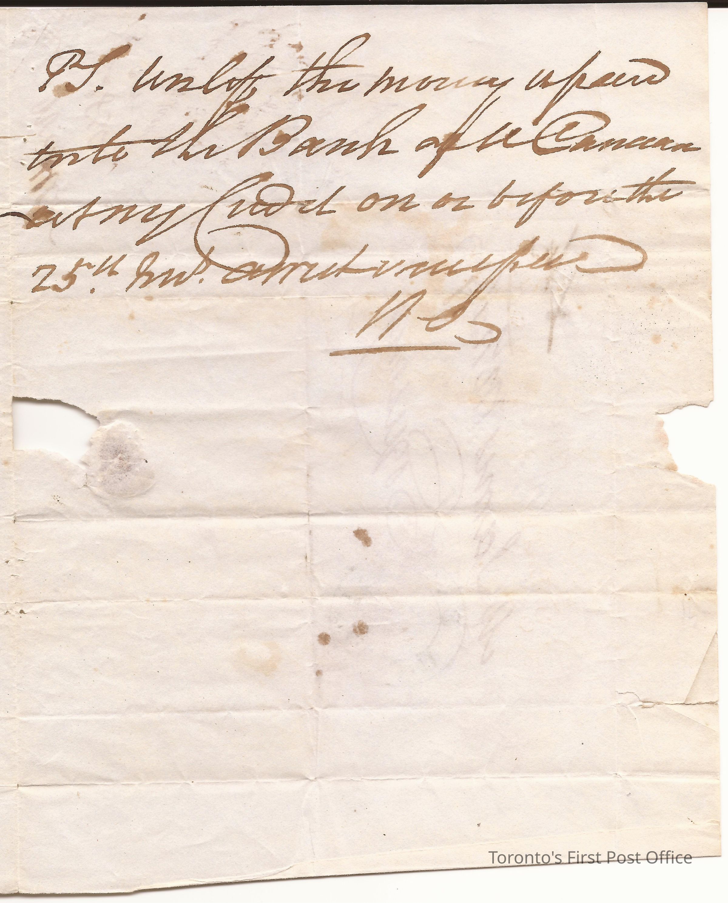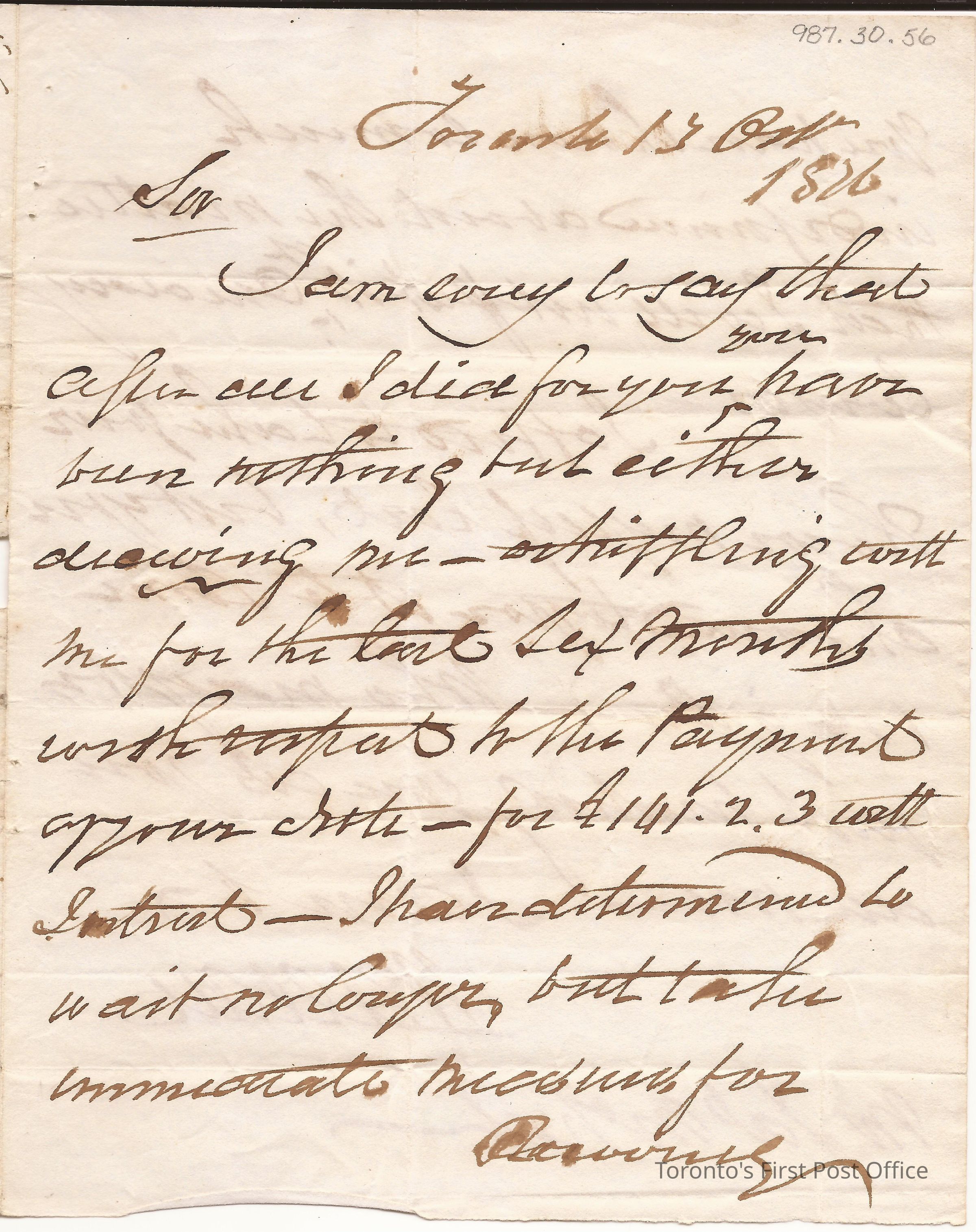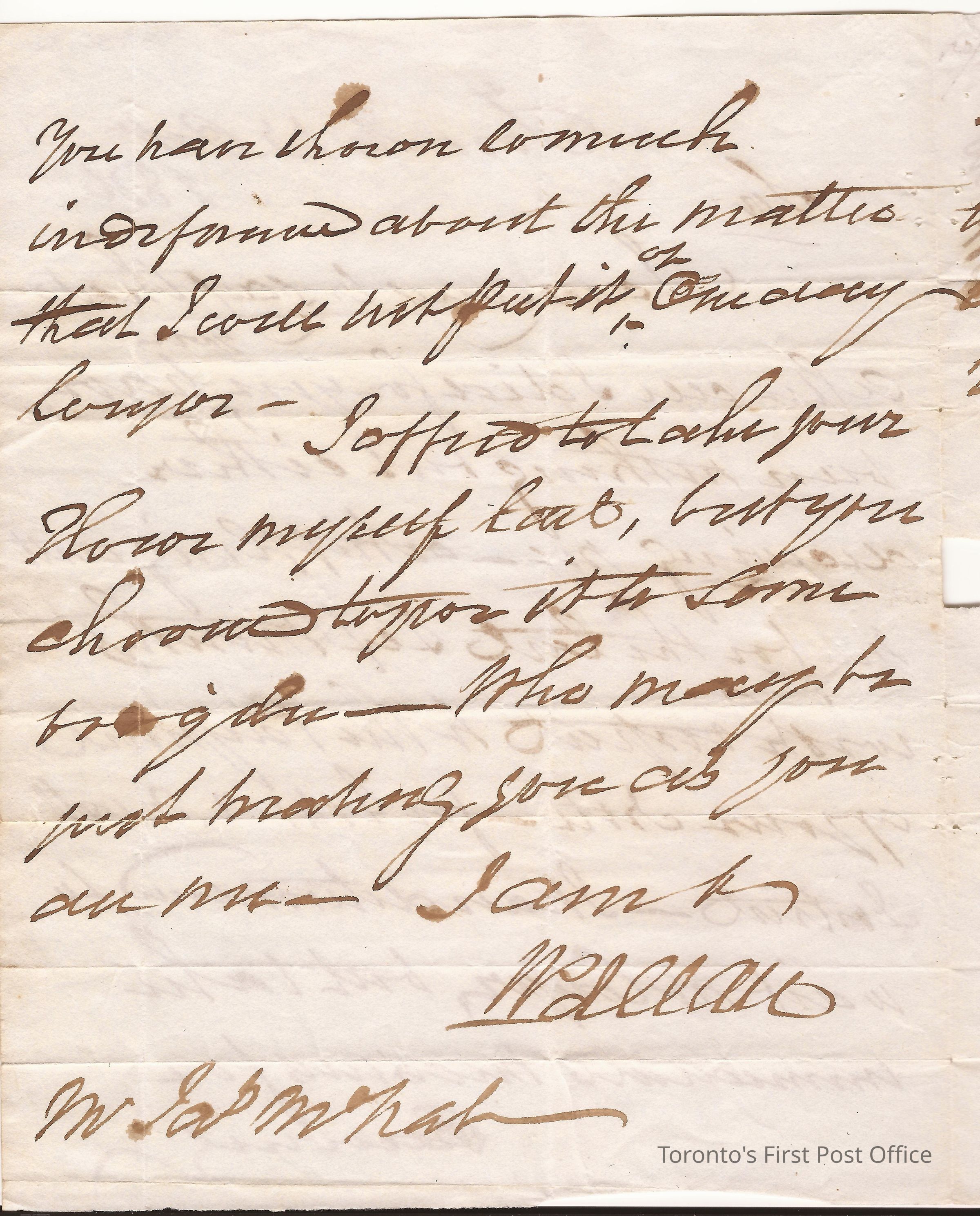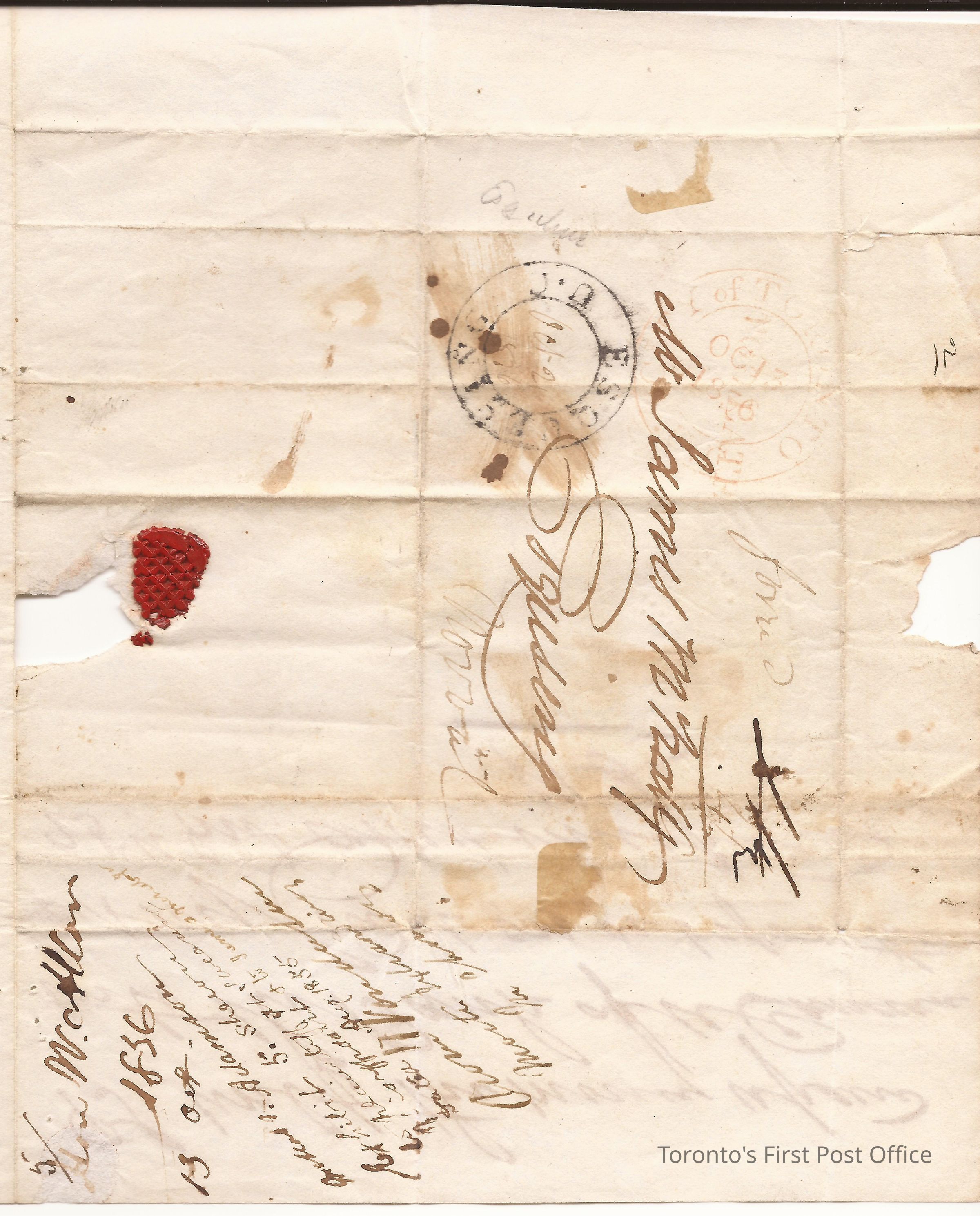 Letter from William Allan, Toronto; to James McHally, Esquesing, Norval; dated: Toronto 13 Oct 1836; postmarks: "CITY OF TORONTO OC 13 1836", "ESQUESING OCT 21 1836"; fragment red wax seal in hatch design; watermark: "W KING 1839", unbleached paper, re: Wm. Allan impatient at non-payment of debt to bank by James McNab if not arrest will ensue.Dimensions