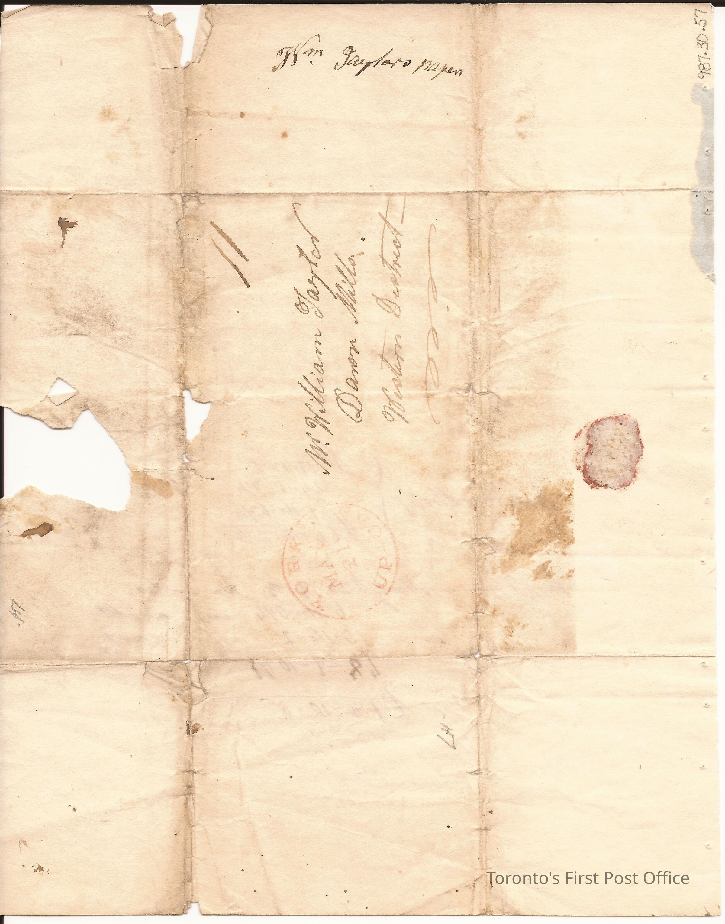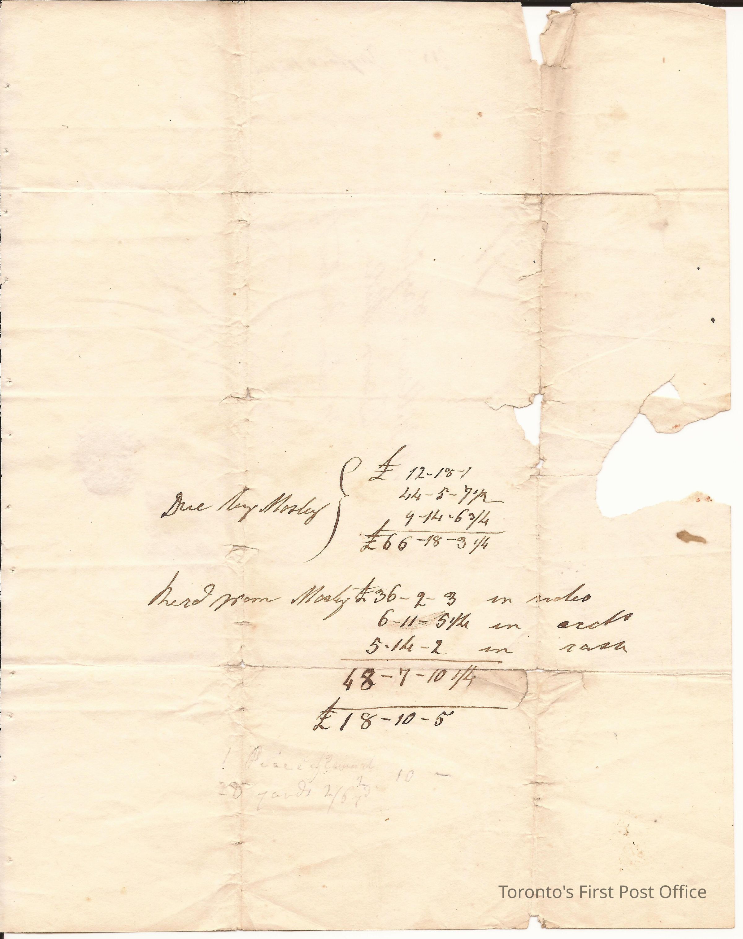 Letter from Henry Mosley, York; to William Taylor, Down Hills, Western District; dated: 21 May 1833(?); postmarks: "YORK UP CAN MAY 21"; red wafer seal; re: accounting notations indicating a balance of £18-10-5 due by Mosley.Dimensions