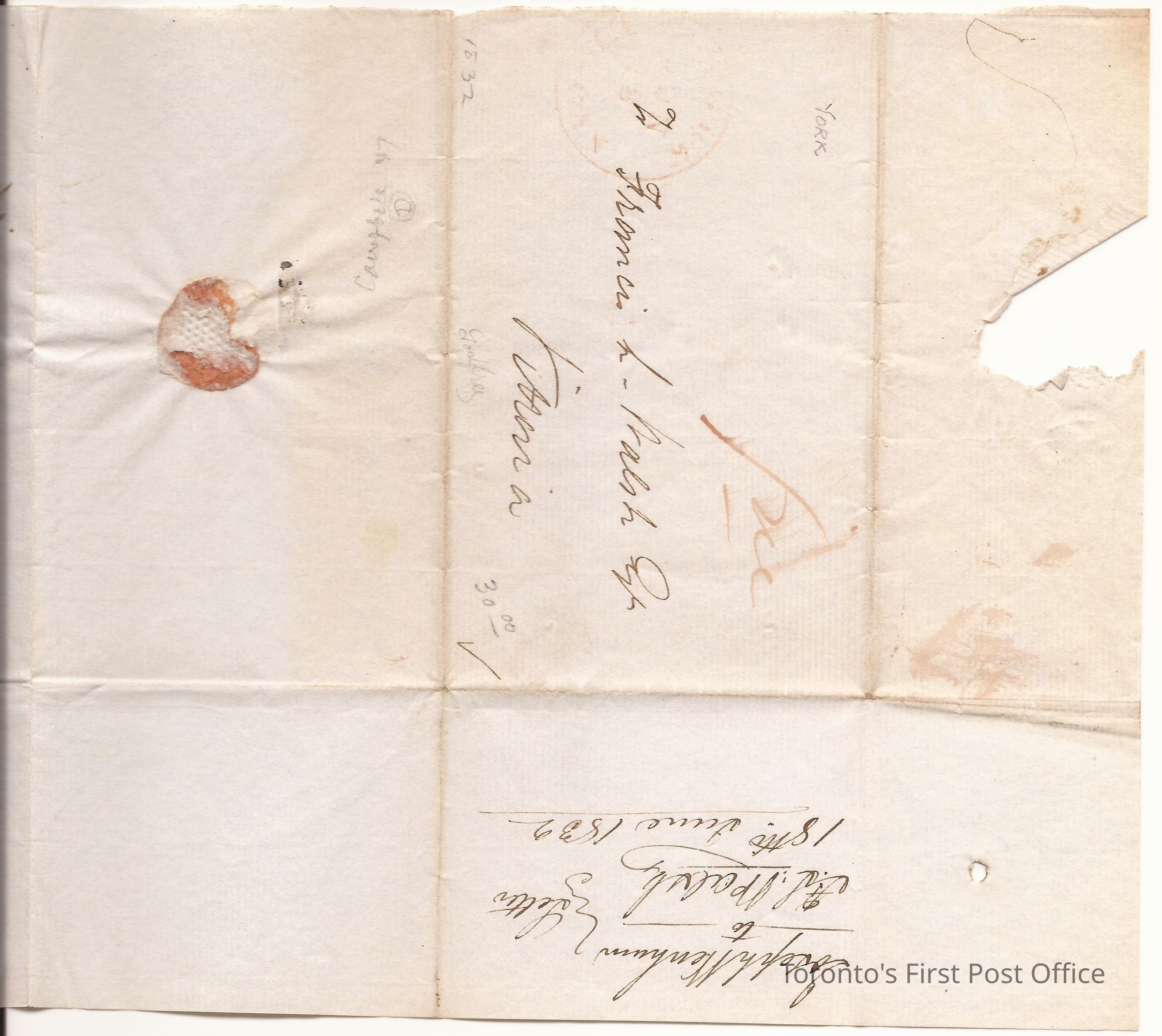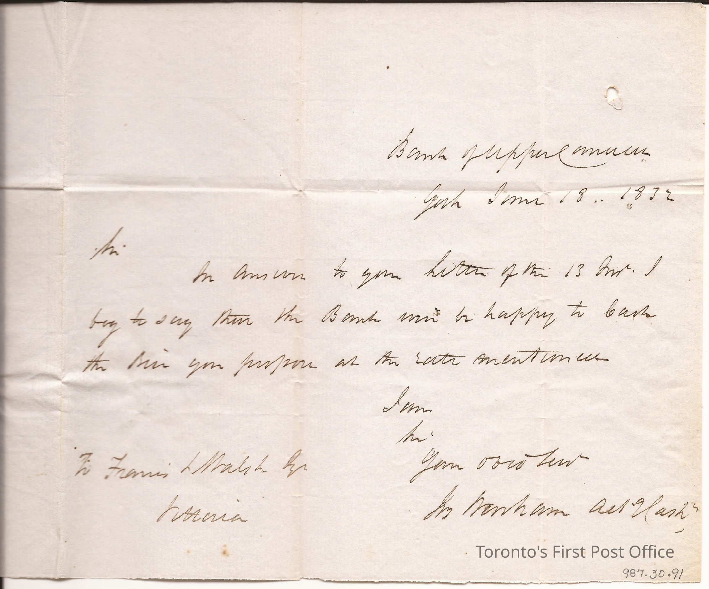 Letter to Francis L Walsh, Esq. Vittoria; from Joseph Werham Act'g Cashier BUC; dated: Bank of Upper Canada York Jun 18 1832; re: cashing bill in reply to request from Walsh; red wafer seal; postage: red manuscript "FREE"; black ink; unbleached, laid, crisp, green paper; watermark: "WHATMAN 1830".Update Date