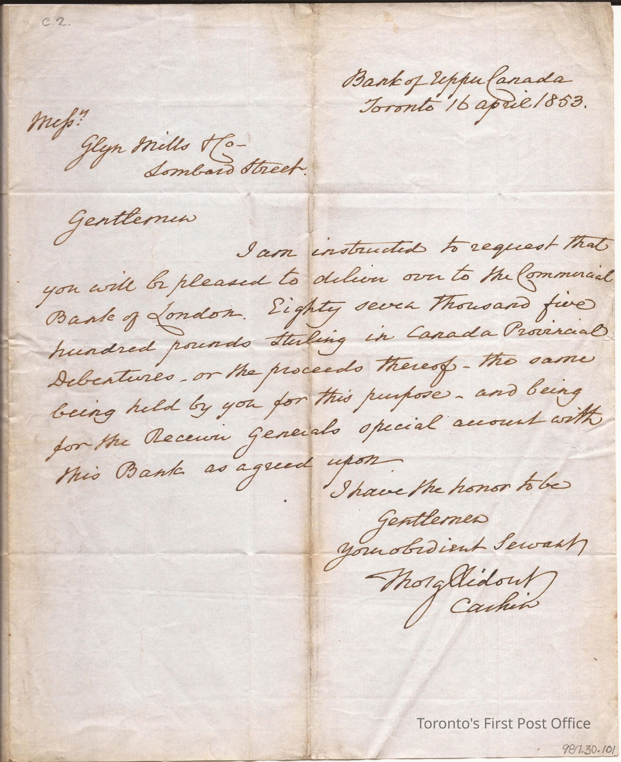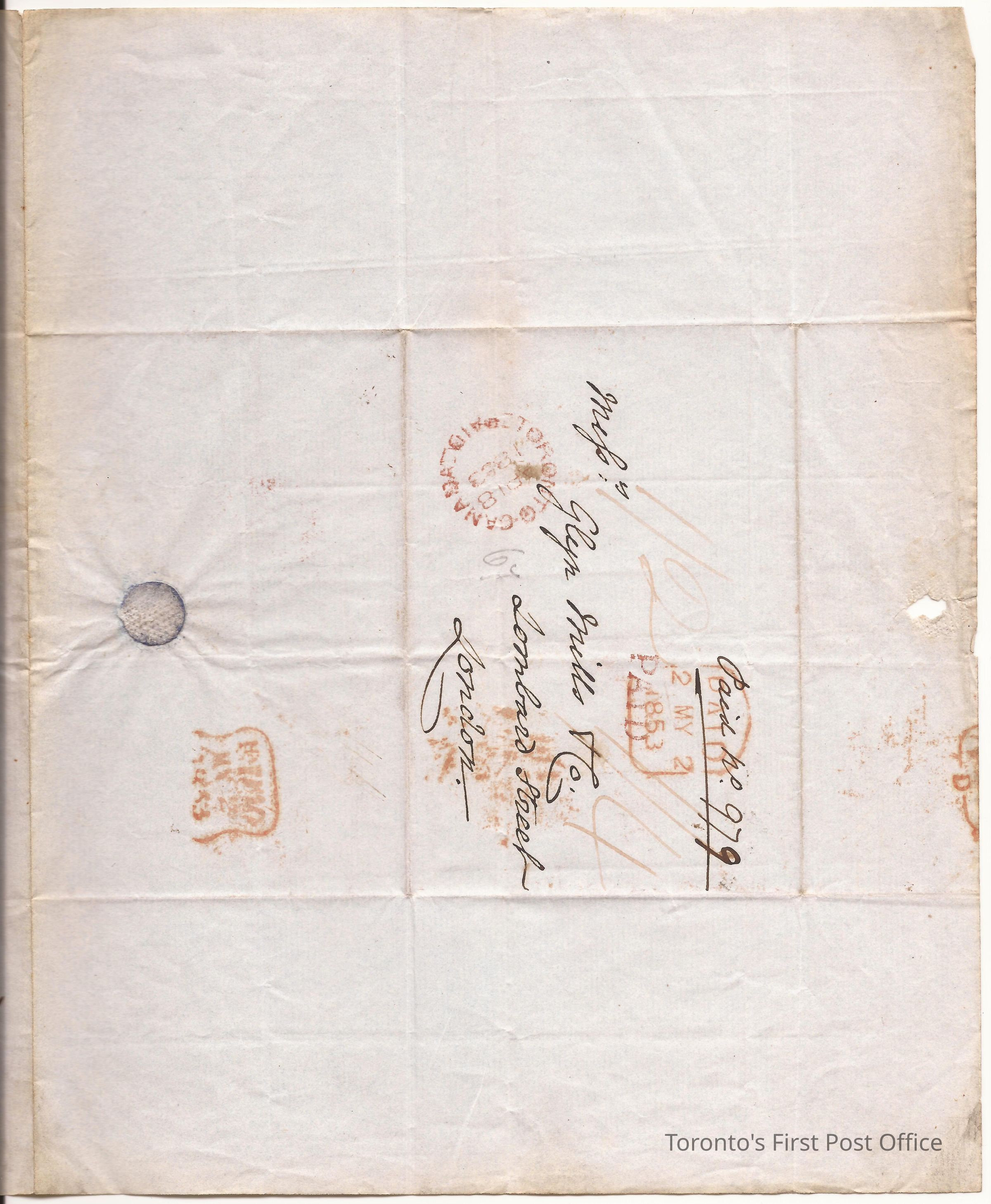Letter to Mssrs. Glyn Mills and Co. Lombard Street London; from Thos. G. Ridout Cashier; dated: Bank of Upper Canada Toronto 16 April 1853; postmarks: 1. orange rounded off square "PAID 2MY2 1852", 2. red single broken "TORONTO-CANADA PAID AP18 1853", 3. orange pinched-in square, overseas marking "... MY 2 1853... D", 4. smudged, orange stamp; postage "1/2" or "1/4"; blue, crisp, laid paper, black ink faded to brown, watermark: "THSAUNDERSON & CO 1852".Dimensions