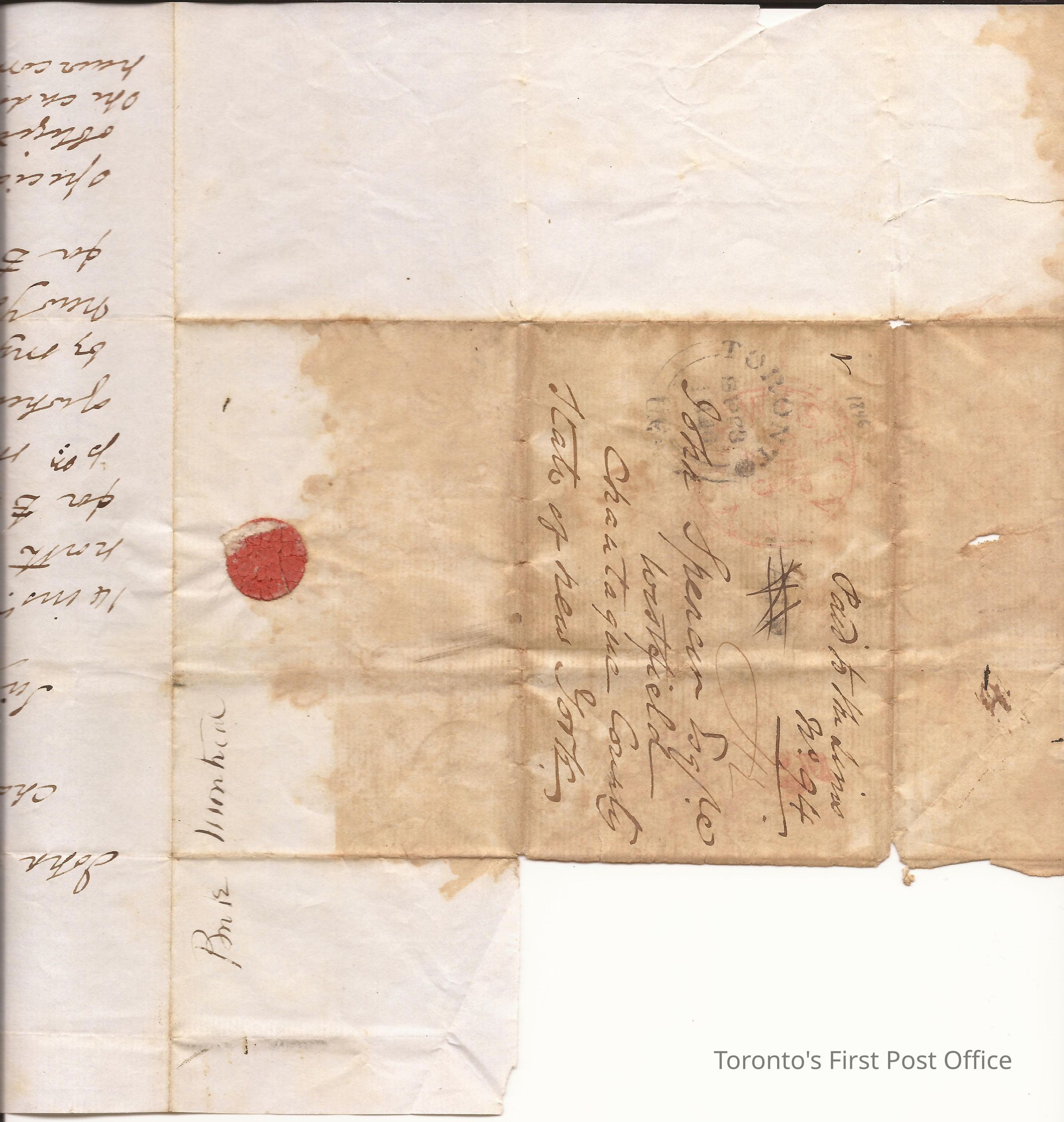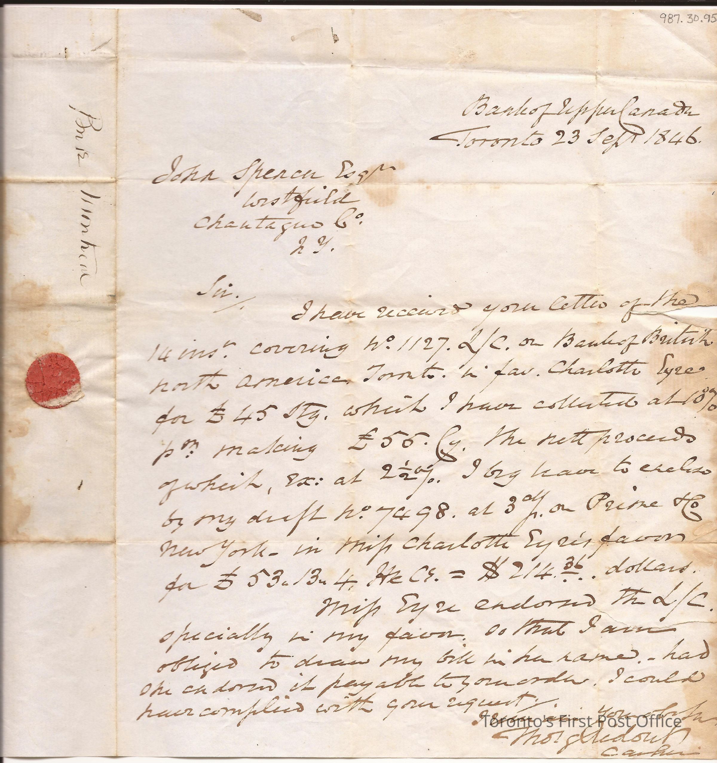 Letter to John Spencer, Esq., Westfield, Chautaque County, State of New York; from Thos. G. Ridout, Cashier; dated: Bank of Upper Canada, Toronto 23 Sept 1846; postmarks: 1. black broken double "TORONTO SP 23 1846 U.C.", red single "WESTON NY SEP 23 (30?)"; unbleached, laid paper; watermark: "CANSELL 1845"; black ink fading to brown; red wafer seal; re: letter of account re not #1127 in favour of Charlotte Eyre for £45; includes difficult to understand jargon and abbreviations.Update Date