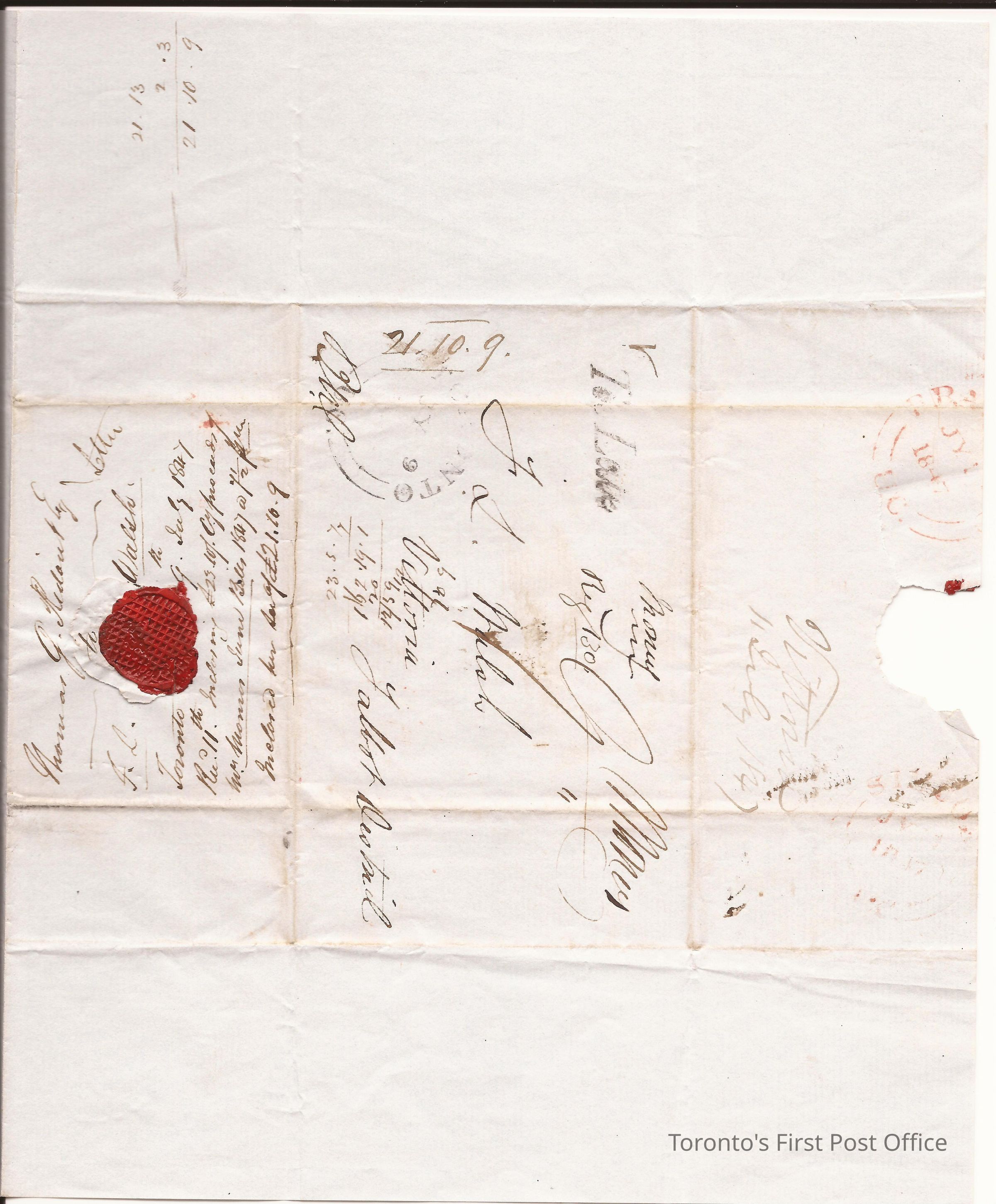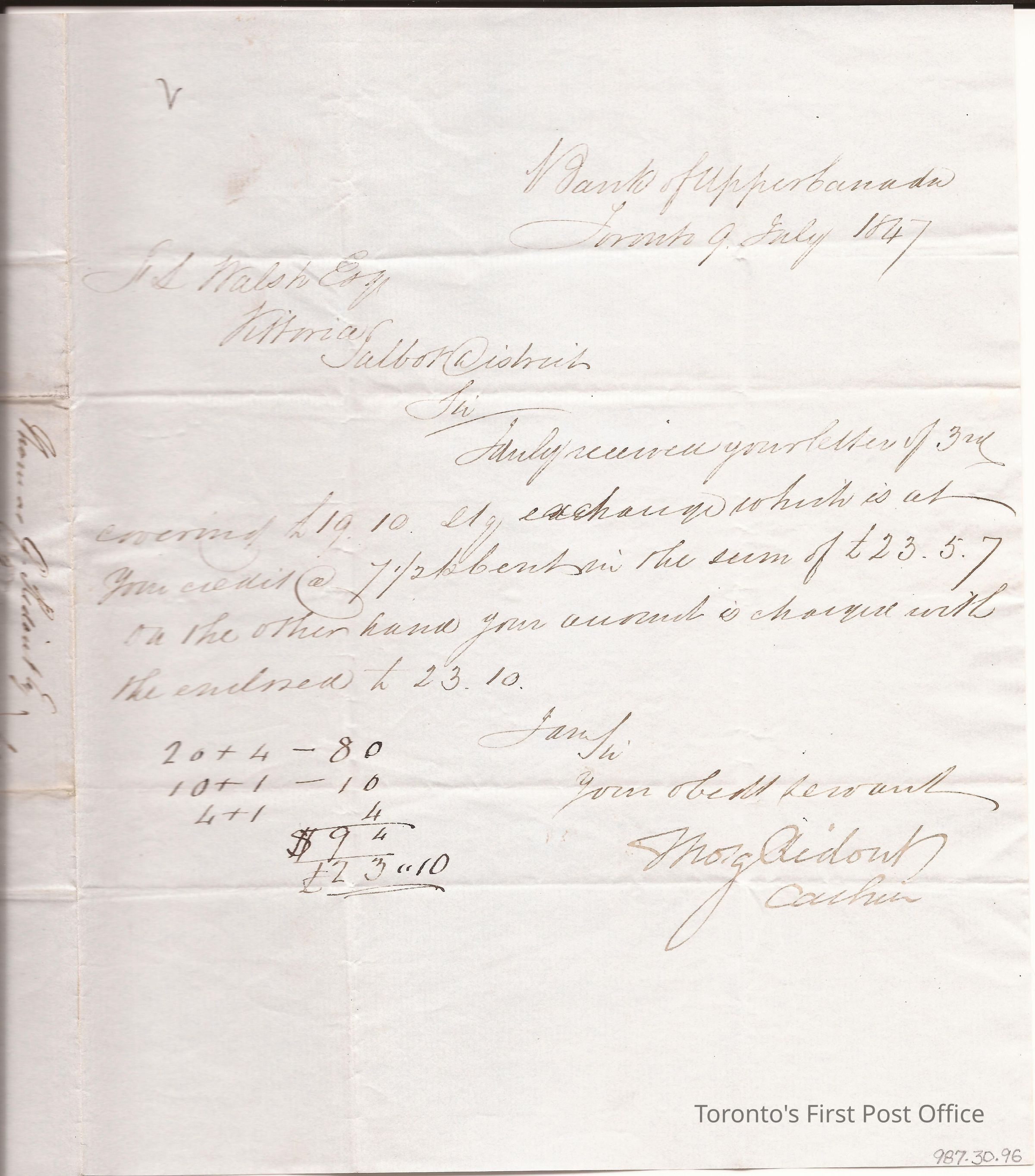 Letter to F.L. Walsh, Vittoria, Talbot District; from Thos. G. Ridout, Cashier; dated Bank of Upper Canada, Toronto 9 July 1847; postmarks: 1. broken double circle incomplete "PR… JY 1 1847 U.C.", 2. black stamp "Too Late", 3. black broken double "… TORONTO JY... U.C.", 4. money letter, 5. red broken double circle, not very clear impression "ST... JY... 1846"; unbleached, laid paper; black ink faded to brown; watermark: "CANSELL 1846"; re: an account of £23 "10" in favour of F.L. Walsh.Update Date