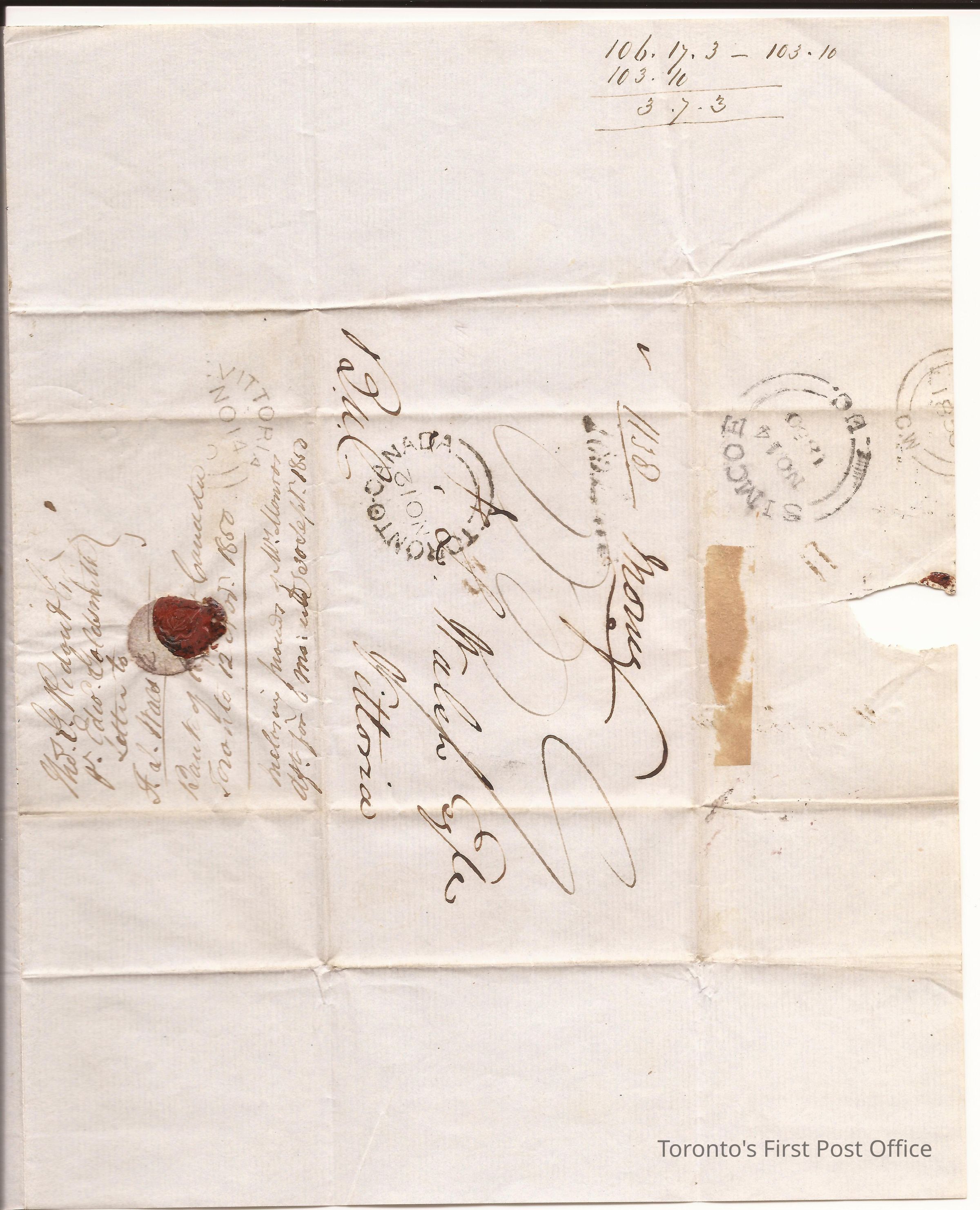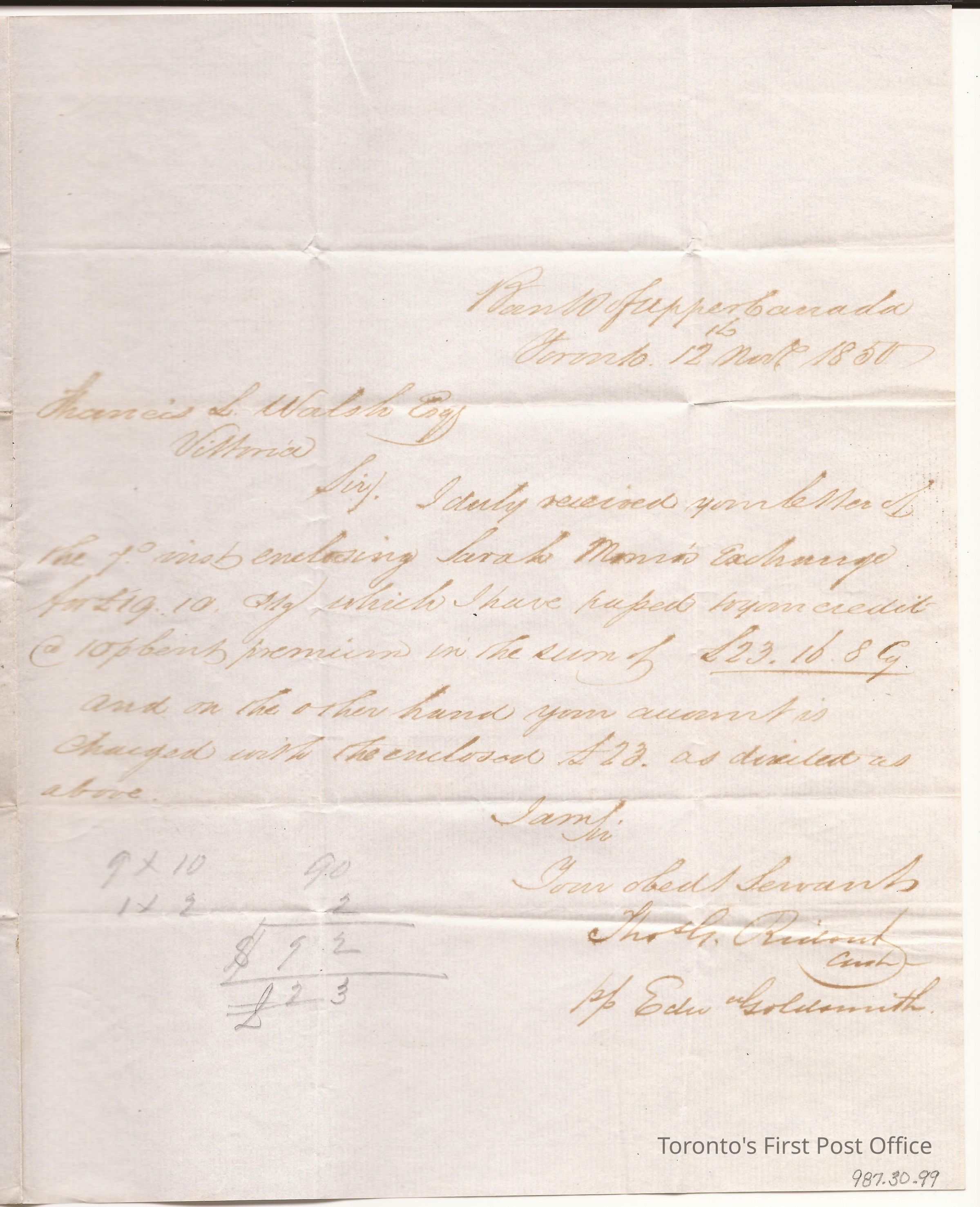 Letter to F.L. Walsh, Esquire, Vittoria; from Thos. G. Ridout, Cashier; dated: Bank of Upper Canada Toronto 12 Nov 1850; postmarks: 1. black broken double "TORONTO CANADA NO 12", 2. black broken double "SIMCOE NO 14 1850 U C"; 3. black broken double "VITTORIA NO 14"; 4. black broken double "... 185... C.W.", 5. black manuscript "money letter", 6. black stamp "Too Late"; unbleached, crisp, laid paper; black ink bleached to brown; watermark: shield surmounted by crown and below initials "JL(S?)"; re: credited to Walsh's account of £23.16.8 cy from Mrs. Munro.Update Date