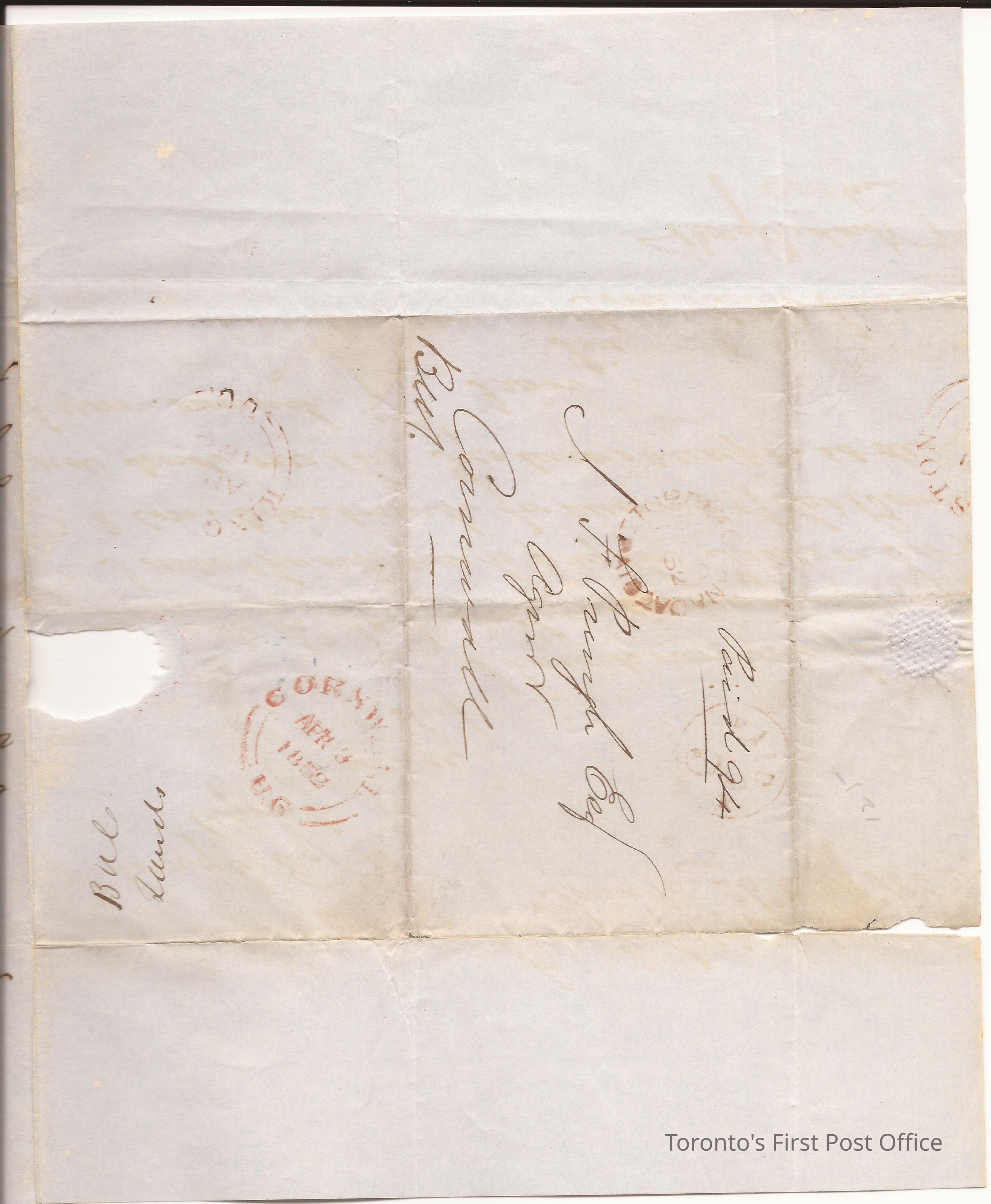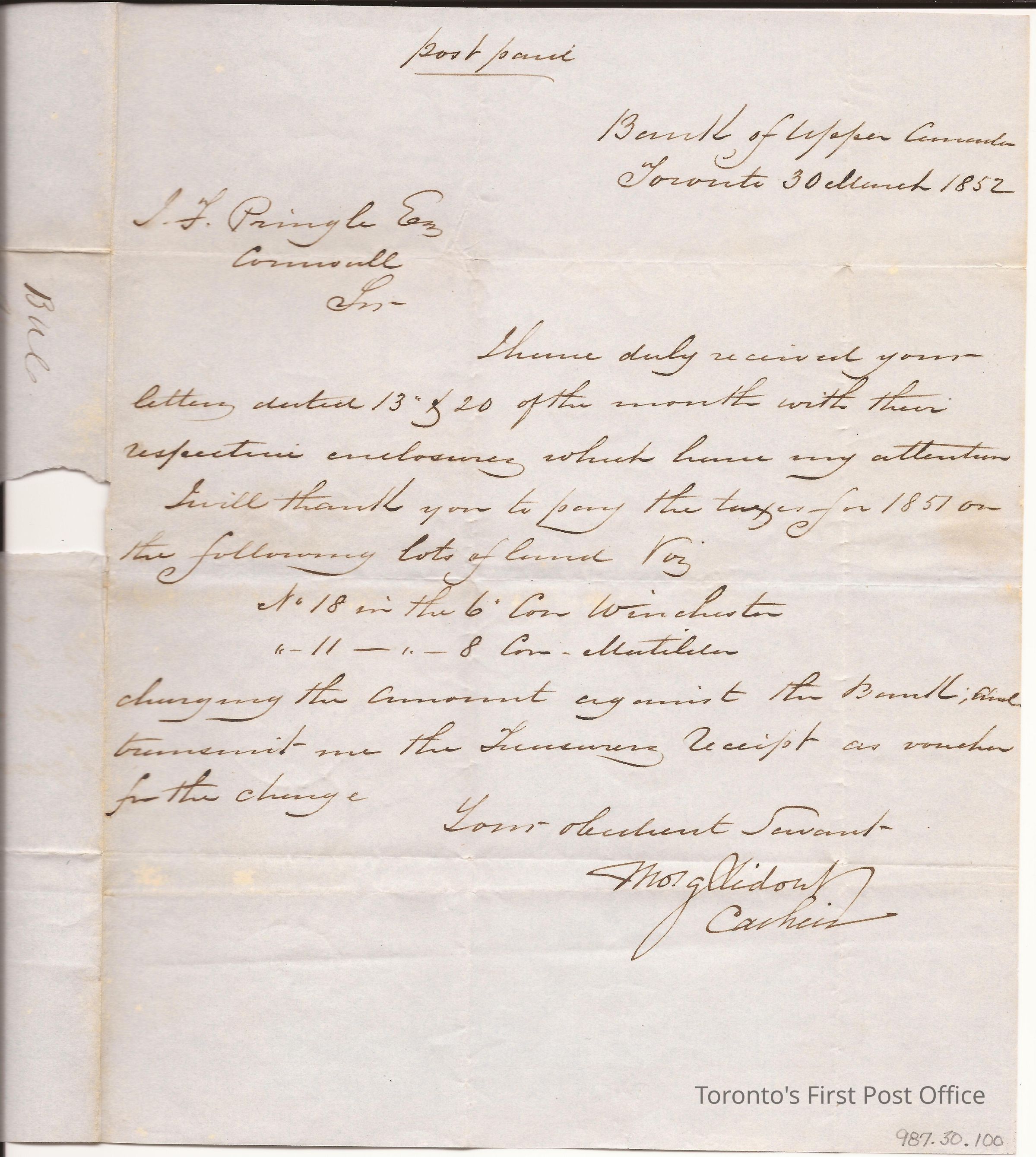 Letter to J.F. Pringle Esq. Agnt Cornwall; from Thos. G. Ridout, Cashier; dated: Bank of Upper Canada Toronto 30 March 1852; crisp, light blue, laid paper; black ink faded to brown; watermark: "C WILMOT 1850"; red wafer seal; postmarks: 1. red broken double "CORNWALL APR 3 1852 U.C.", 2. red broken double "KINGSTON AP... U.C.", 3. brown broken double "TORONTO CANADA PAID... 52", red broken double "... STON..."; postage: "Paid 94"; re: taxes due for 1857 on lot 18-6th Con. Winchester, lot 11-8th Con. Matilda.Dimensions