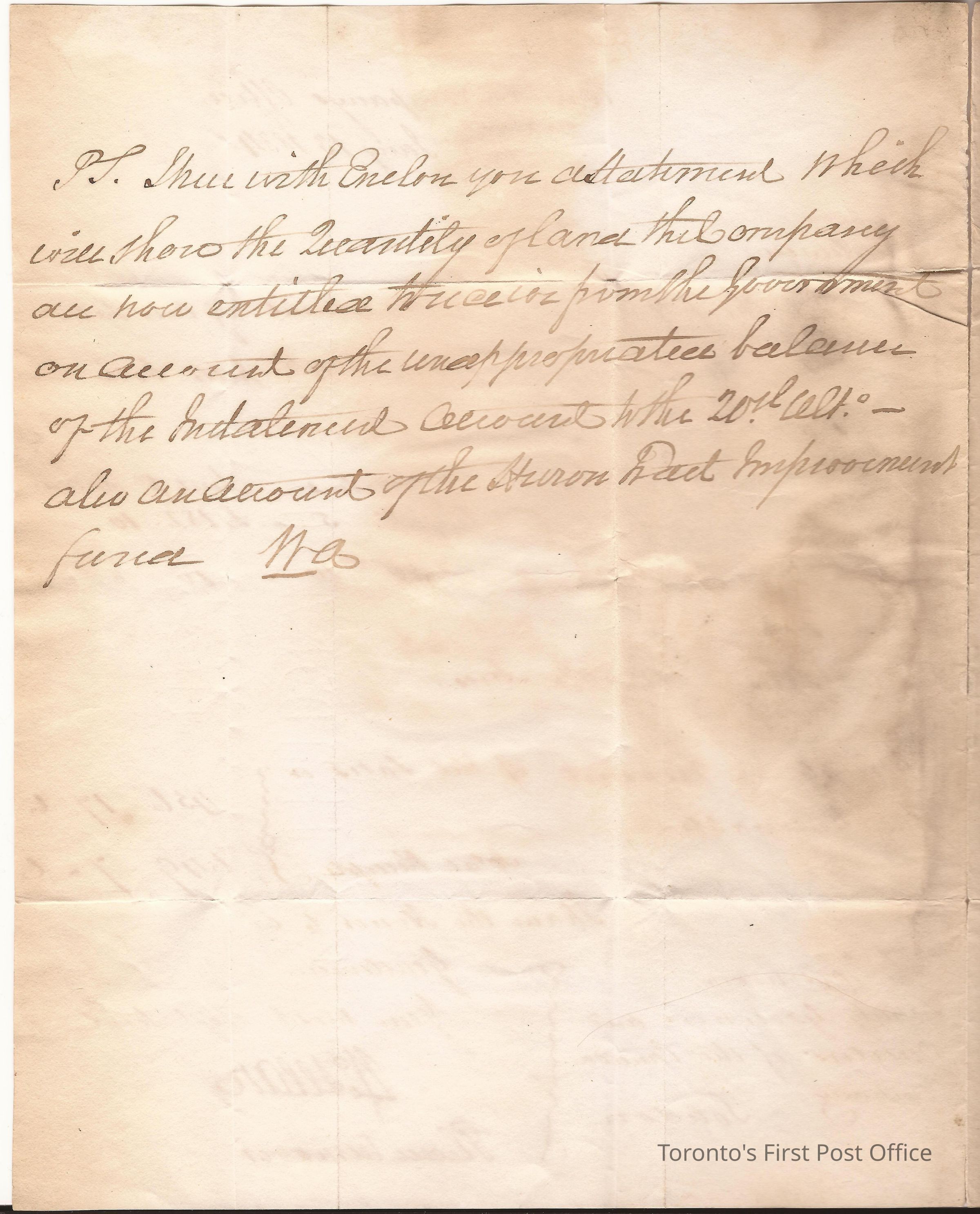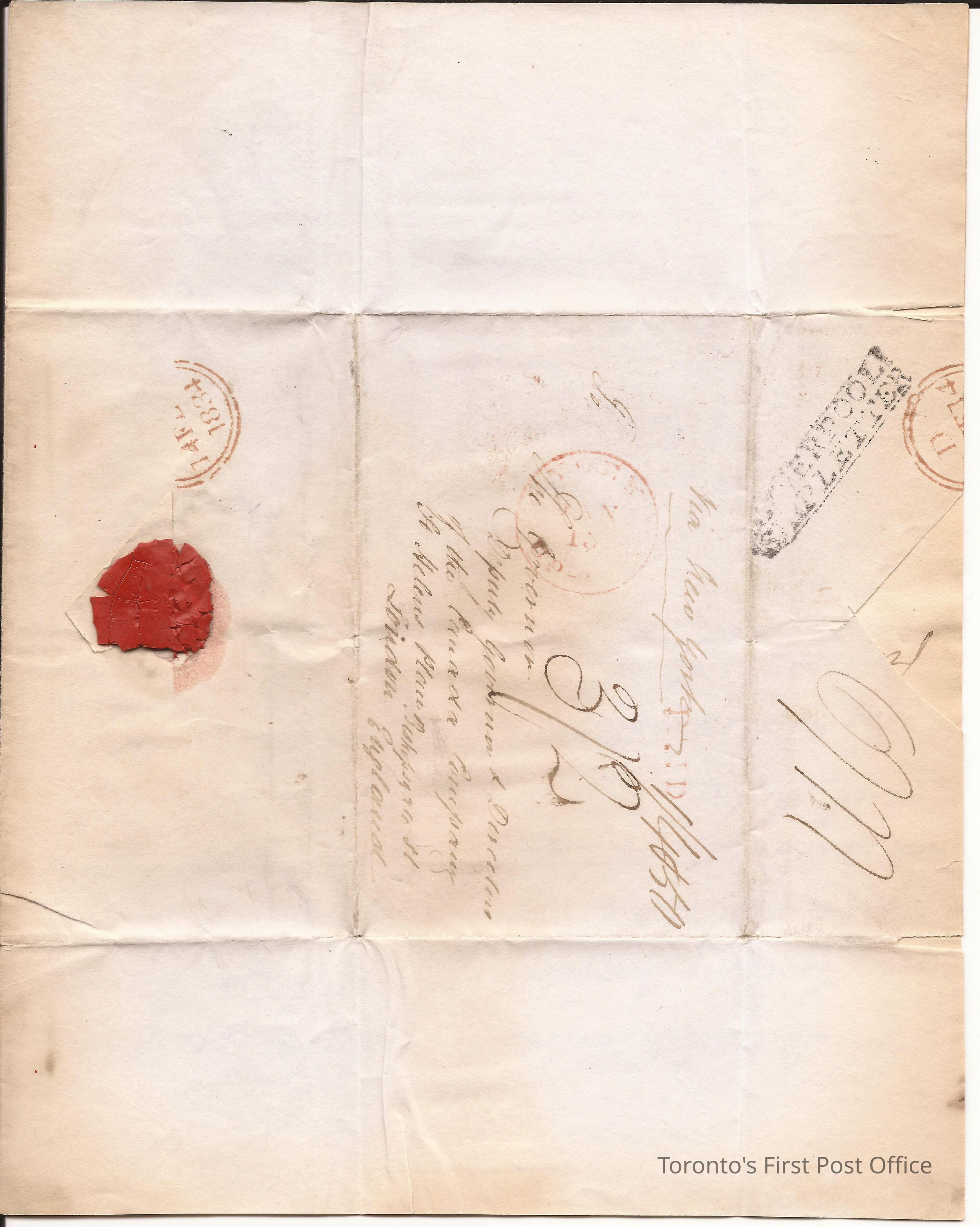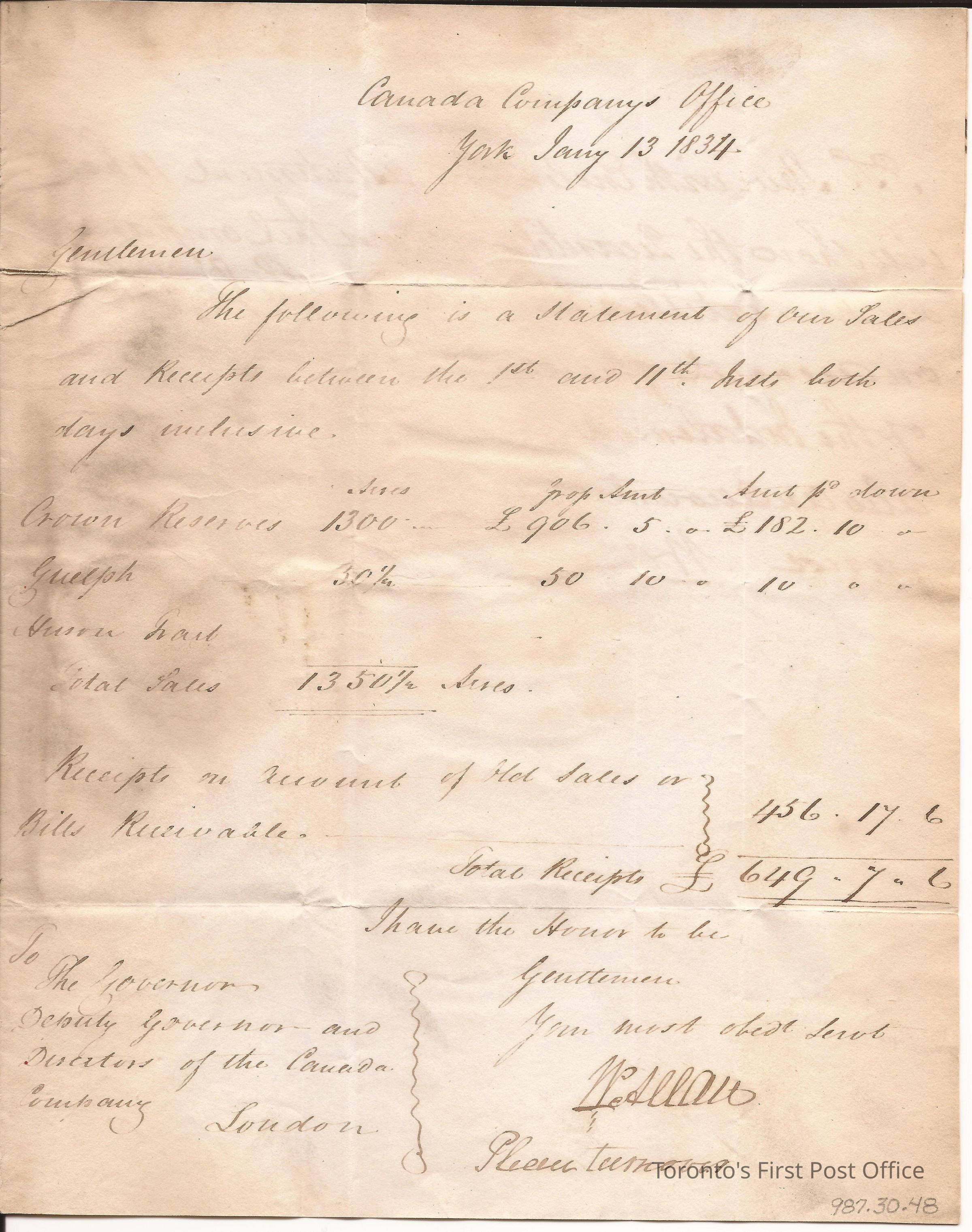 Letter from William Allan, Commissioner Canada Company, Toronto; to the Governors and Dep. Gov. and Director of the Can. Co. London, England; dated: York January 13, 1834; postmarks: "D 14 FEB 14 1834", "LIVERPOOL SHIP LETTER", "PAID", "YORK JAN 13 UP-CAN", Canada Company address: "St. Helens Place Bishopsgate St. London, England"; re: account and remittance of sales and balancing receipt of land which they are entitled to.Update Date