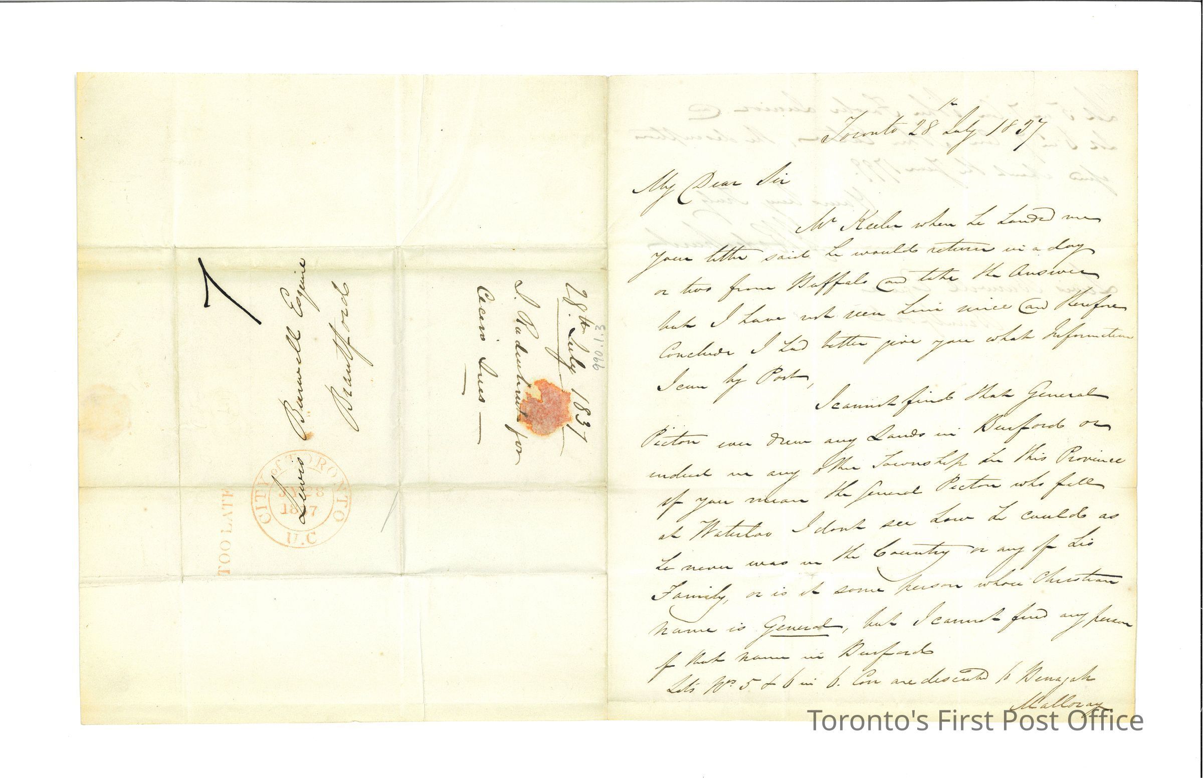 Letter from I. Radenhurst to Lewis Burwell, Esq., Brantford; watermark: "J. Whatman 1835"; postmark: red double "CITY OF TORONTO JY 28 1837 U.C."; hand stamp: red "TOO LATE"; postage: black manuscript: "7".Dimensions