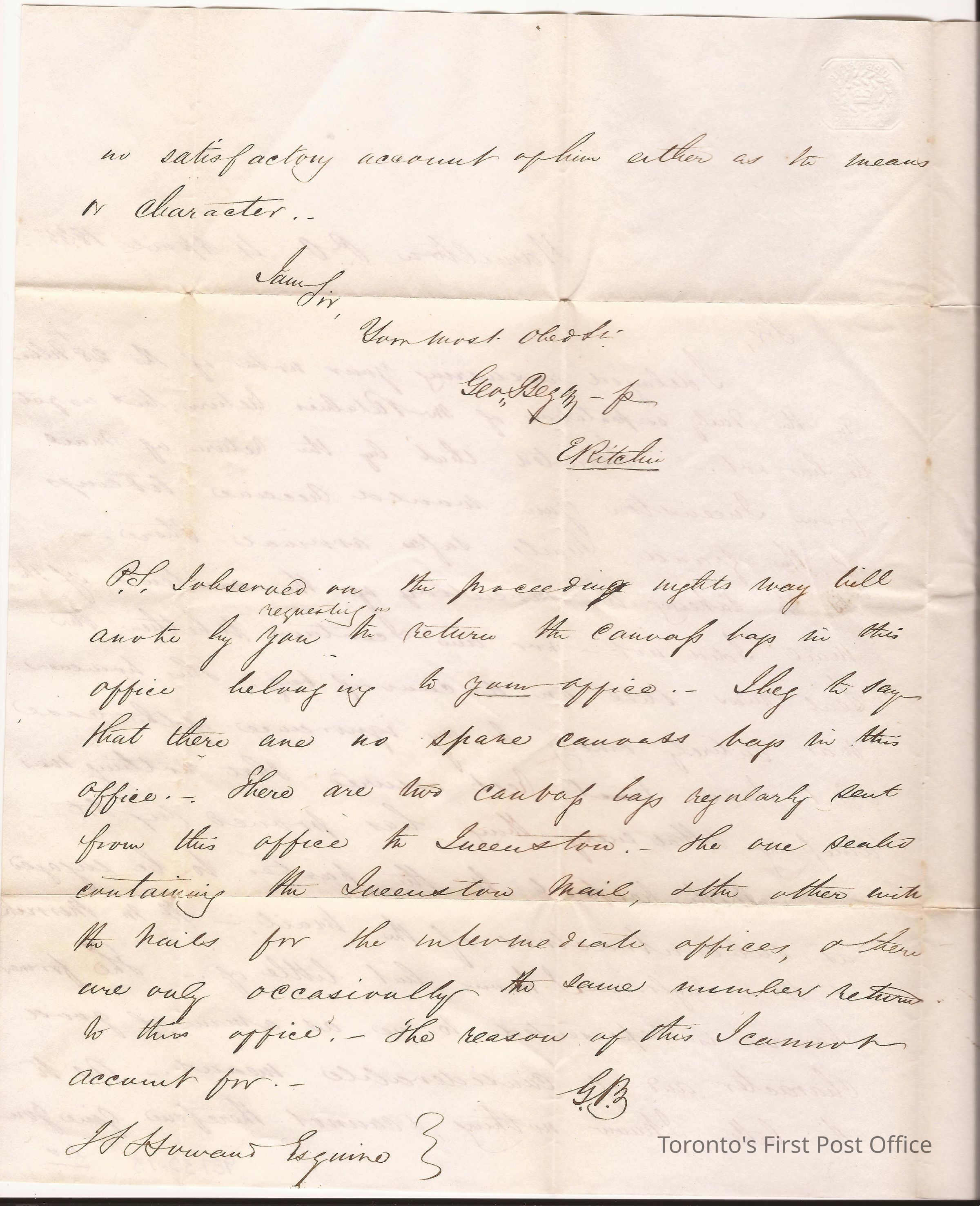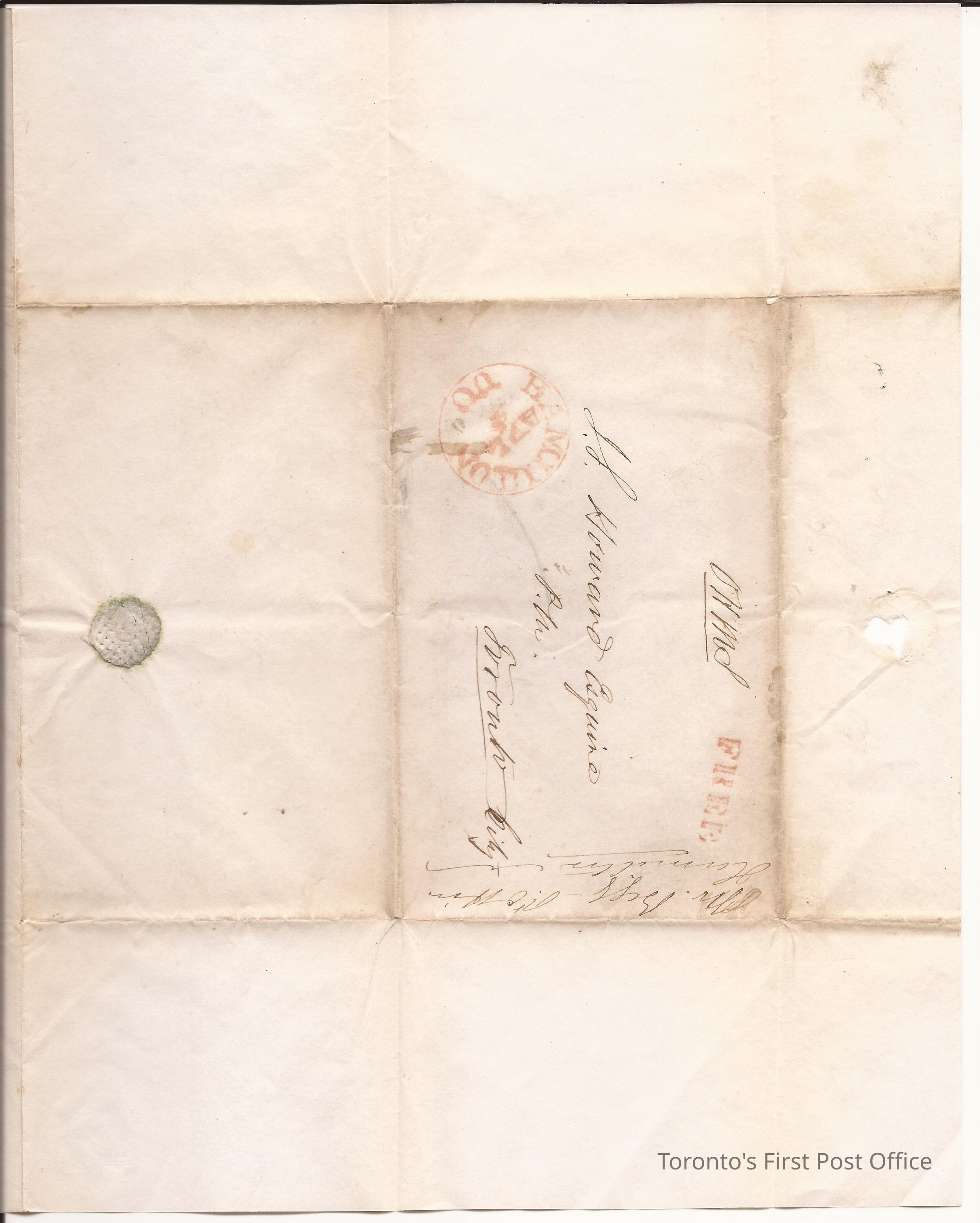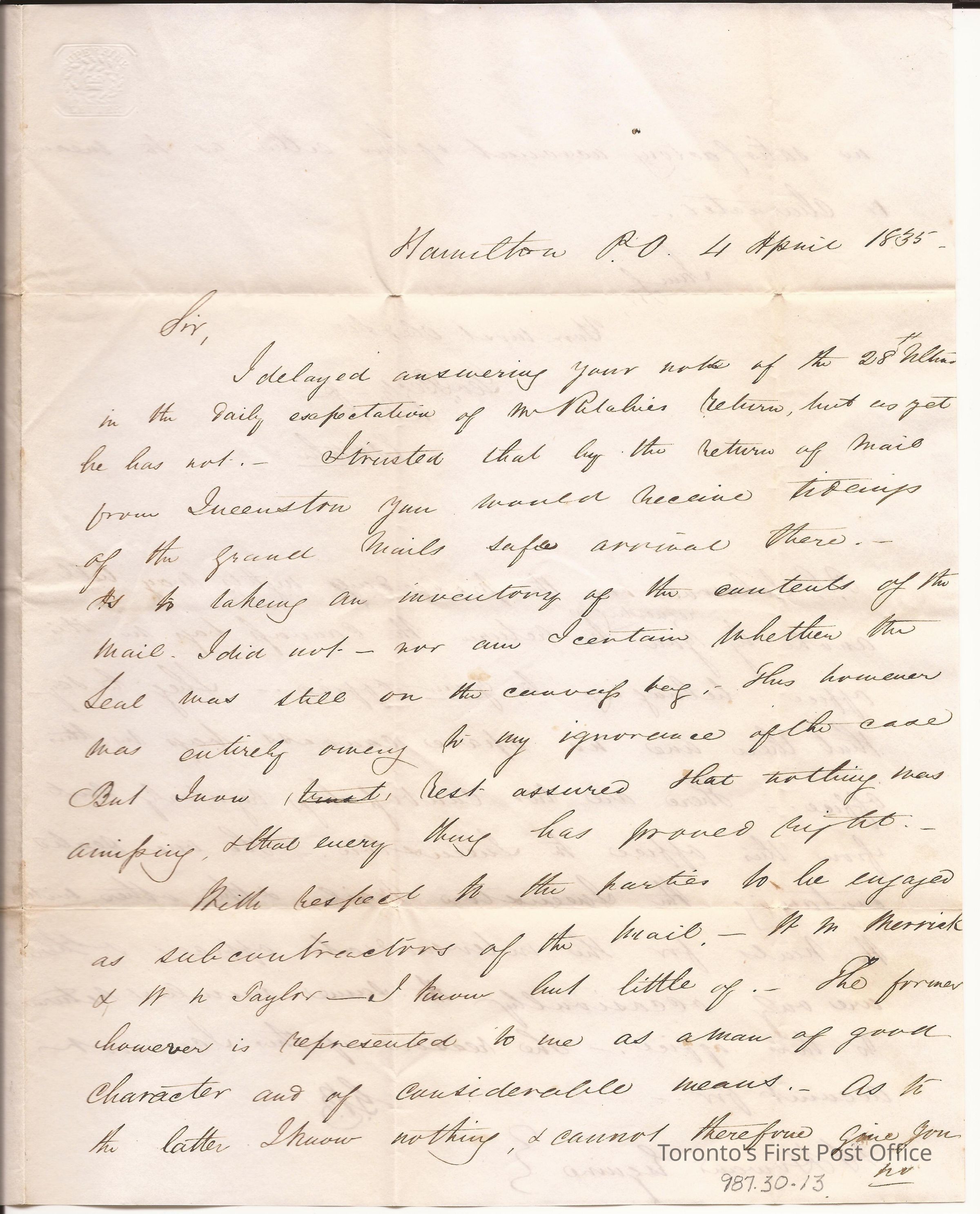 Letter from George Begg for E. Ritchie, Hamilton, to J.S. Howard, Esq., Postmaster, Toronto City; 4 April 1835; yellowed paper; has been folded and sealed; postmarks: "Hamilton, U.C. Ap 4", "FREE" emblem in upper let corner of front page; "Super fine letter" with crown amidst laurels. OHMS = On her majesty's serviceUpdate Date