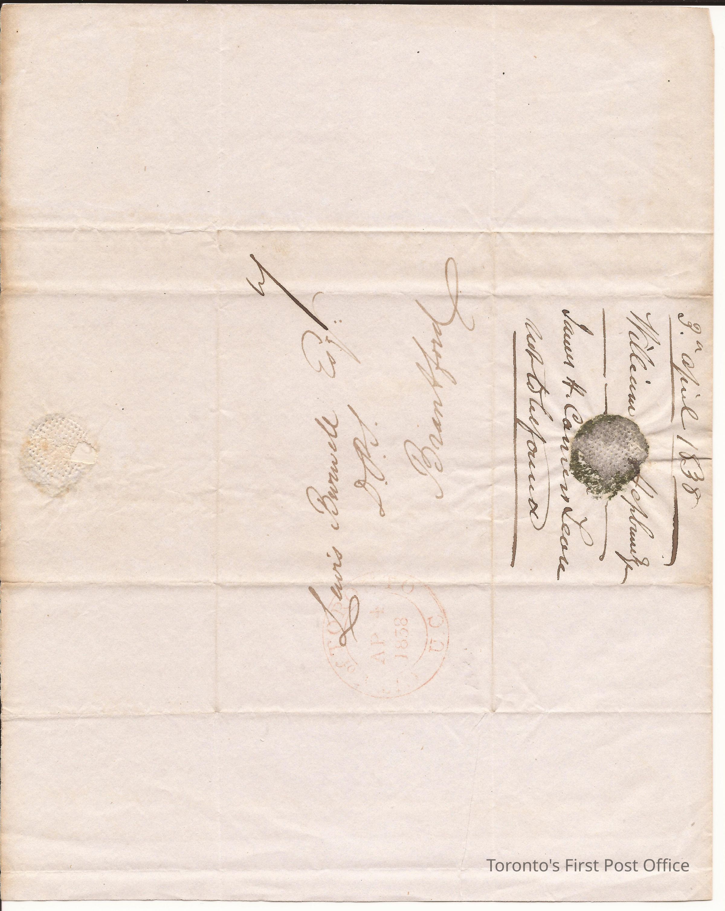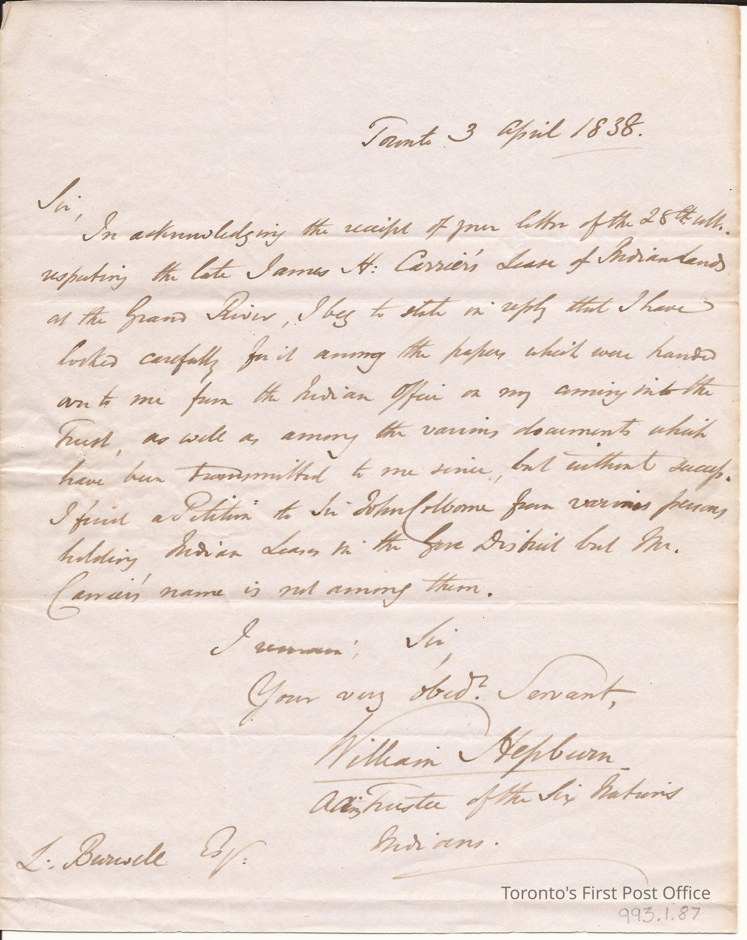Letter and cover; from William Hepburn, "Acting Trustee of the Six Nations Indians"; to Lewis Burwell Deputy Provincial Surveyor at Brantford; dated: 3 April 1838; marks: red "CITY OF TORONTO", "AP 4 1838"; rated: "7"; 2 pp.; black ink; green wafer seal; re: unsuccessful search of the late James H. Carriers lease documents handed over by Indian department.Update Date