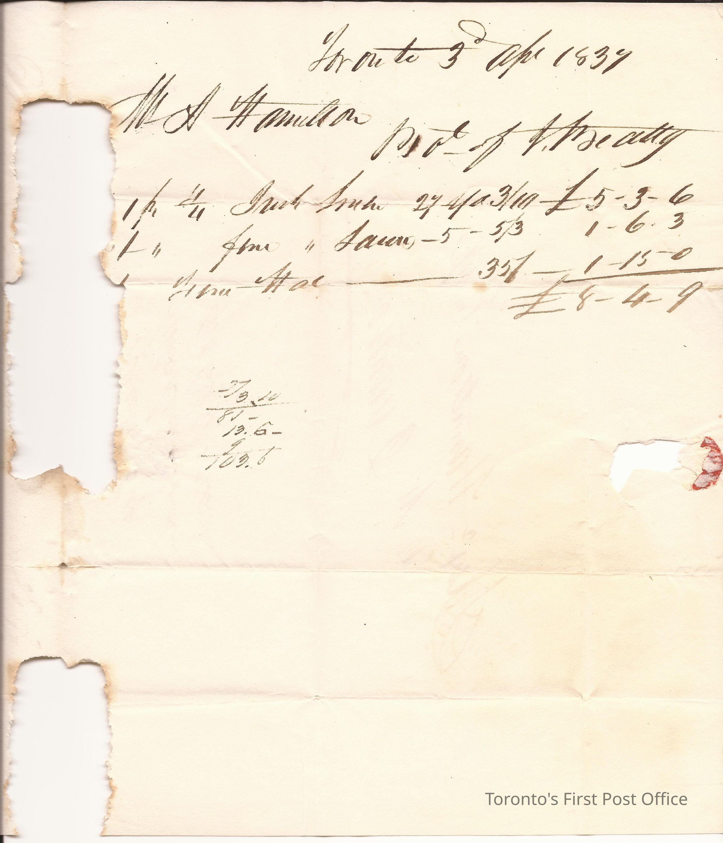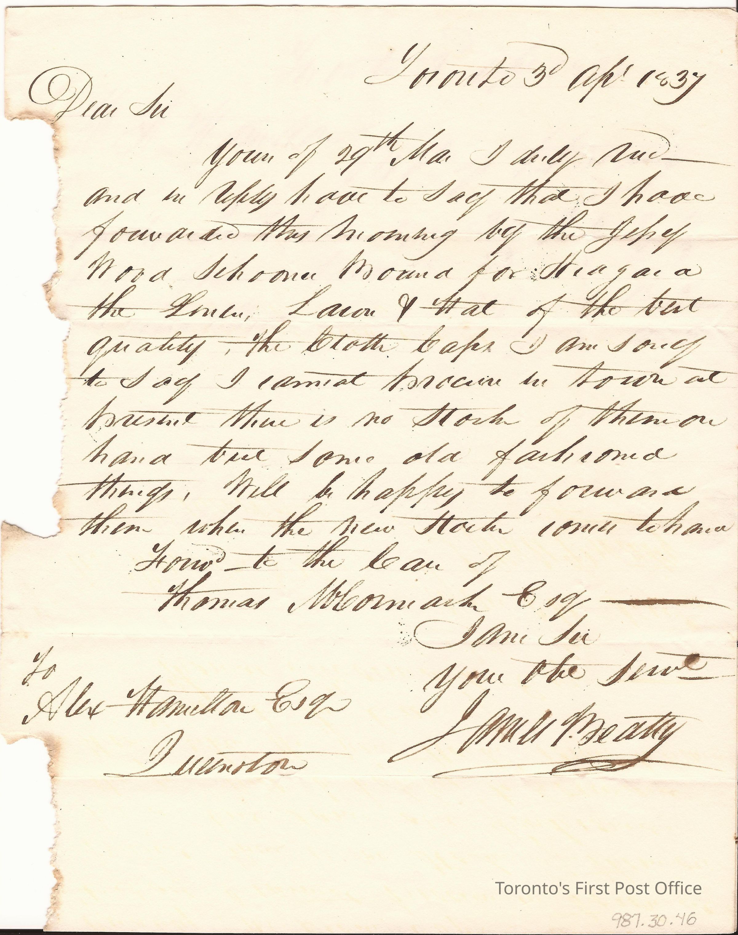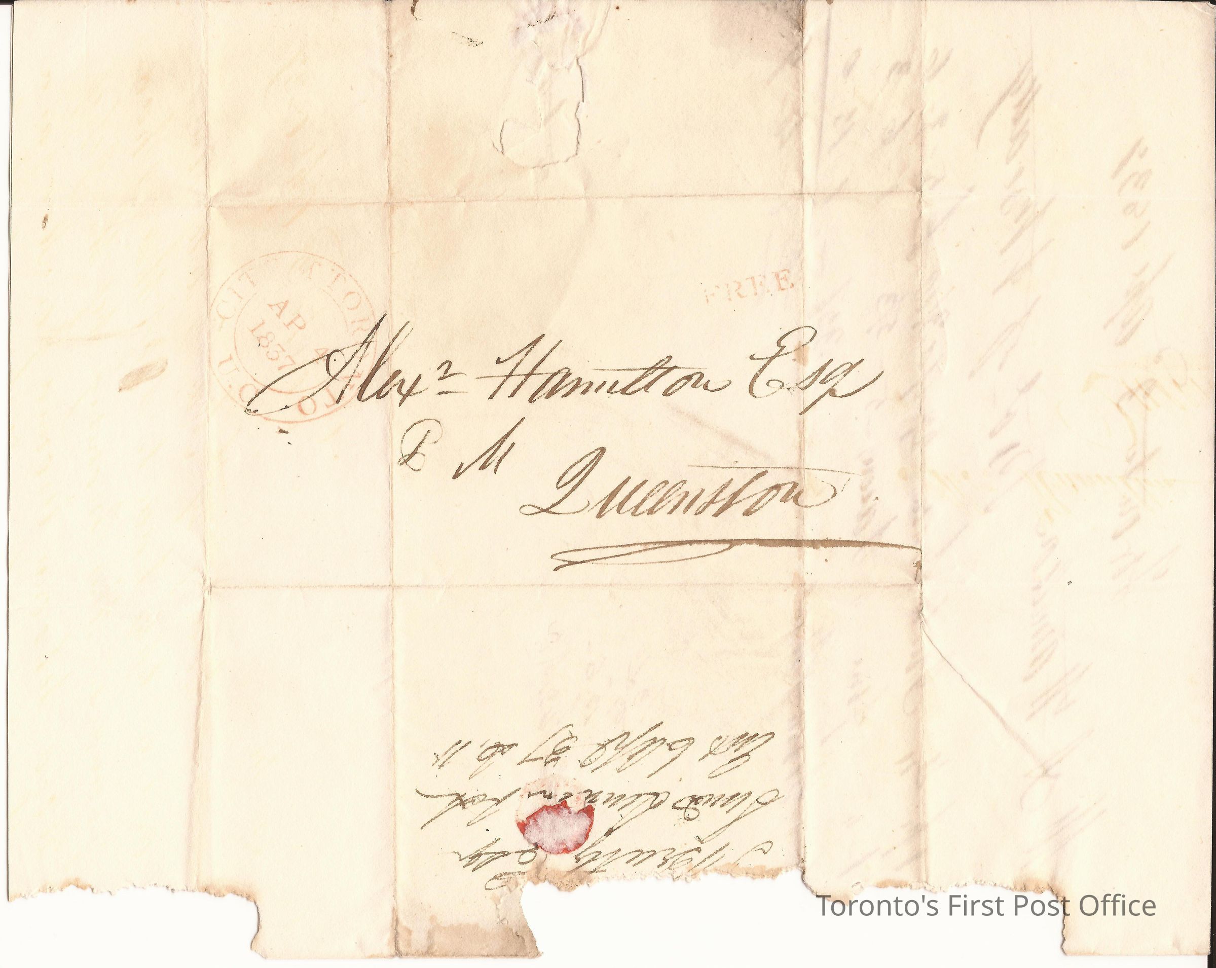 Letter to Alexr. Hamilton Esq., Queenston; from James Beatty; dated: Toronto 3 Apr 1837; postmarks: "CITY OF TORONTO AP 4 1857 U.C.", "FREE"; remnant of red wafer seal; re: Beatty, a Toronto merchant, advises that he shipped clothing to Hamilton; a dubious use of free postage; watermark "EC 1831, surmounted by three plumes.Update Date