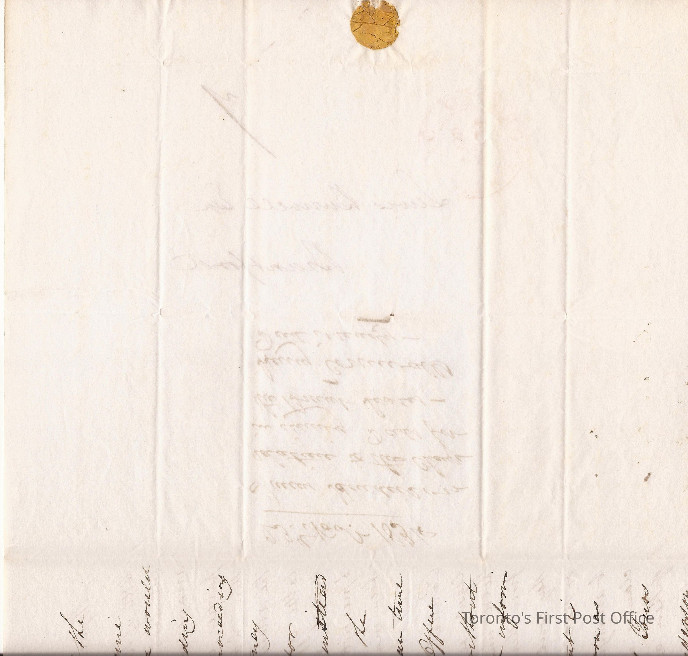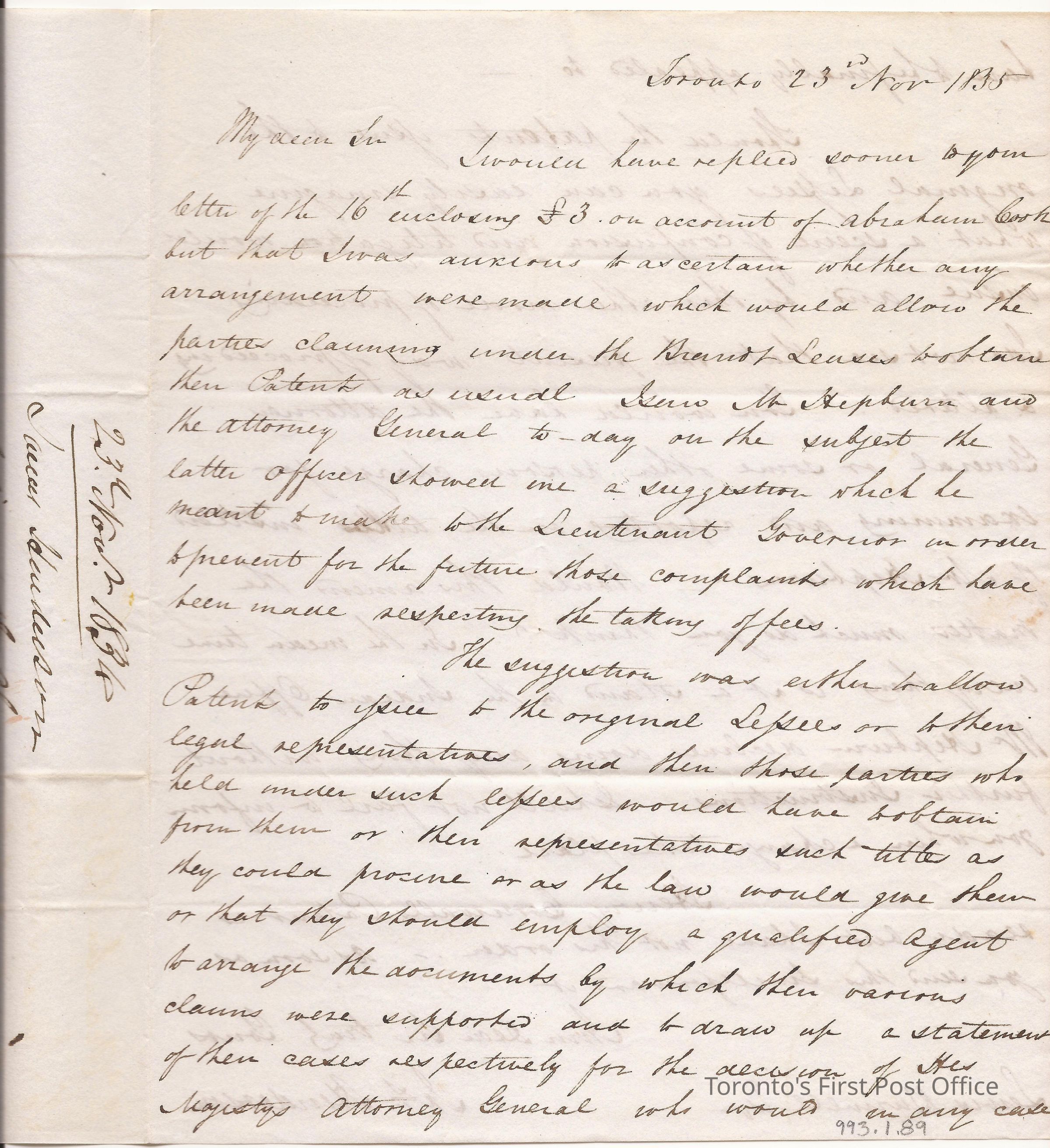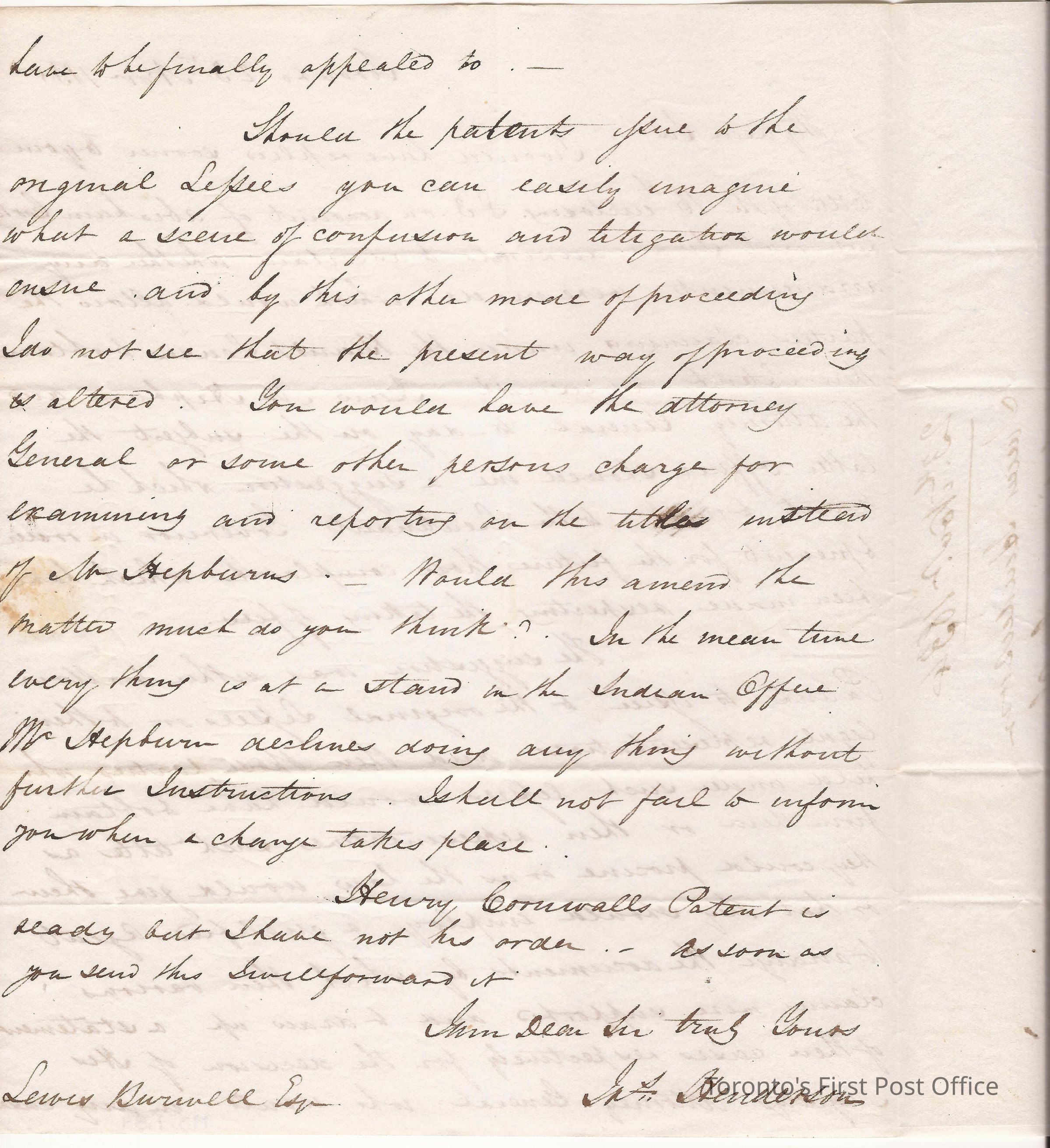 Letter and cover; from James Henderson, Commissioner of Crown Lands Office; to Lewis Burwell, Deputy Surveyor at Brantford; dated: 23 Nov 1835; marks: red "CITY OF TORONTO", "NO 24 1835"; rated "7"; 3 pp.; yellow wafer seal; watermark: "ROBERT WEIR-CARRON MILL 1833"; re: proper procedures of releasing documents for land leases or purchases.Dimensions