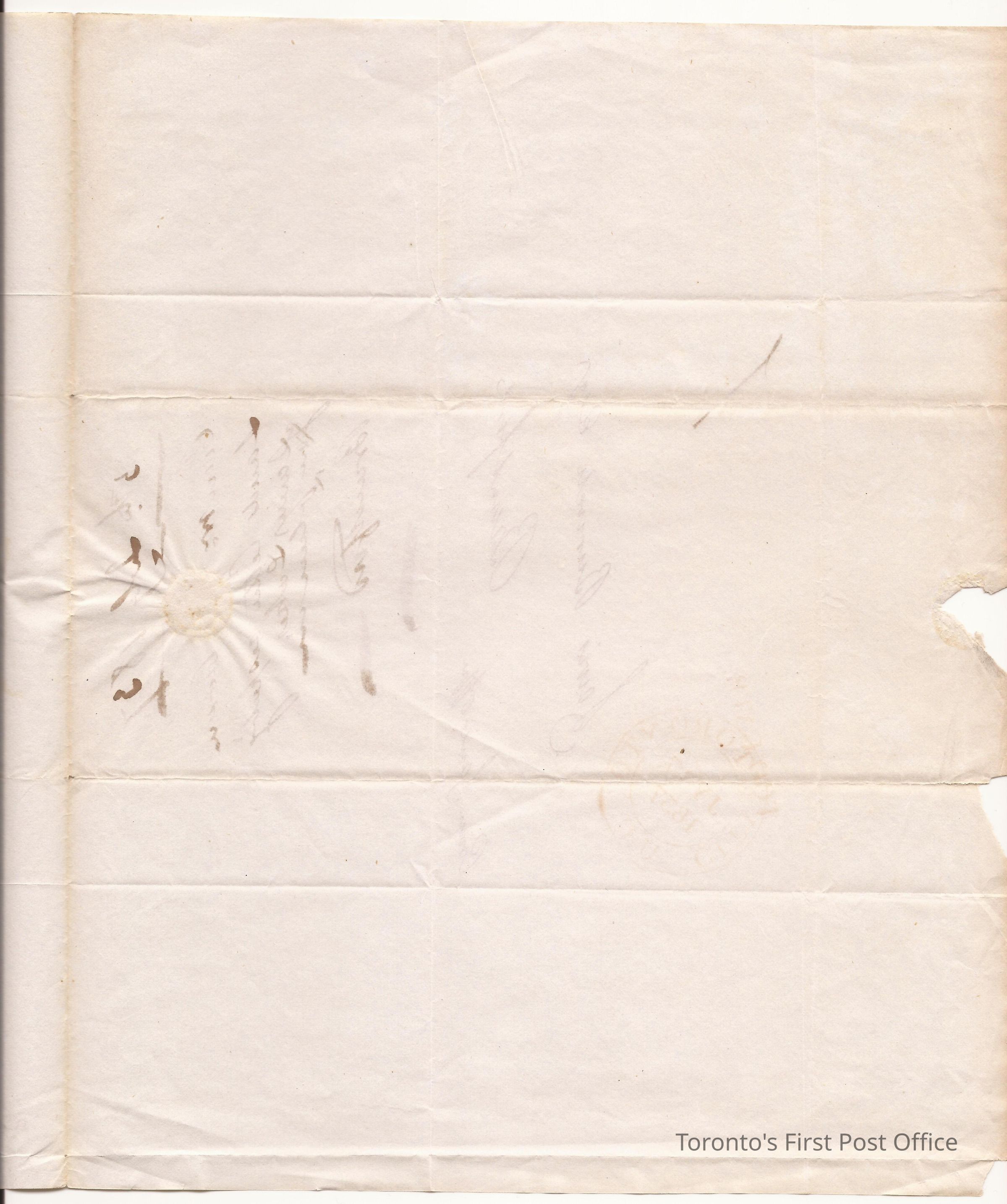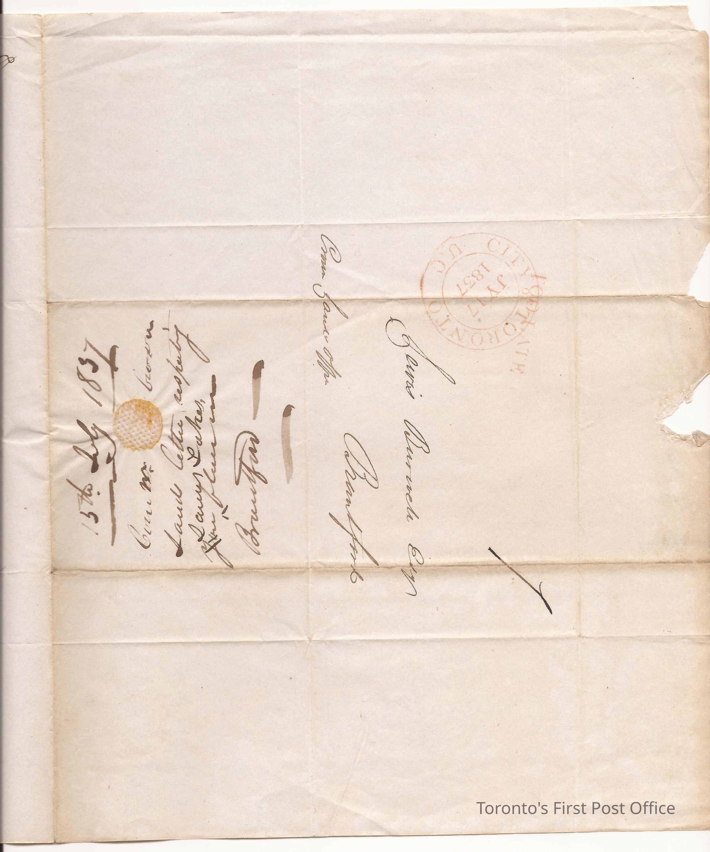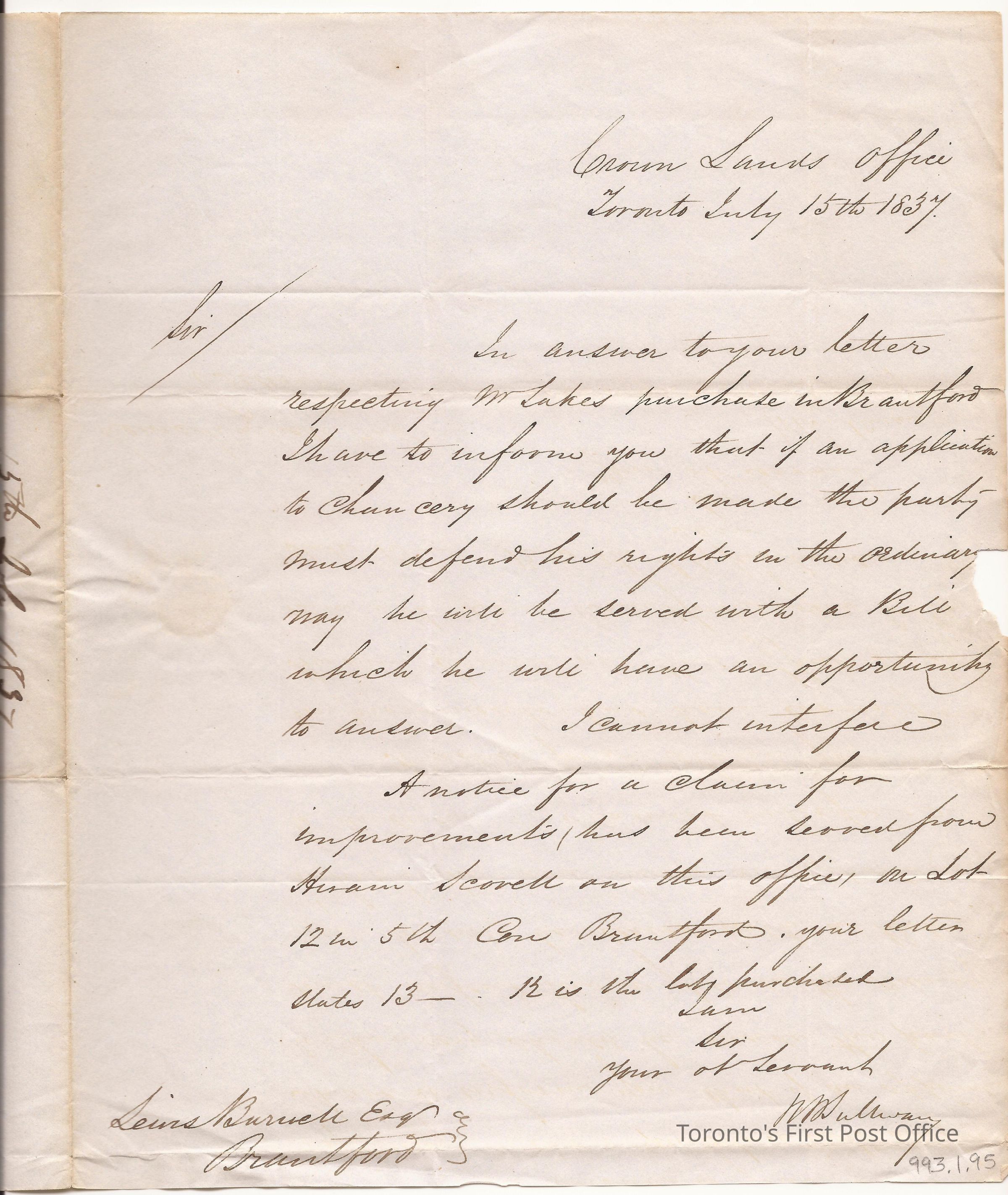 Letter and cover from Robert Baldwin Sullivan, Commissioner of Crown Lands; to Lewis Burwell, Deputy Surveyor at Brantford; dated: 15 July 1837; marks: red "CITY OF TORONTO", "JY 17 1837", "TOO LATE"; rated: "7"; 2 pp.; re: proper procedure if land purchase made; black ink; yellow wafer seal.Update Date