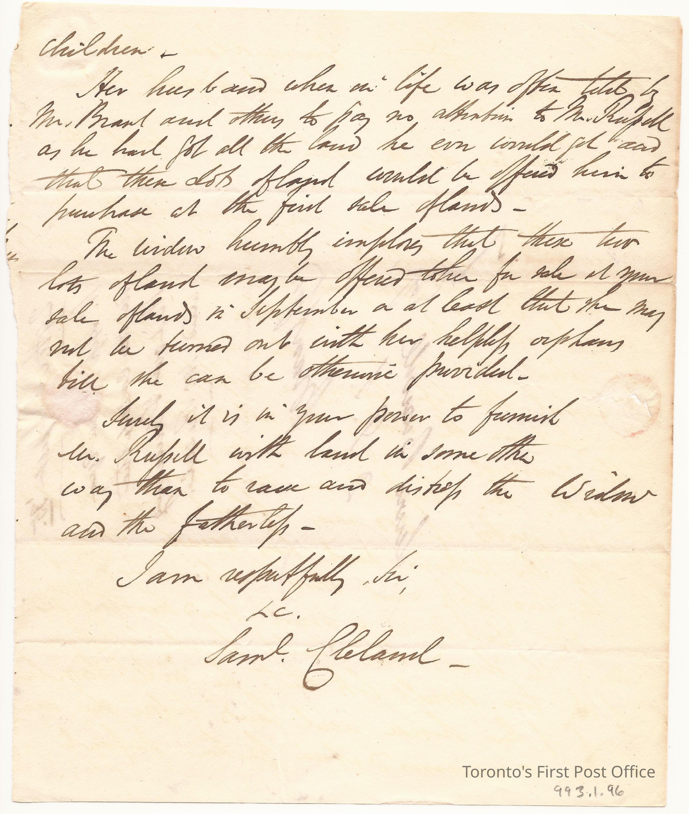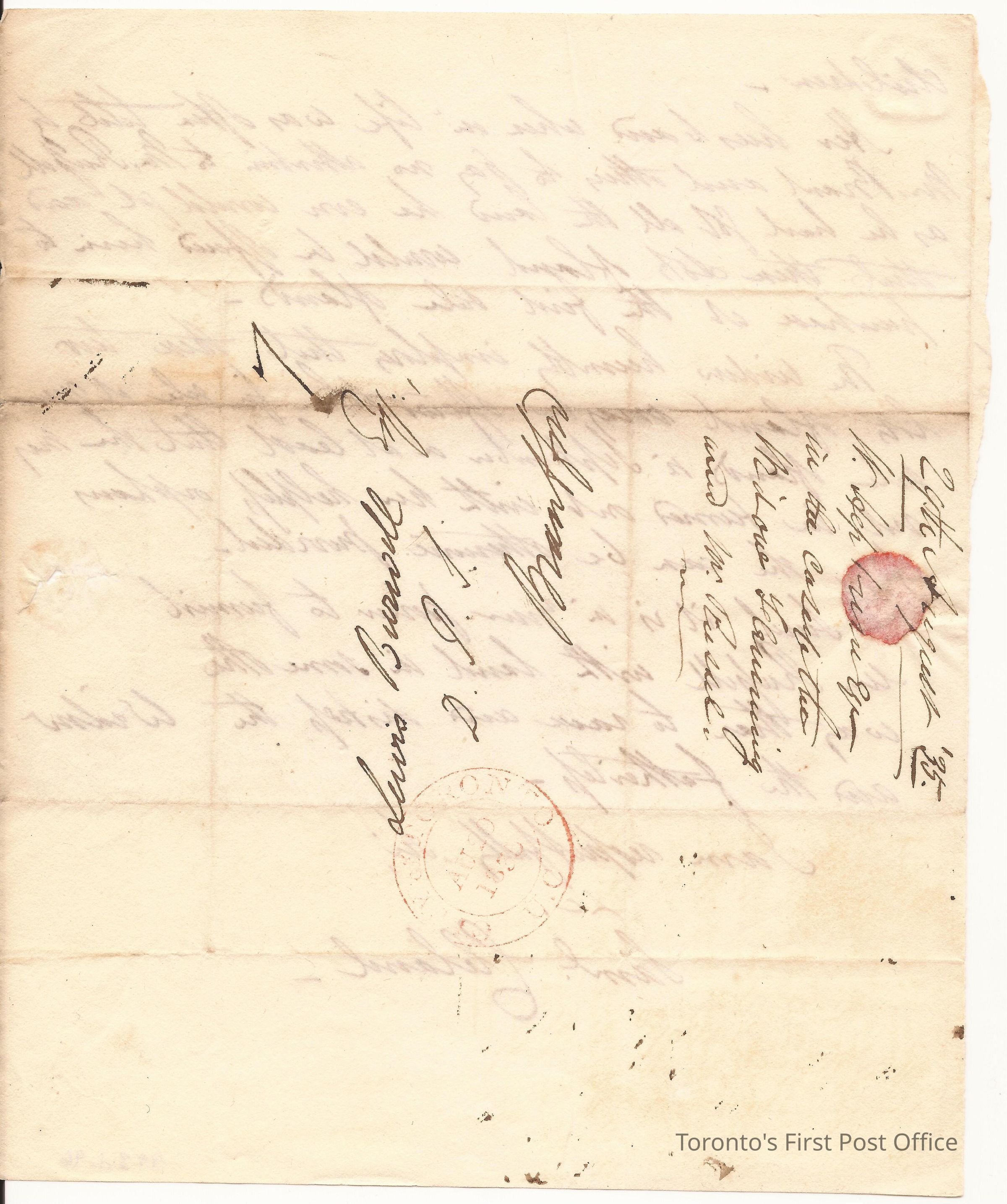 Letter and cover; from Samuel Cleland; to Lewis Burwell, Deputy Surveyor at Brantford; marks: red "CITY OF TORONTO", "AU 20 1835"; rated: "7"; 2 pp.; last page of letter only; red wafer seal; re: allowing the widow with her fatherless children to purchase the lots, rather than Mr. Russell who already has as much as he would ever get.Dimensions