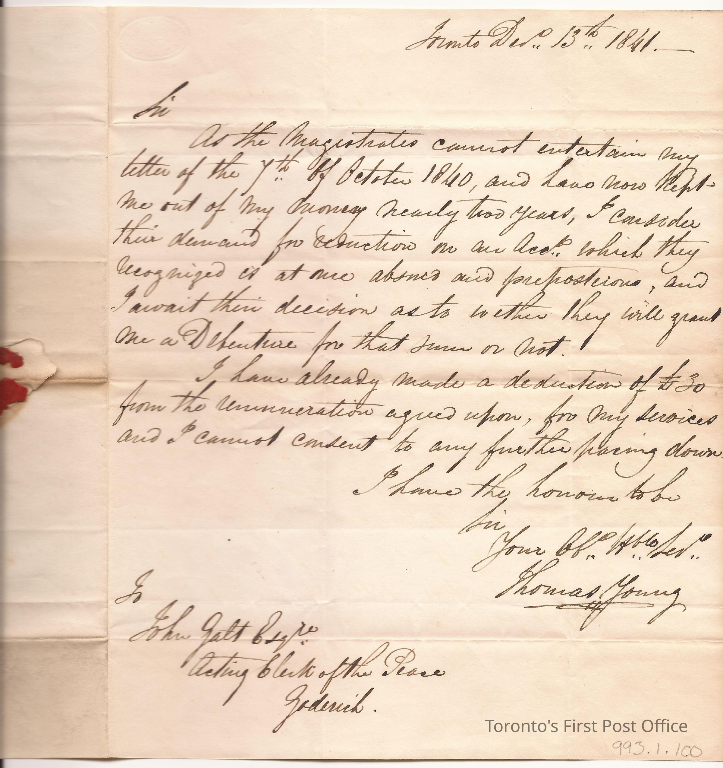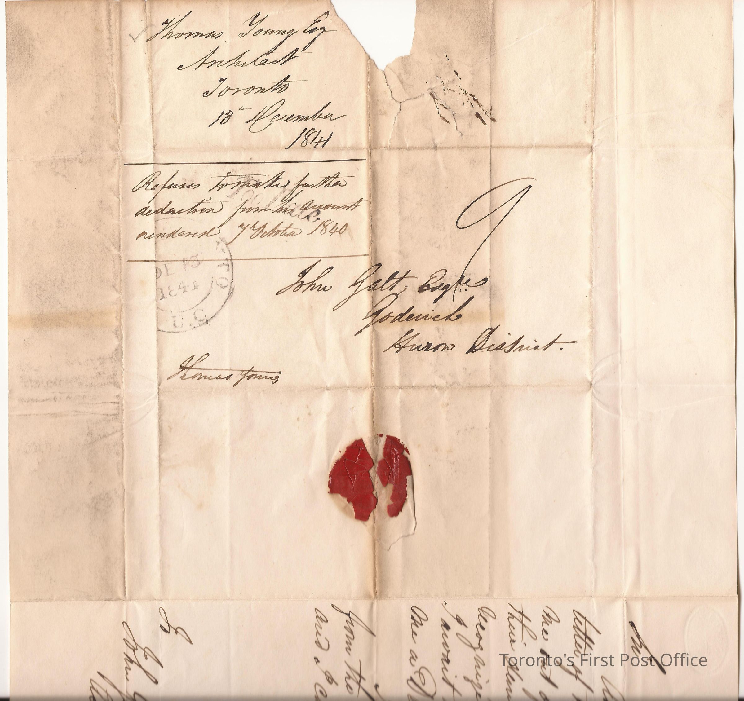 Letter and cover; from Thomas Young, Architect; to John Galt, Esq, Acting Clerk of the Peace at Goderich, in the Huron District; dated Toronto 13 Dec 1841; marks: black "CITY OF TORONTO U.C.", "13 DE 1841", "TOO LATE"; 2 pp.; red wax seal; black ink; re: Young has waited for payment for two years and finds a request for a deduction absurd; probably re: Young's work as architect for jail at Goderich.Update Date