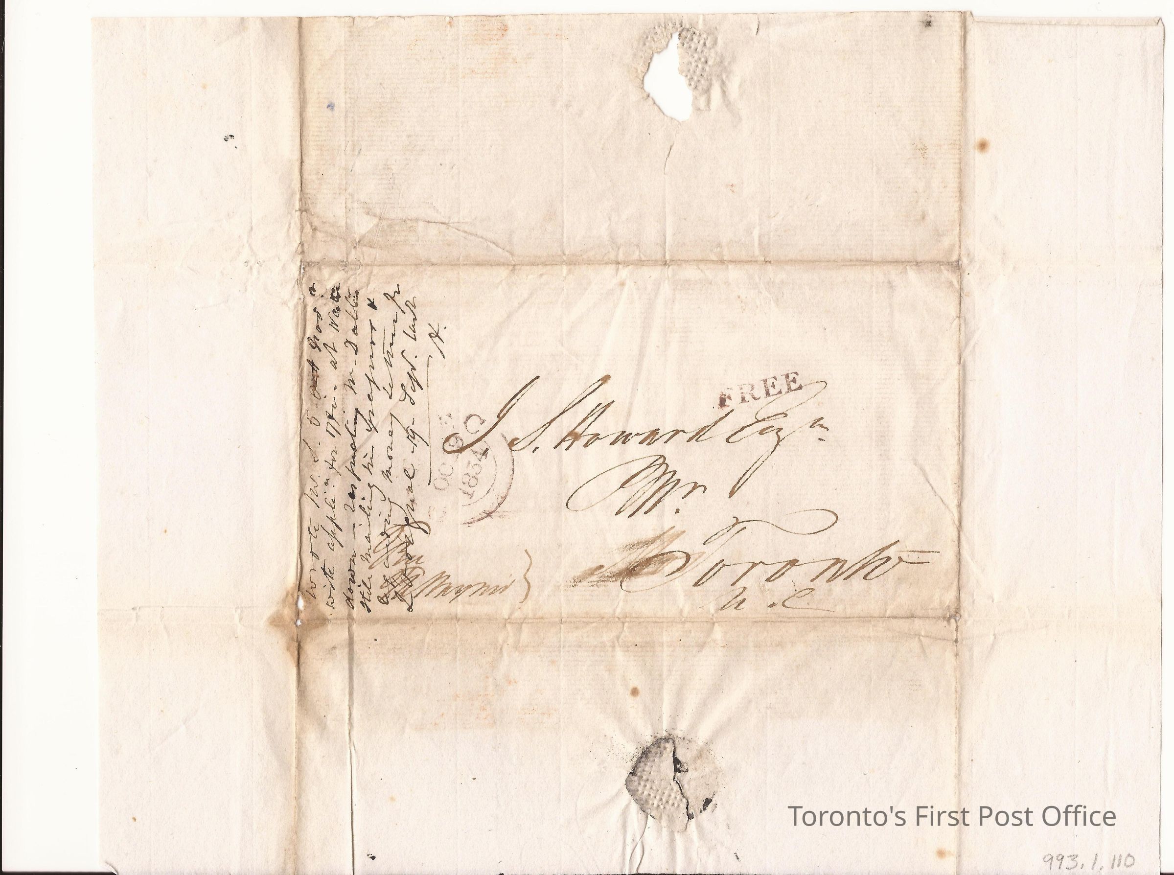 Letter and cover; from T.A. Stayner, Deputy Postmaster General of British North America; to J.S. Howard, Postmaster, Toronto; "FREE"; cancelled at Quebec Oct 19, 1834; note by JSH on cover; black ink; black wafer seal.Dimensions
