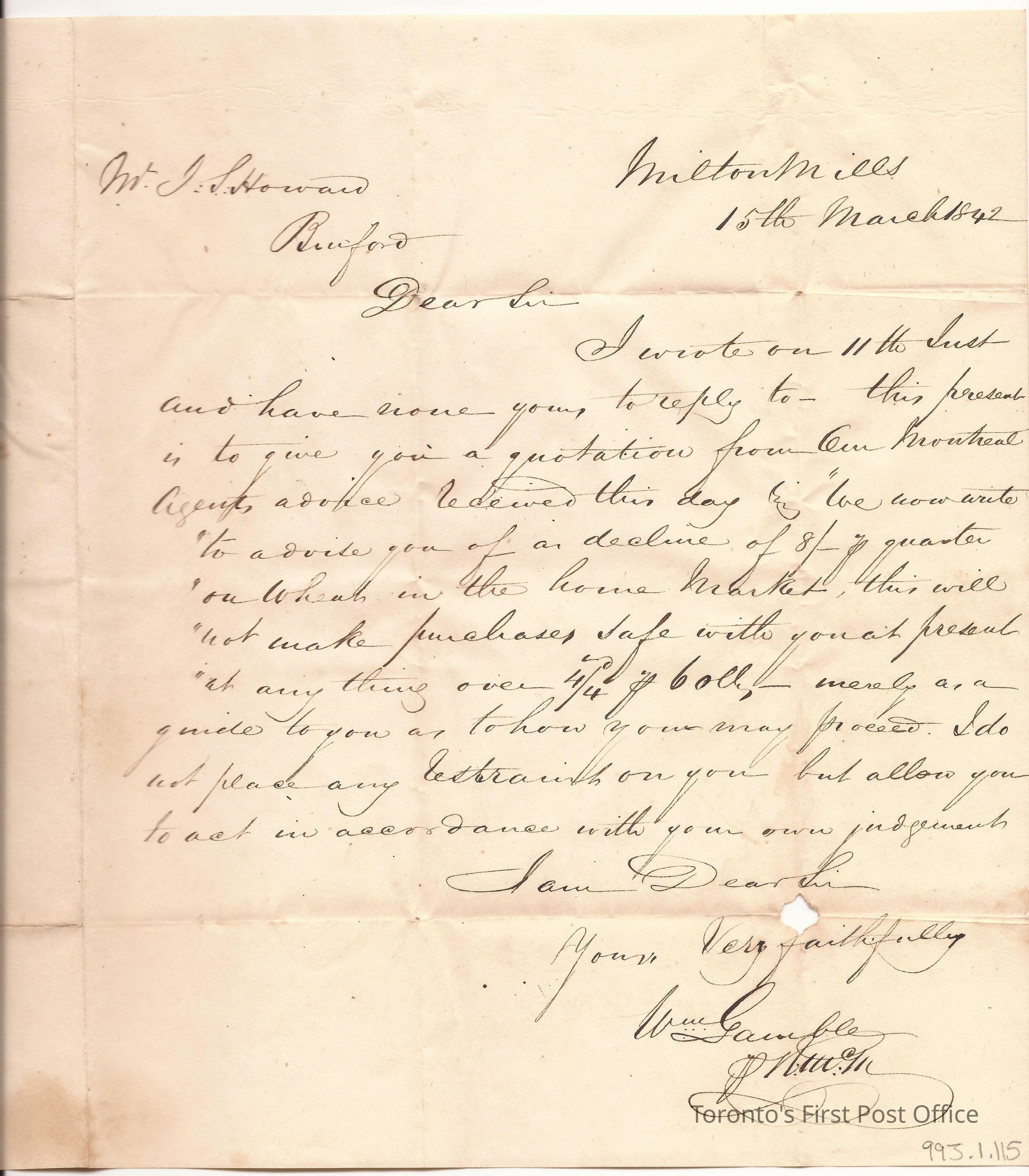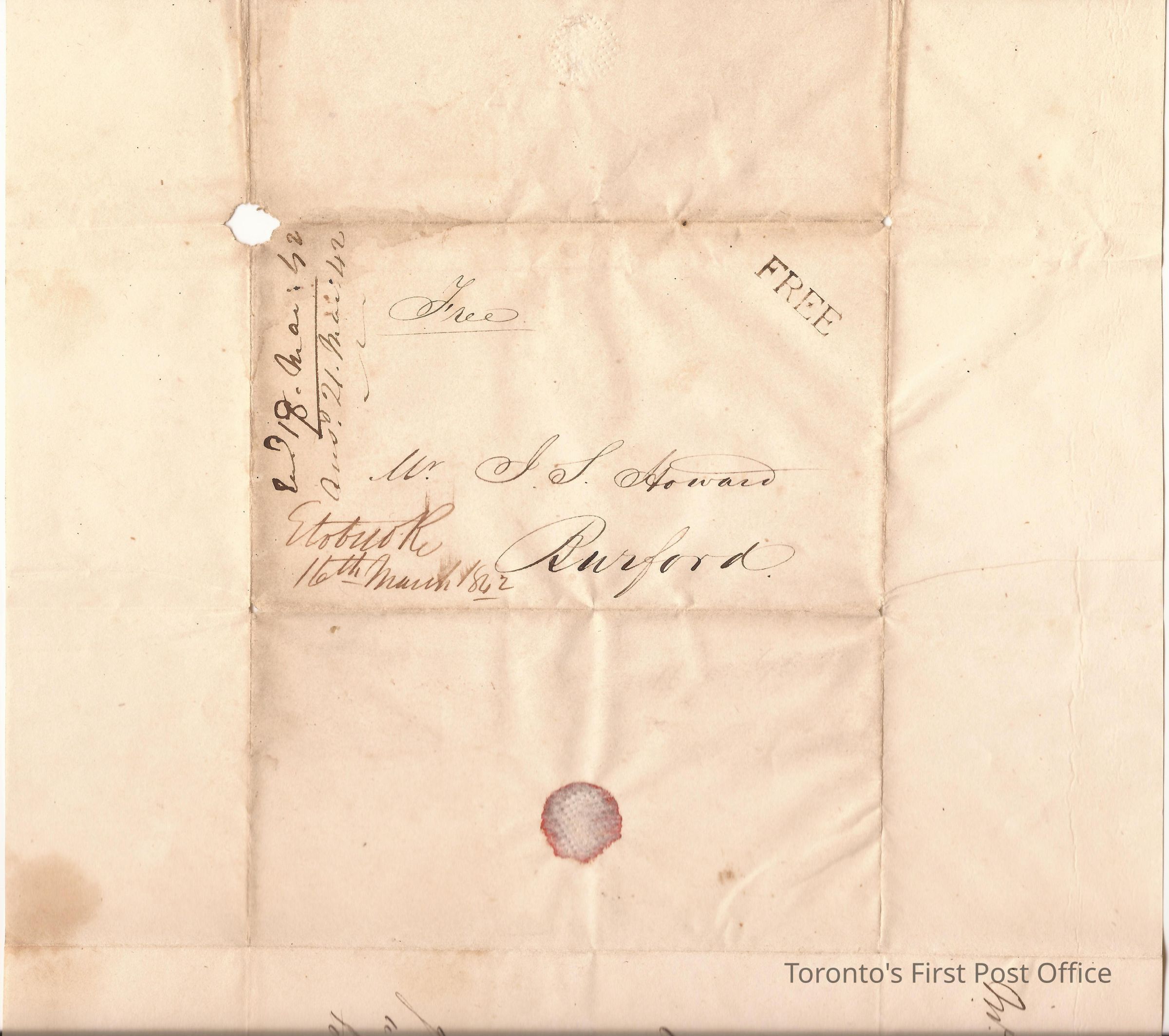 Letter and cover from Wm. Gamble, Milton Mills; to J.S. Howard, Esq., Burford; dated 15 March 1842; marks: "FREE"; red wafer seal; re: decline in wheat prices.Dimensions