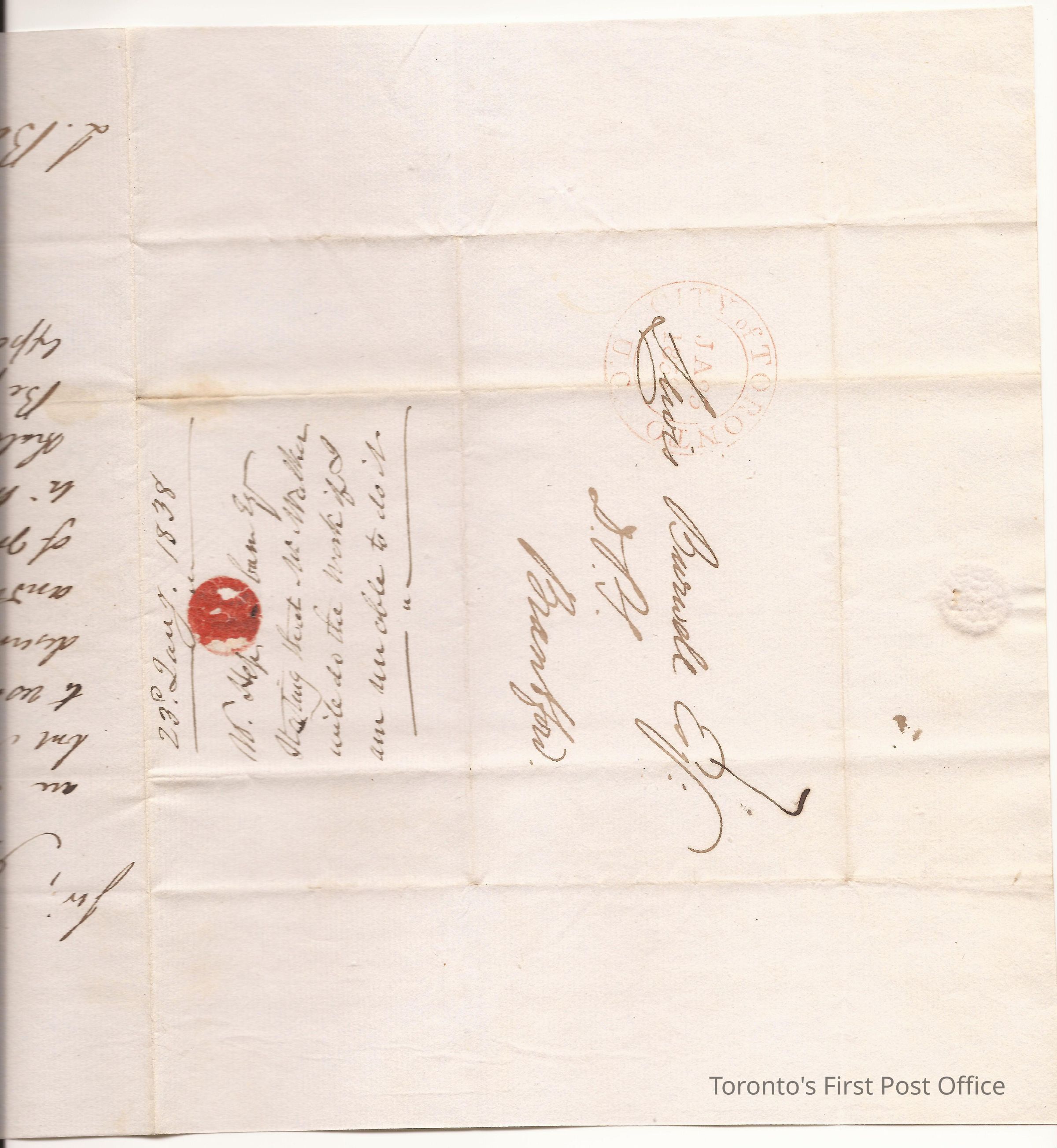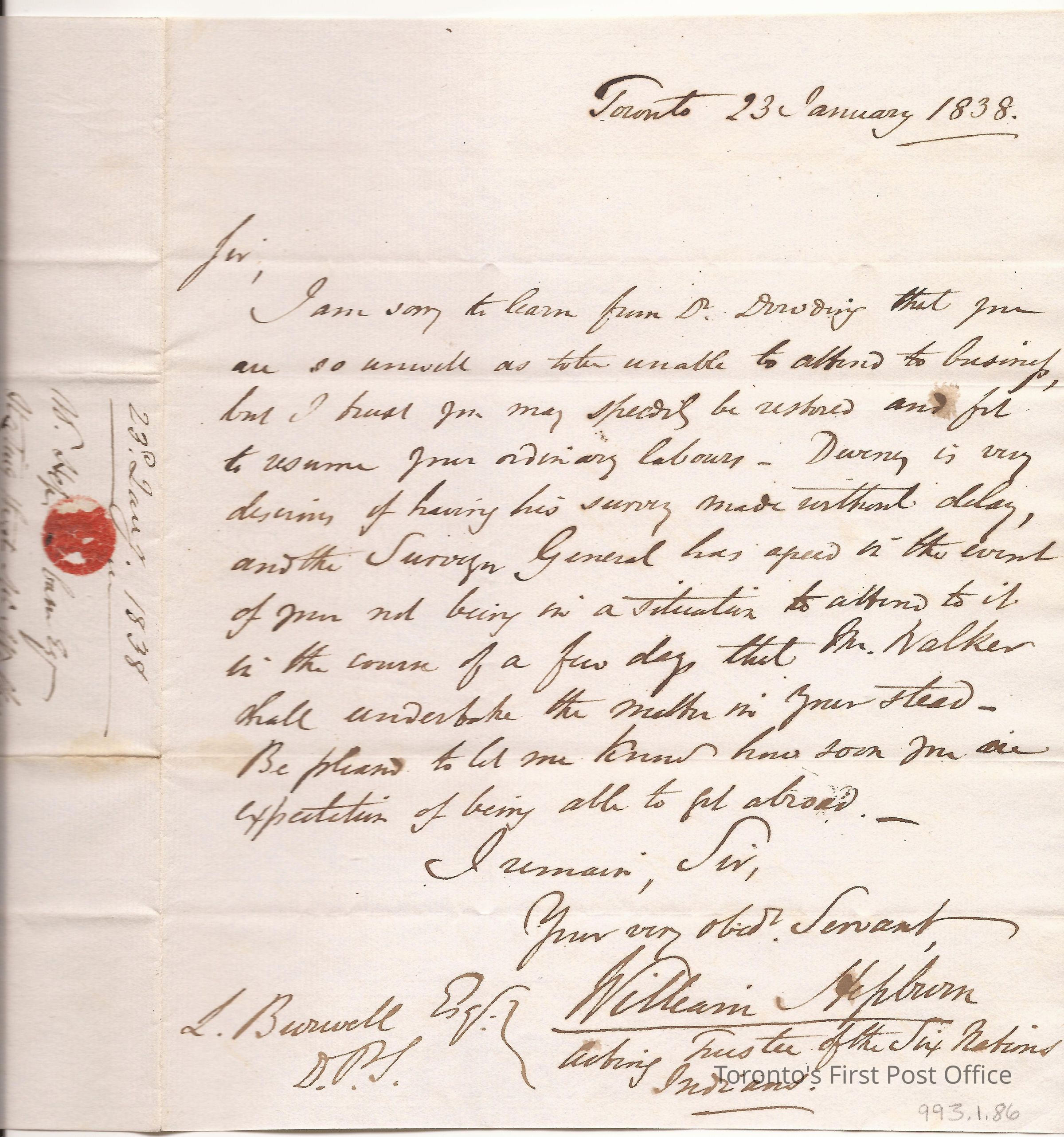 Letter and cover; from William Hepburn, "Acting Trustee of the Six Nations Indians"; to Lewis Burwell Deputy Provincial Surveyor at Brantford; dated: 23 January 1838; marks: red "CITY OF TORONTO", "JA 25 1838"; rated: "7"; 2 pp.; red wafer seal; re: wishing Burwell a speedy recovery so he can resume his regular duties.Update Date