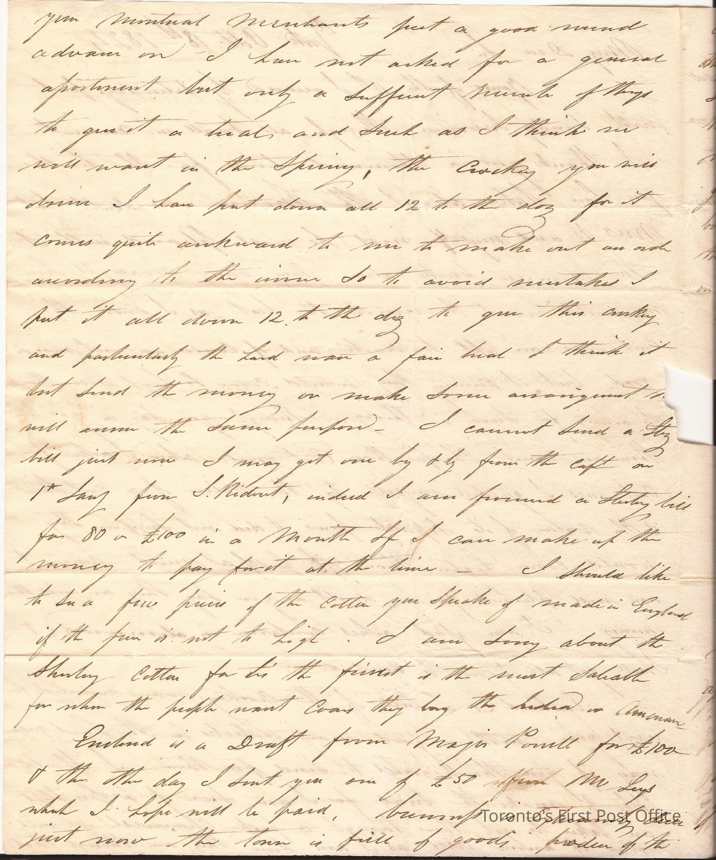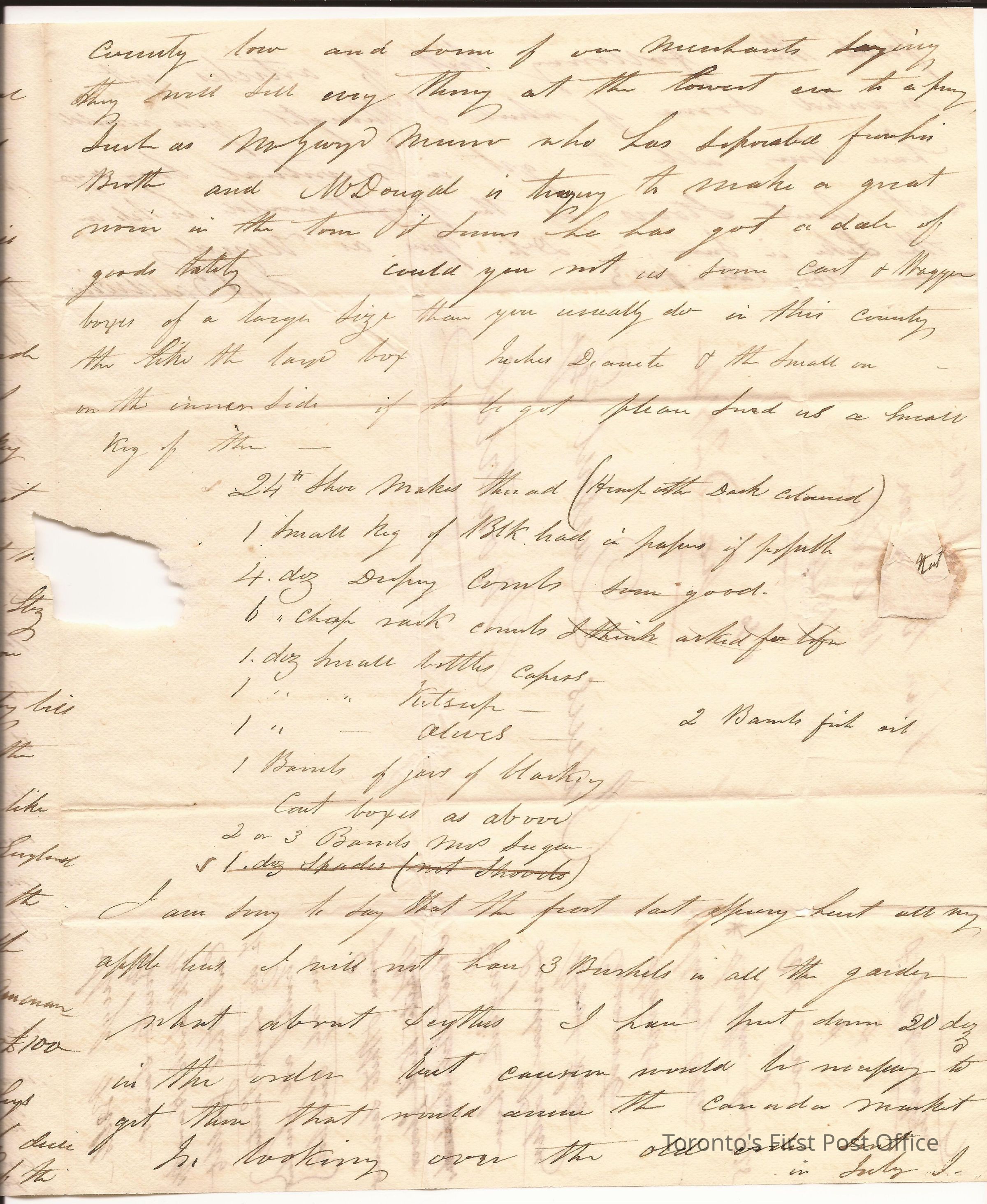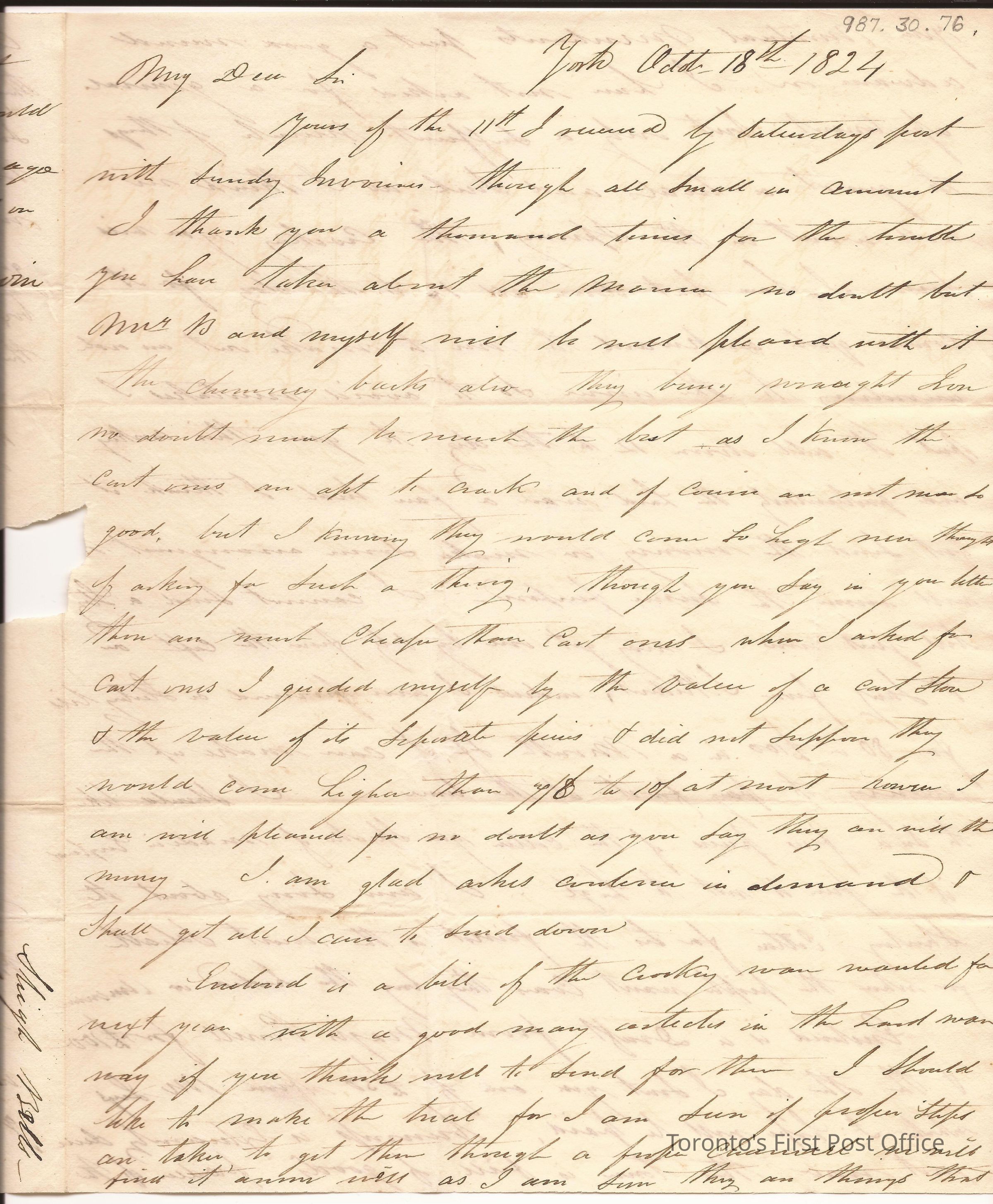 Letter from John S. Baldwin, York; to Julius H. Quesnel, Montreal; dated: 18 October 1824; postmarks: "Paid 2H4" in red ink; watermark: "H CRICHTON 1821"; yellow wafer seal; re: reference to the specific of merchandise items were likely in the 1830s.Update Date