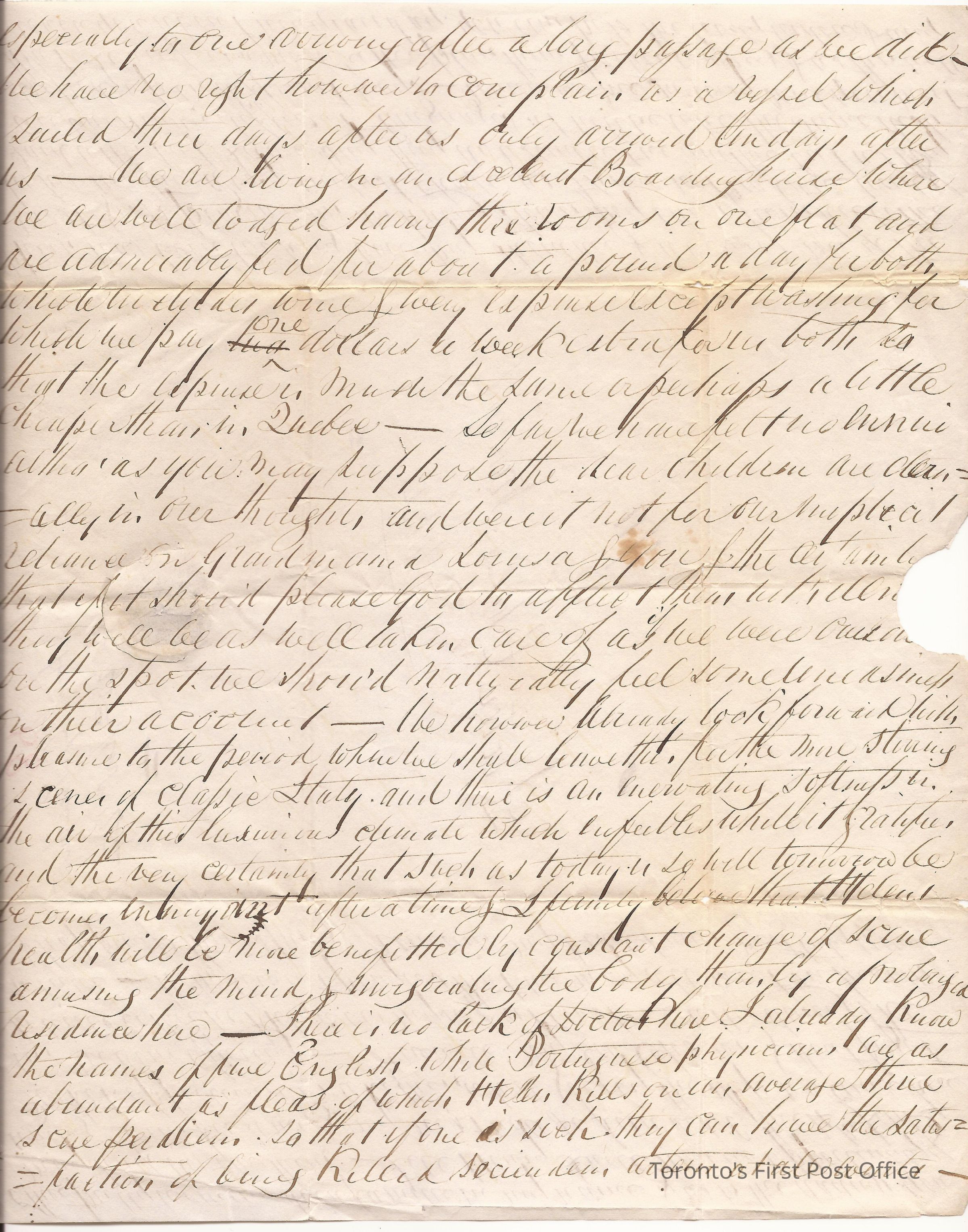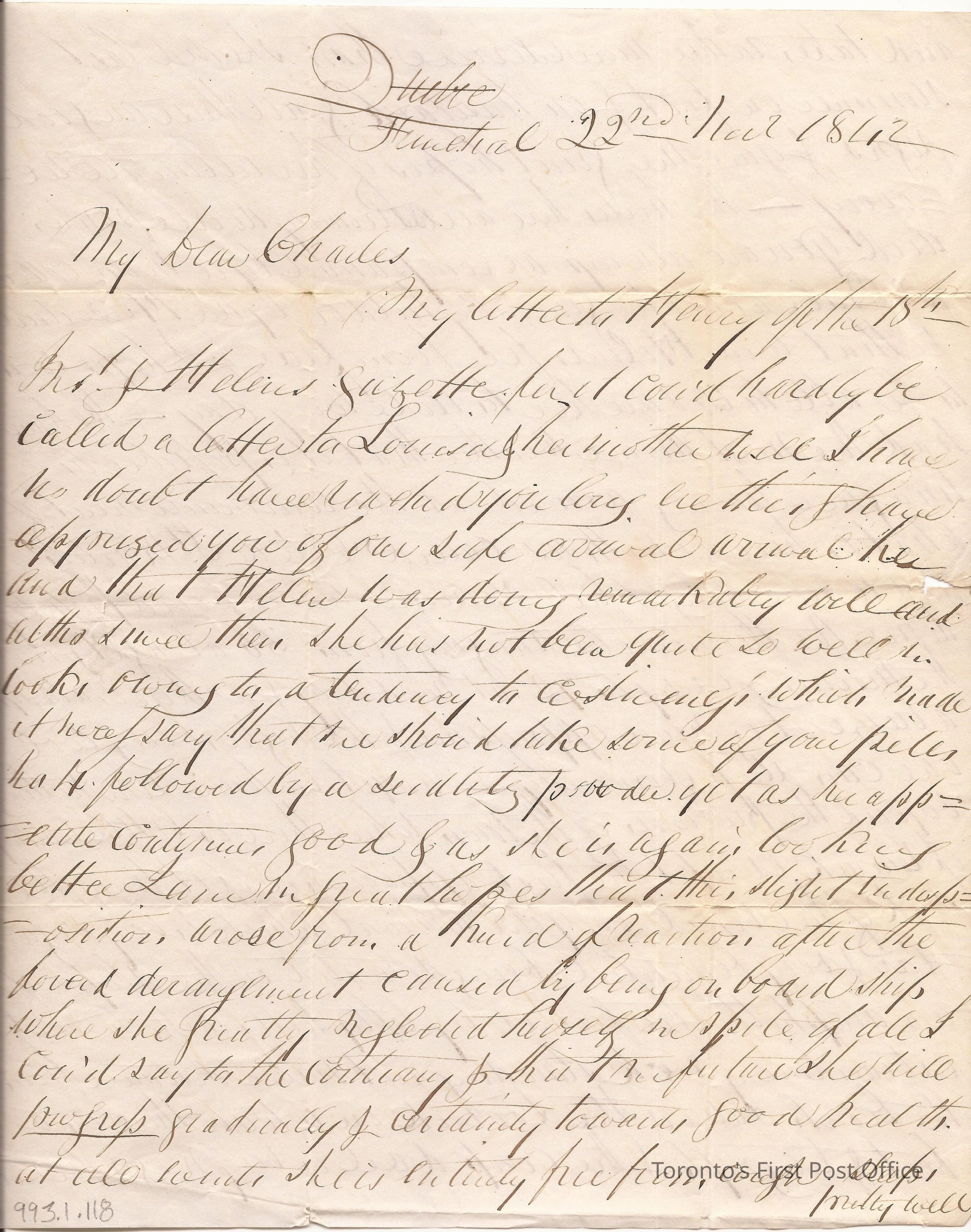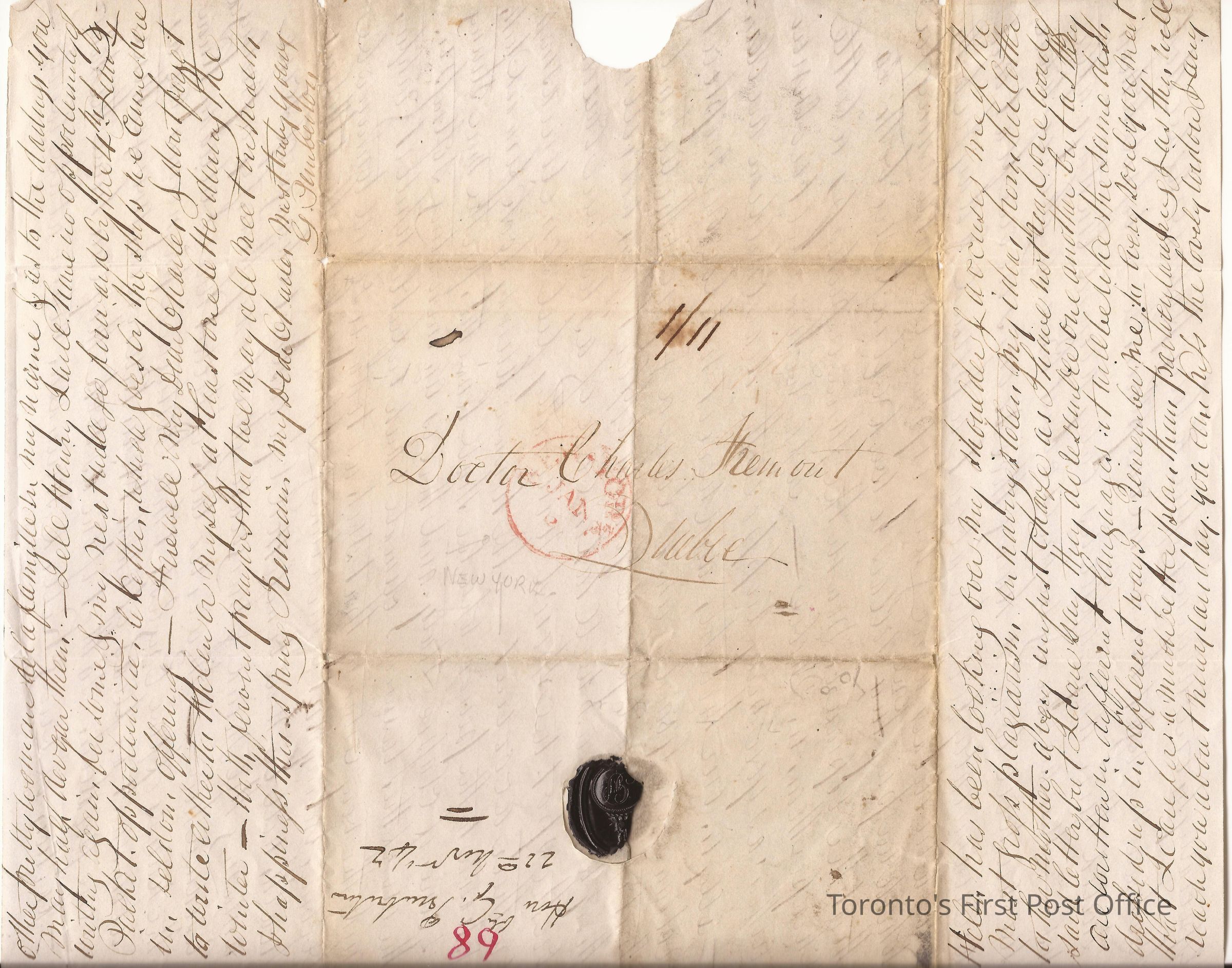 Letter and cover; to Dr. Charles Fremont, Quebec; dated Quebec 22 November 1842; from Hon. G. Pemberton; "68" in red ink manuscript; black sealing wax "2GP"(?); re: Pemberton's safe arrival in the American South where he had gone for the winter because of "Helen's" health; black ink; watermark: "J GREEN & SON 1839".Dimensions
