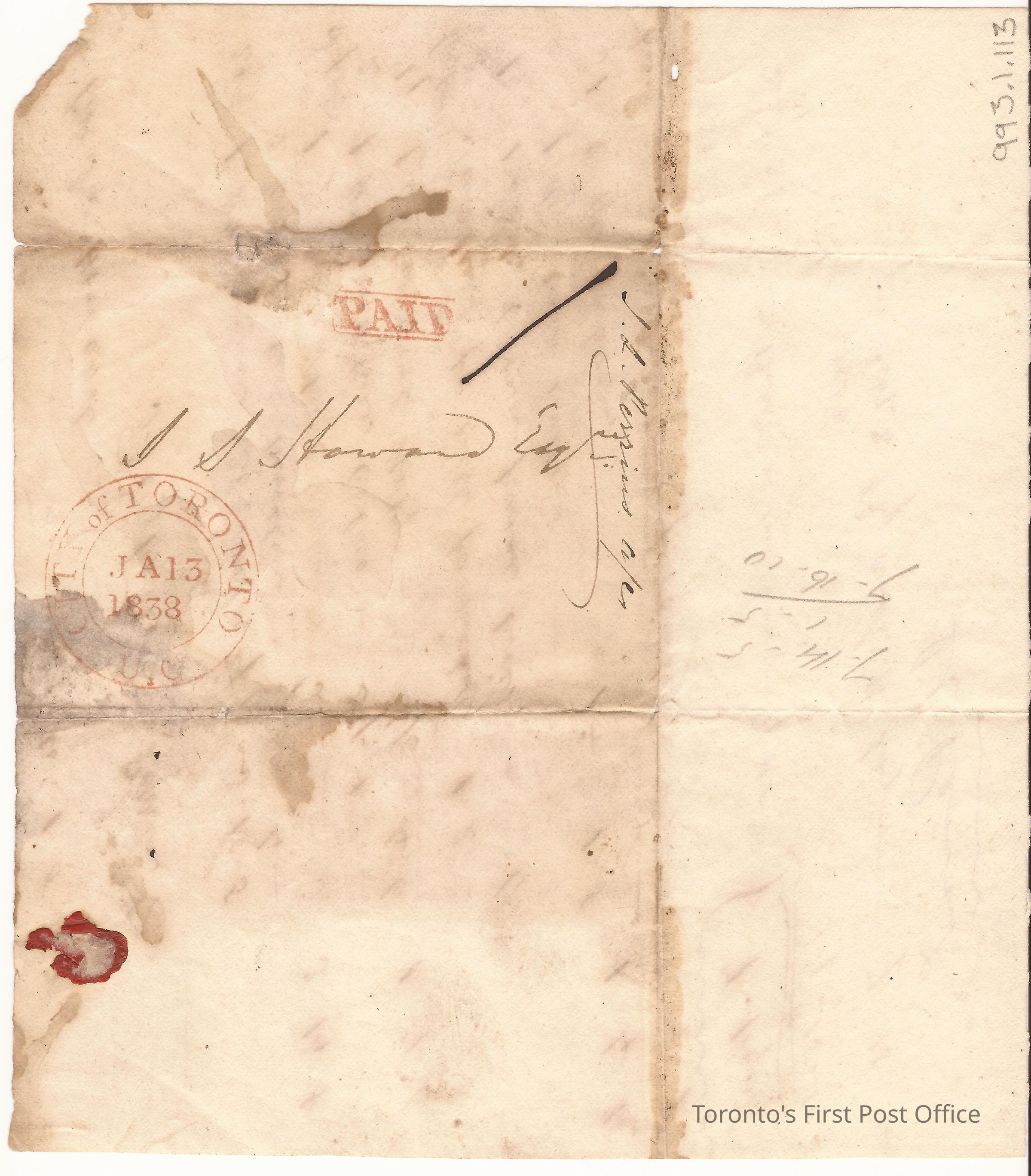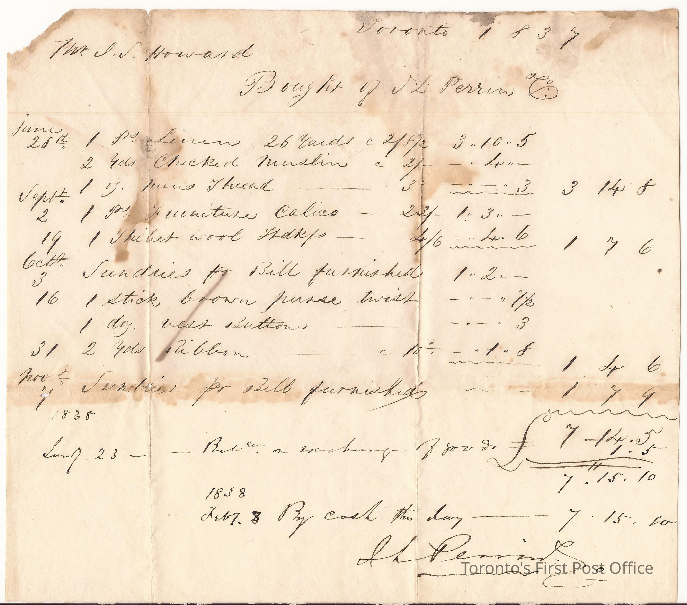 Letter and cover from J.L Perrin & Co., drygoods merchants, Toronto; to J.S. Howard, Esq.; dated: JA 13/1838; re: account from June to November 1837; marks: double ringed "CITY OF TORONTO U.C.", "PAID".Dimensions