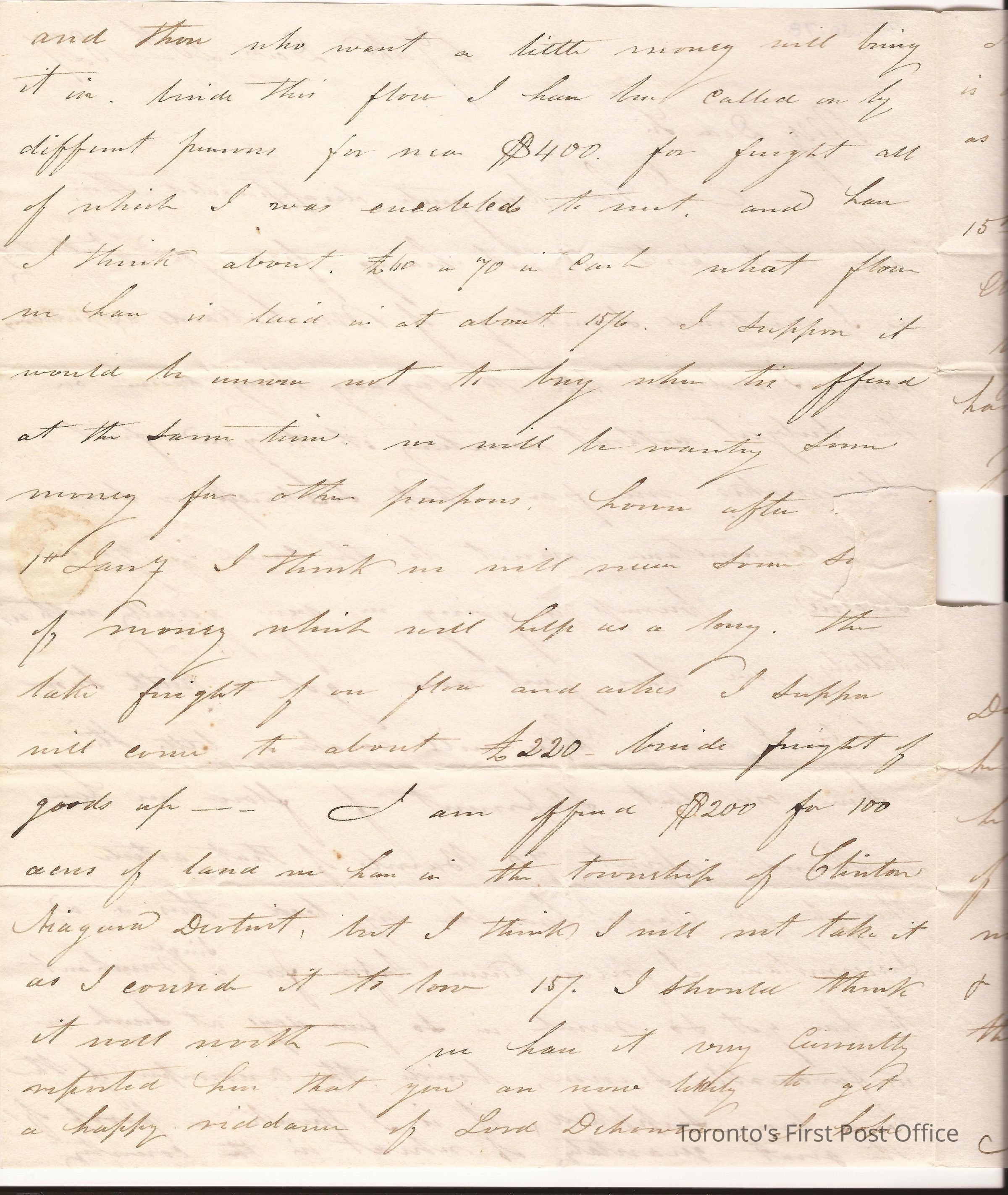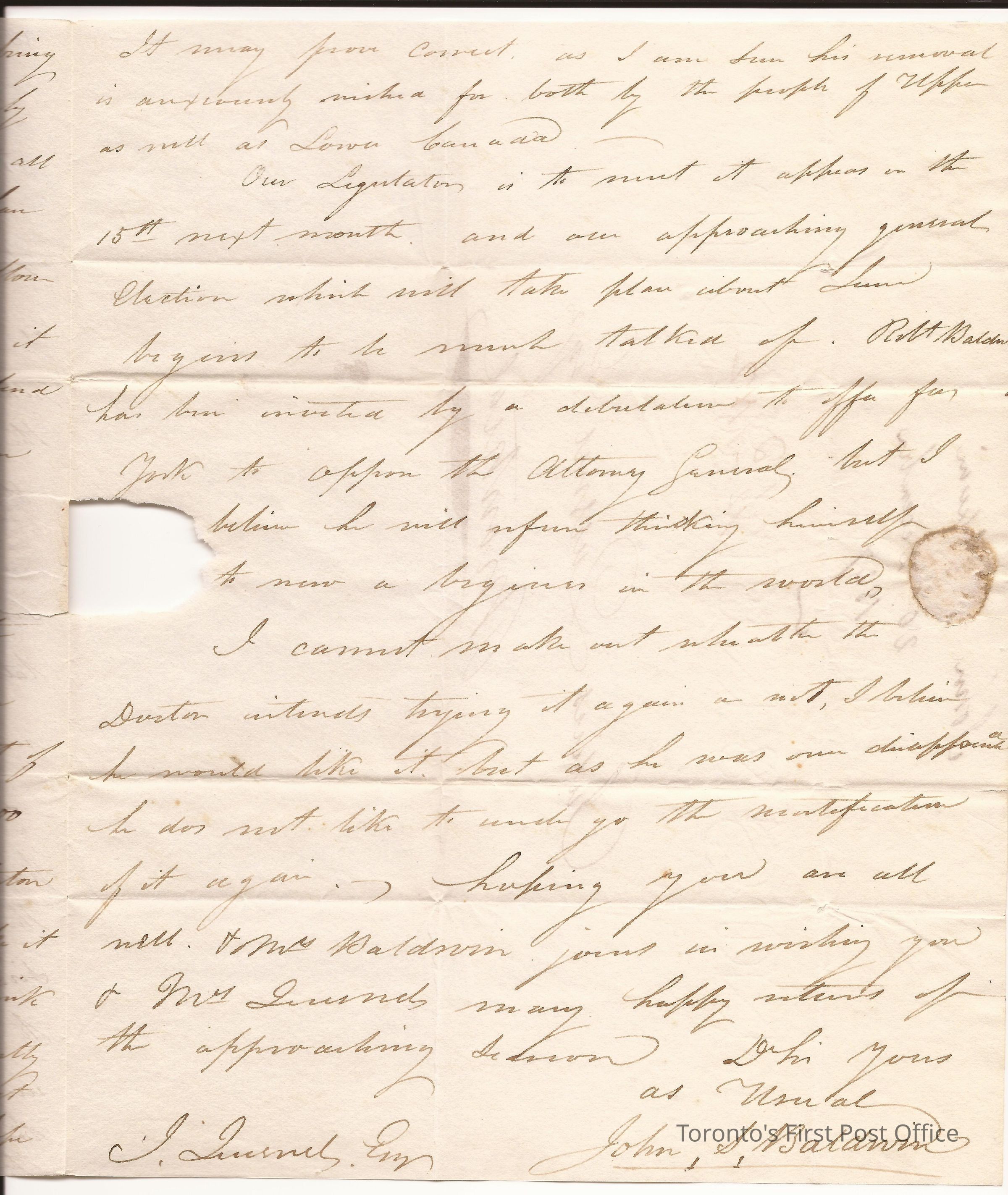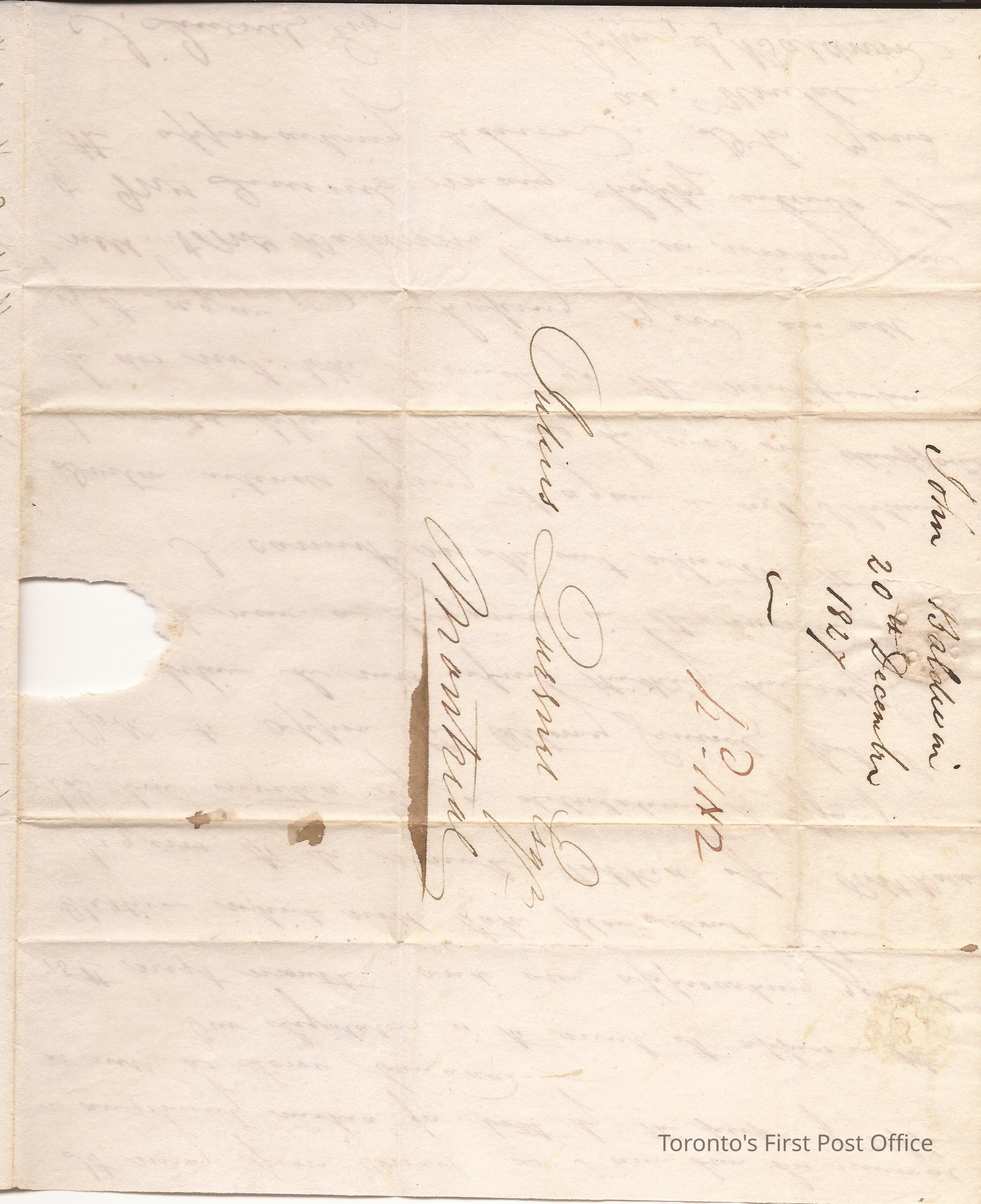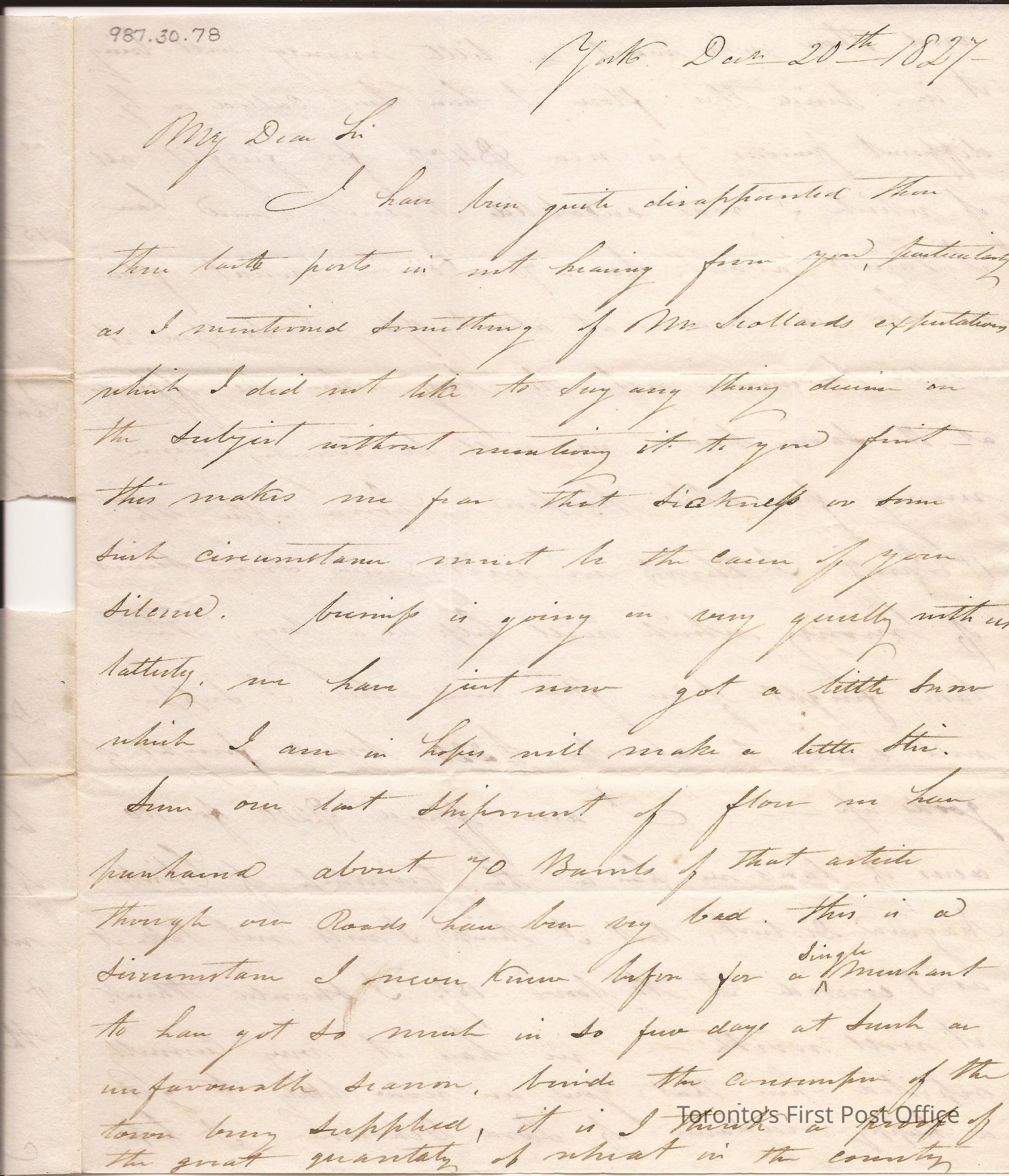 Letter from John S. Baldwin, York; to Julius H. Quesnel, Montreal; dated: 20 December 1827; yellow wafer seal; watermark: "J GREEN & SON 1826"; re: reference to purchase of about 70 barrels of flour, something about election.Update Date