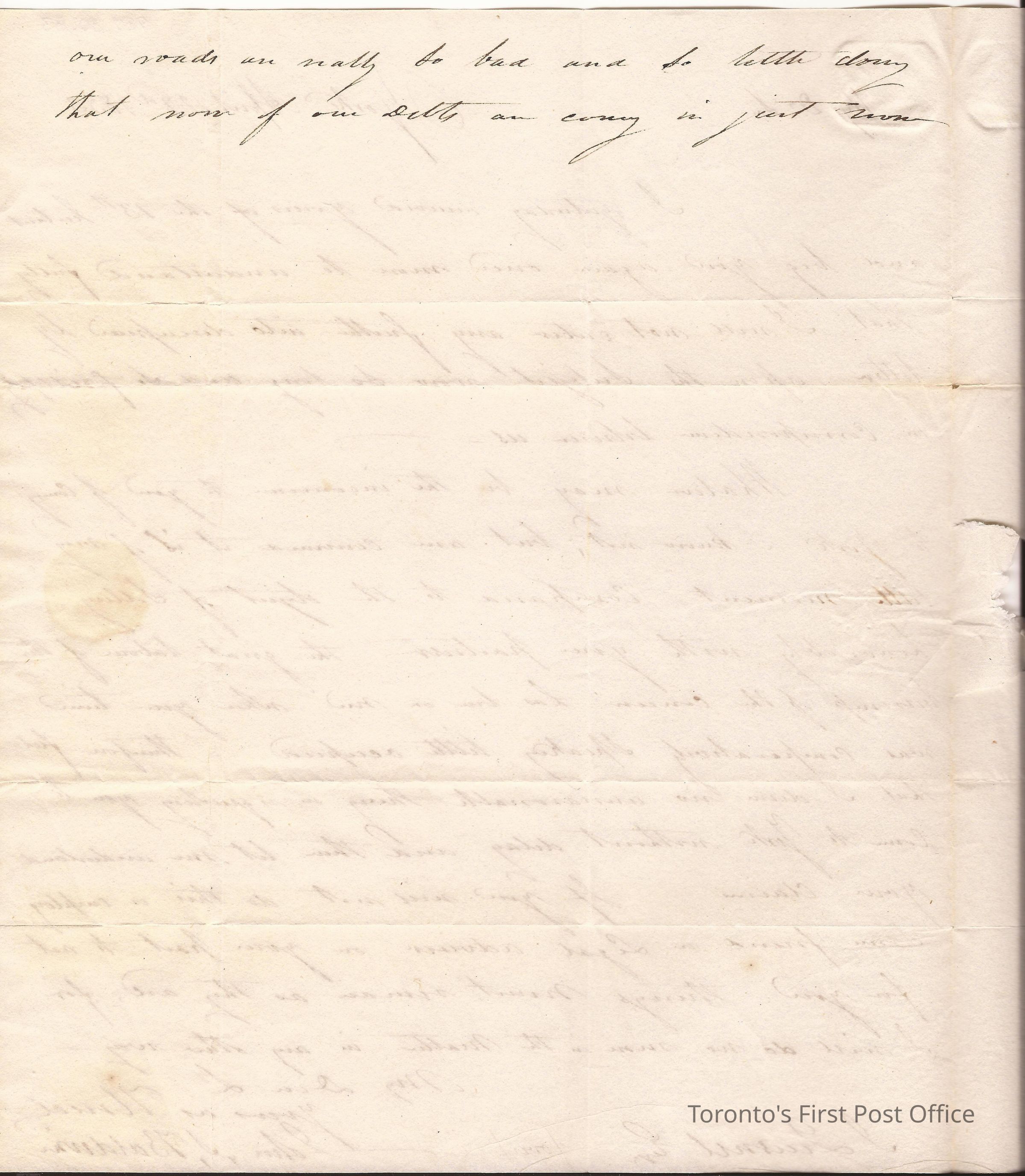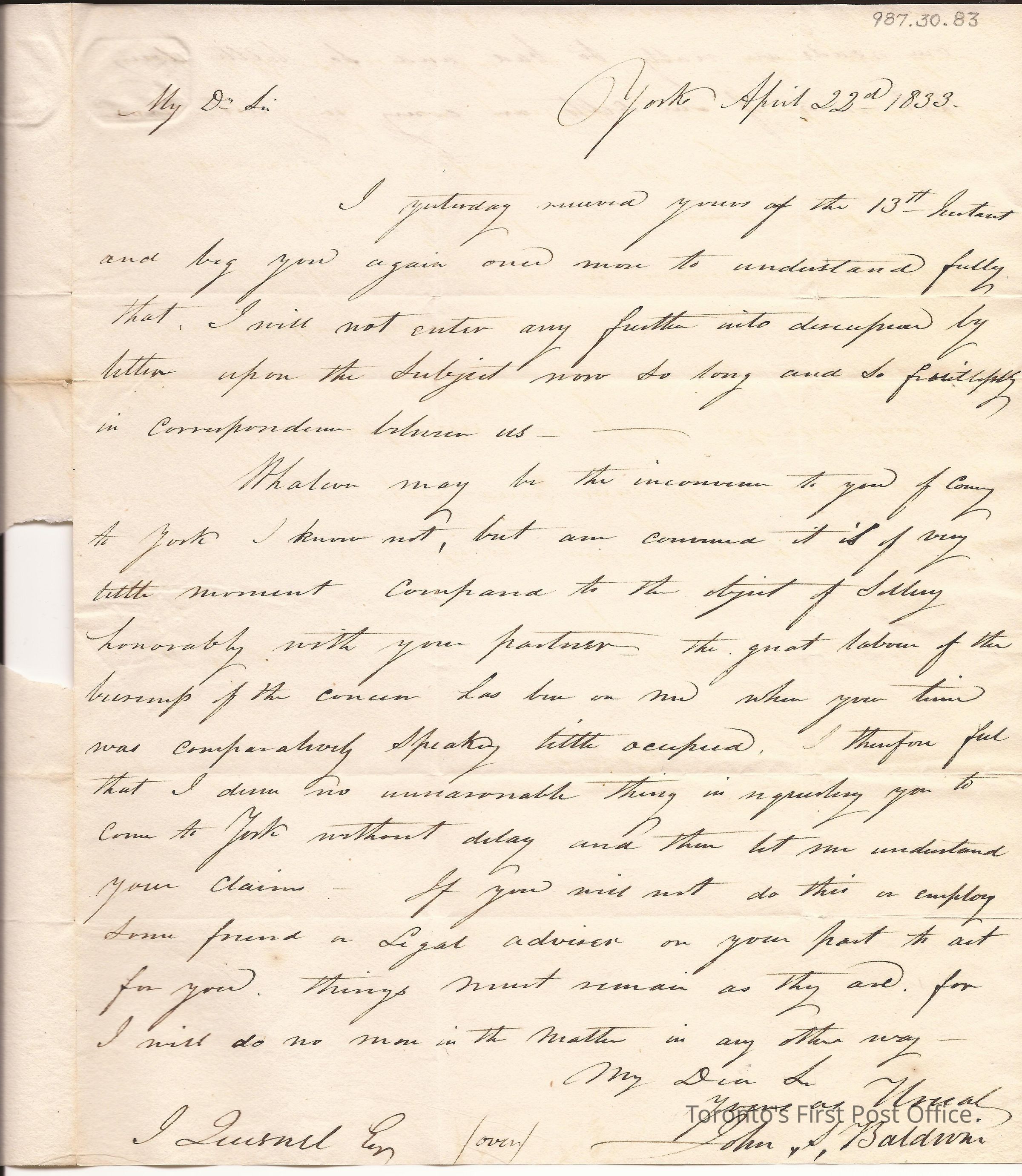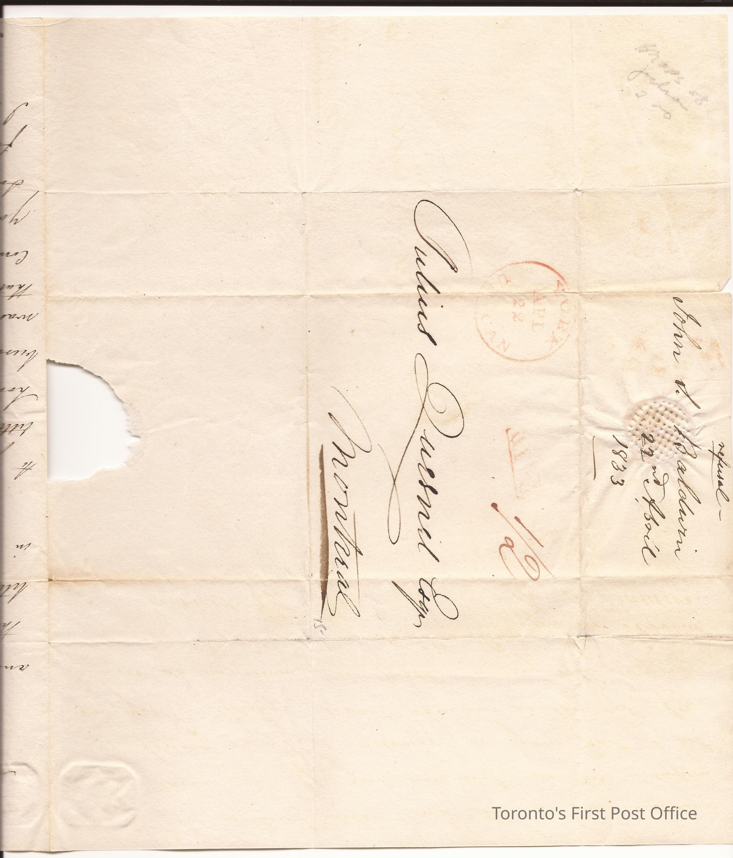 Letter from John S. Baldwin, York; to Julius Quesnel, Montreal; dated: 22 April 1833; postmarks: "YORK UP CAN APR 22", "PAID", "1/2"; embossing in the left side; orange wafer seal; watermark: "W PICKERING AND SONS 1821"; re: answer to the last letter and at the end: our roads are really too bad..."Update Date