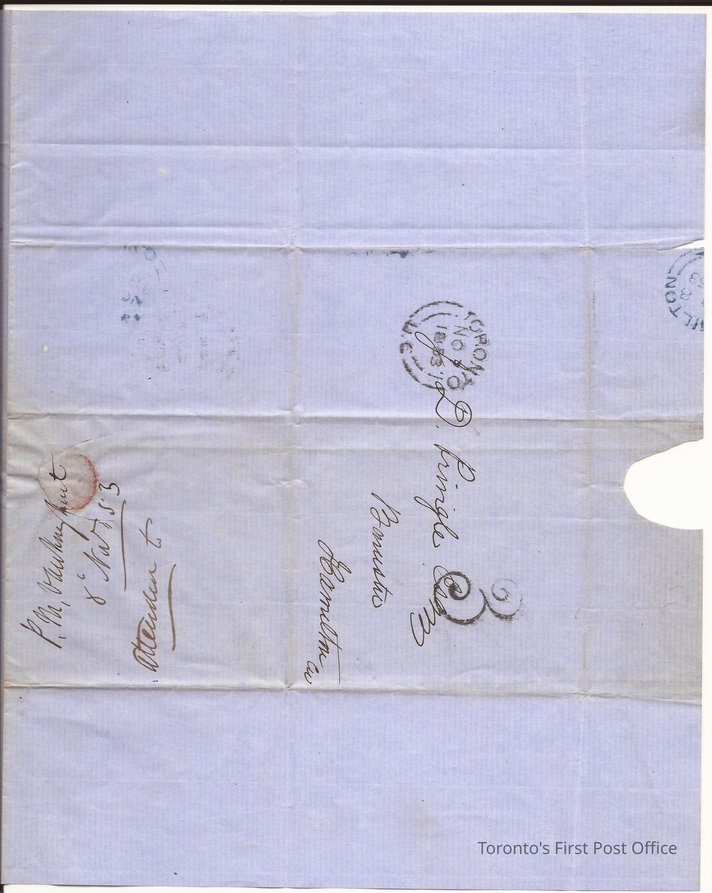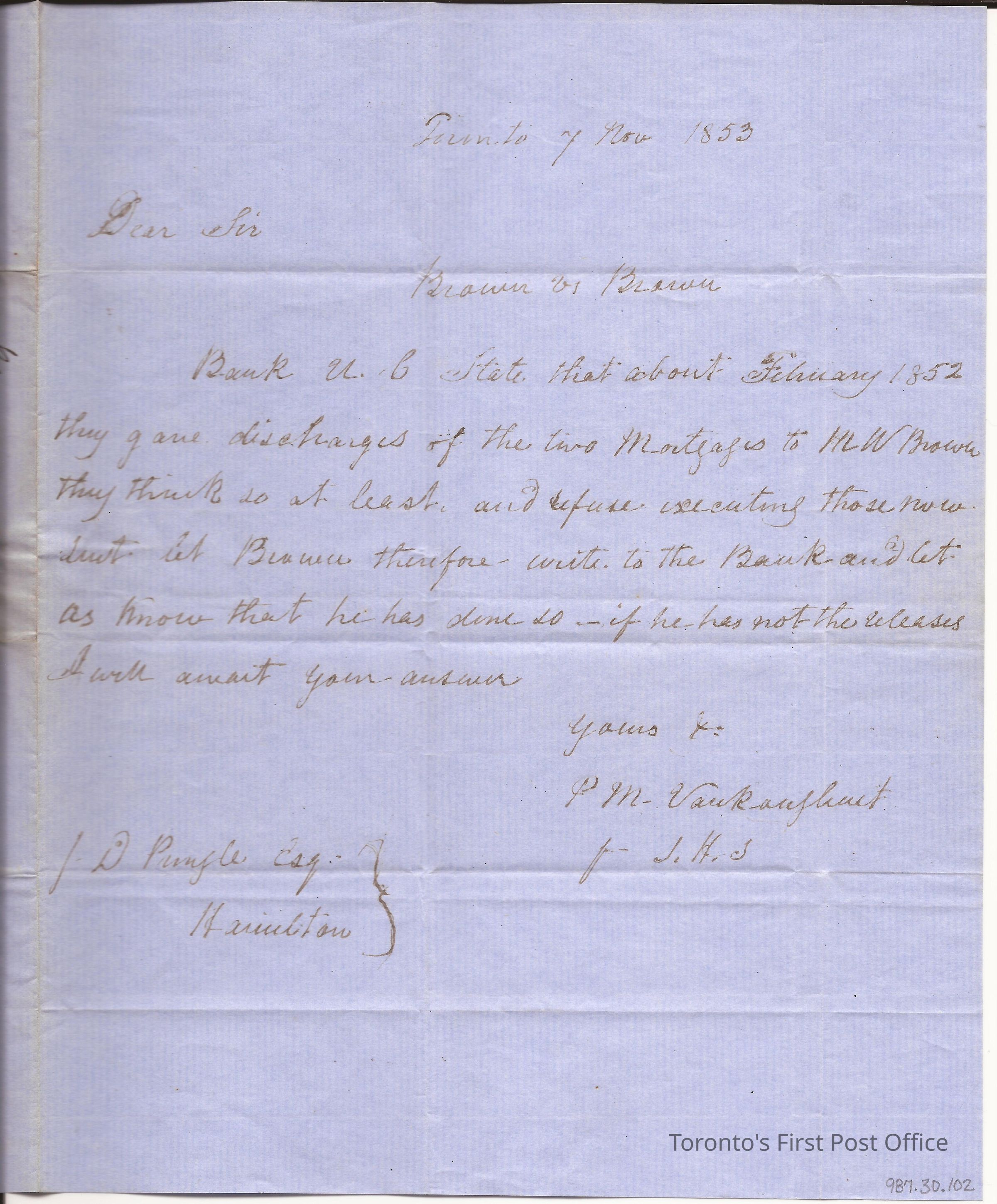 Letter to J.D. Pringle Esq. Barrister Hamilton CW; from P.M. Vankaughnet p. JHS; dated: Toronto 7 Nov 1853; postmarks: 1. black broken double "TORONTO NO 7 1853 U.C.", 2. blue broken double "… ilton… 8… 53", 3. blue broken double "…C…8…", 4. smudged black date stamp, very faint; postage: stamped "3"; cobalt blue, crisp, laid paper; black ink faded to brown; re: question as to whether two mortgages to M.W. Brown have been discharged by Bank of Upper Canada.Dimensions