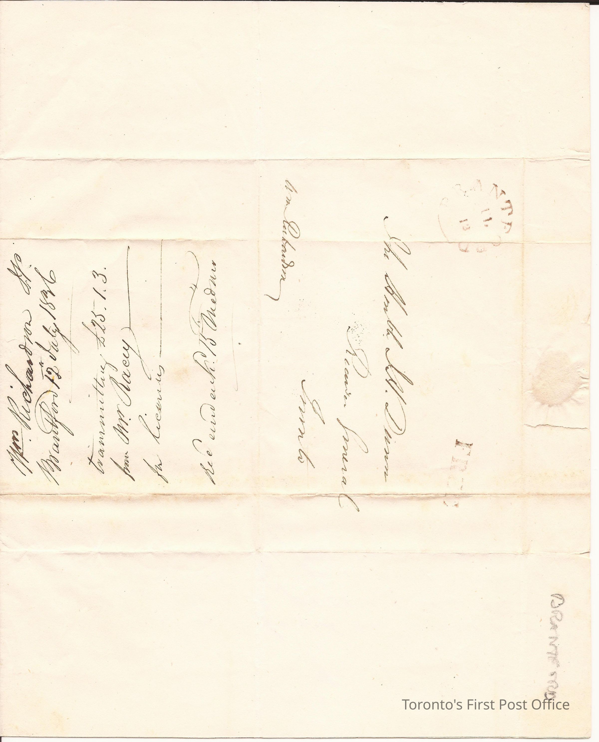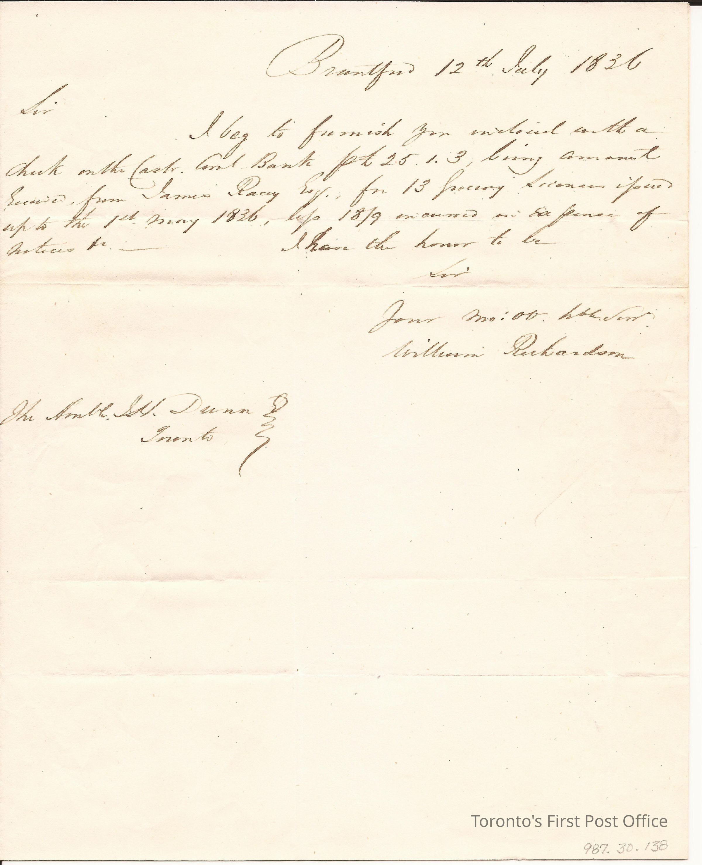 Letter to the Honbl. Q.H. Dunn, Receiver General Toronto; from William Richardson; dated Brantford 12th July 1836; re: remittance of £25.1.3 from James Racey Esq. for the sale of 13 grocery licenses issue up to May 1, 1836 less 1819 for expenses; unbleached, crisp paper; black ink; yellow wafer seal.Dimensions