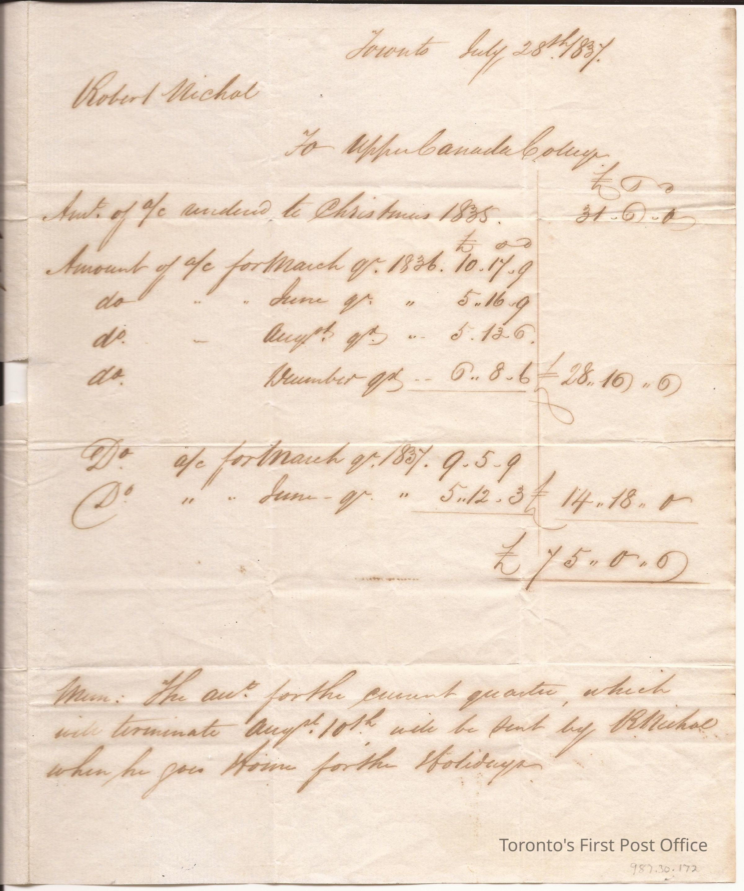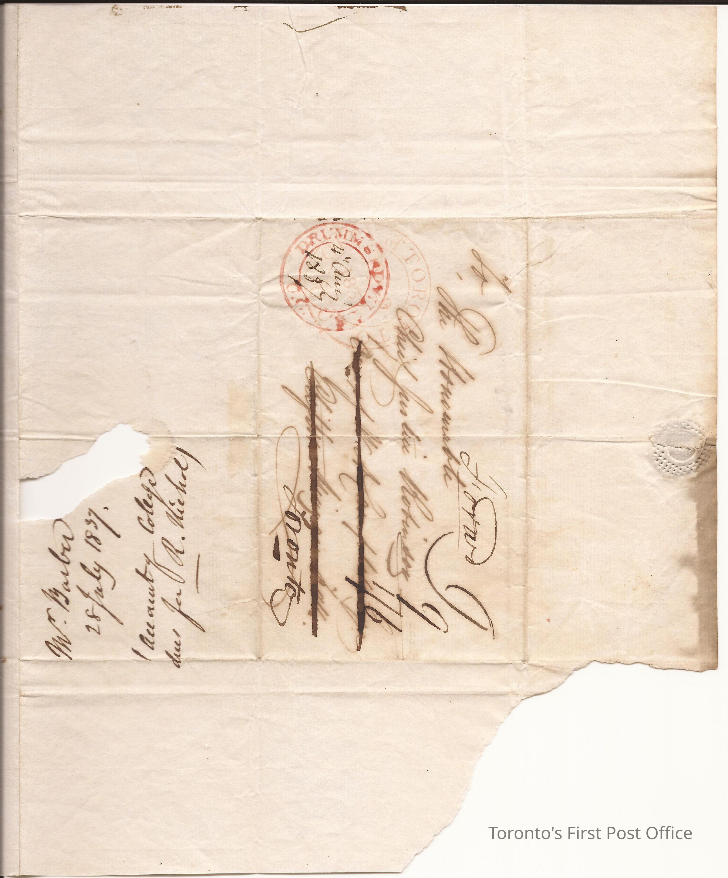 Letter to The Honourable Chief Justice Robinson; from W. Barber; re: account due to R. Nichol; postmarks: 1. red double "DRUMMONDVILLE U.C.", 2. black manuscript 4th Aug 1837, 3. red double "CITY OF TORONTO… 9 1837", 4. "Forward"; postage: manuscript "9", "9", "1/6"; unbleached, laid, crisp paper; black ink; watermark: "GHGR-EN 1831"; black wafer seal.Dimensions
