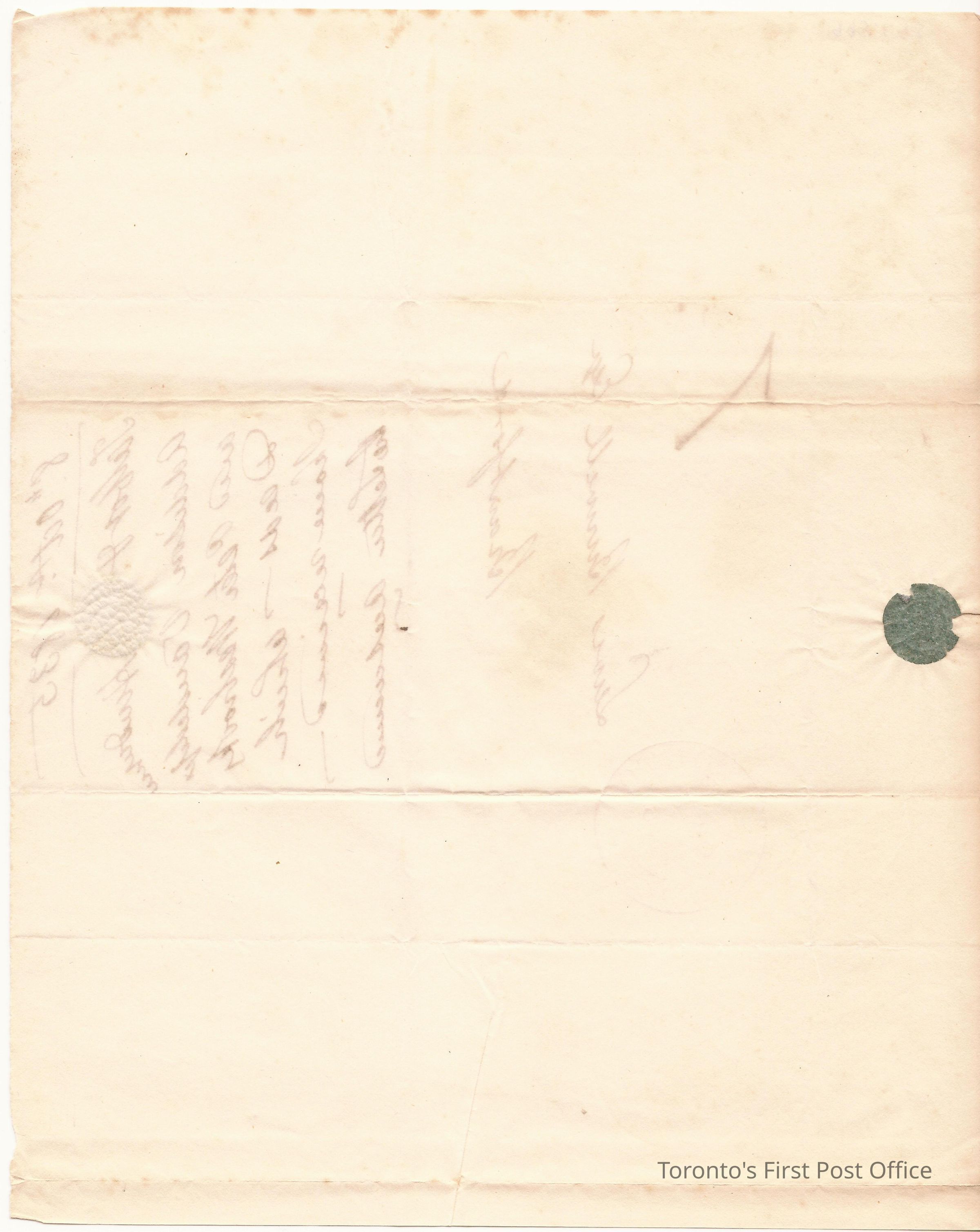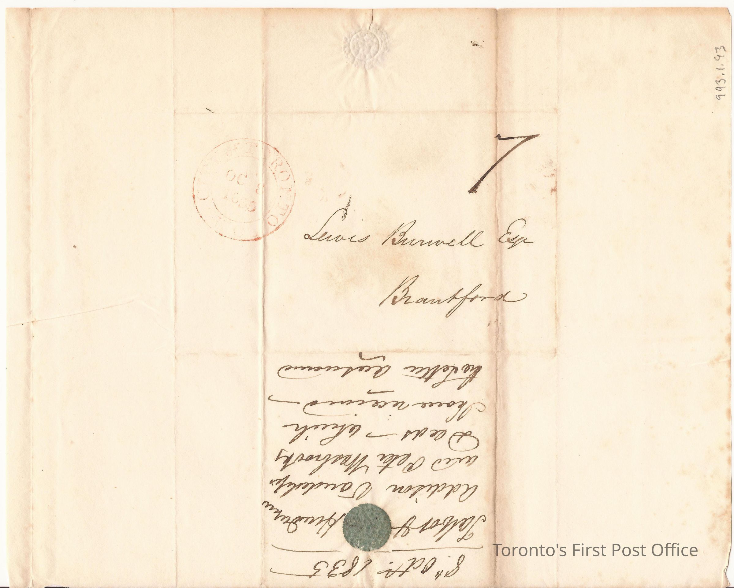 Letter and cover; from Talbot and Henderson; to Lewis Burwell, Deputy Surveyor at Brantford; dated: 8 October 1835; marks: red "CITY OF TORONTO", "OC 8 1835; rated: "7"; 1/2 p.; re: acknowledgement of deeds received from Talbot, Henderson, Addison…"; message is on cover.Dimensions