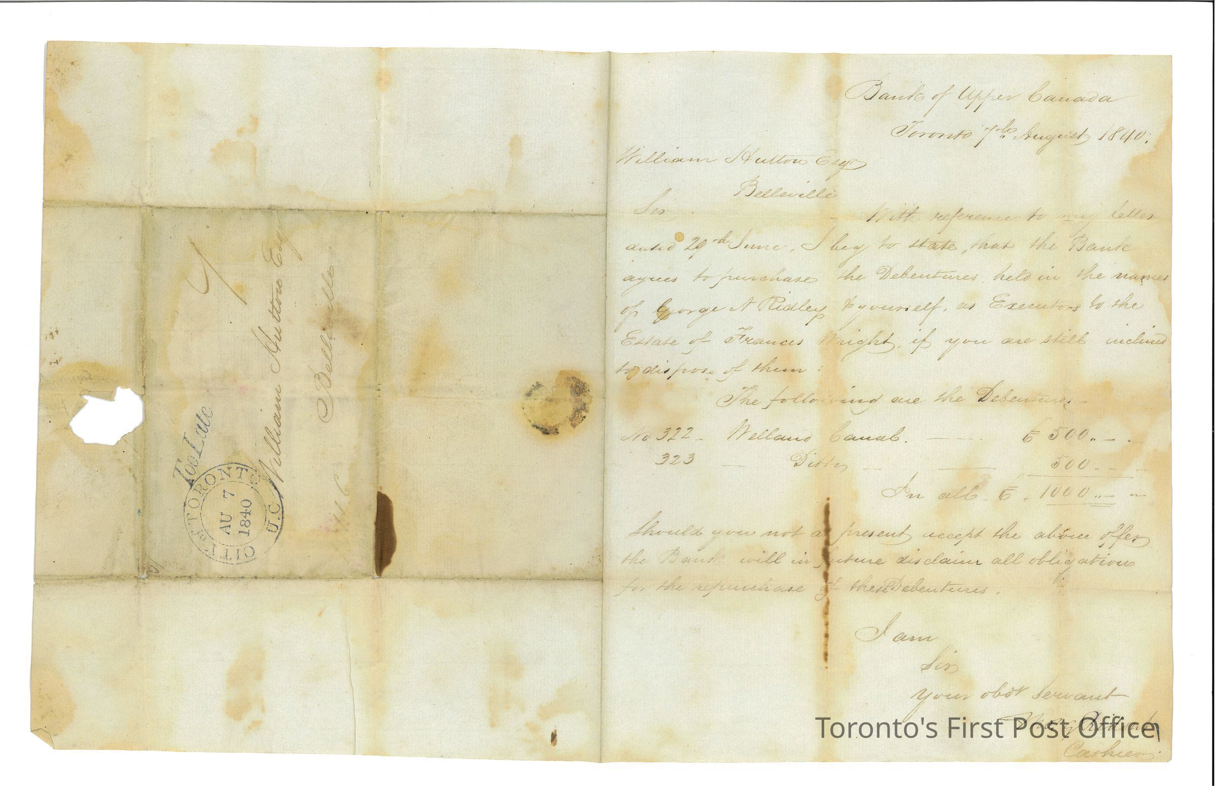 One letter with cover addressed to William Hutton Esq., Belleville; postmarks: black double circle, "CITY OF TORONTO U.C. AU 7 1840"; also black "Too Late", brown manuscript "7"; re: purchase of Welland Canal debentures in the estate of Francis Wright; from Bank of Upper Canada, Toronto; signed Mr. Ridout, Cashier; one page folded in half; on white laid paper.Dimensions