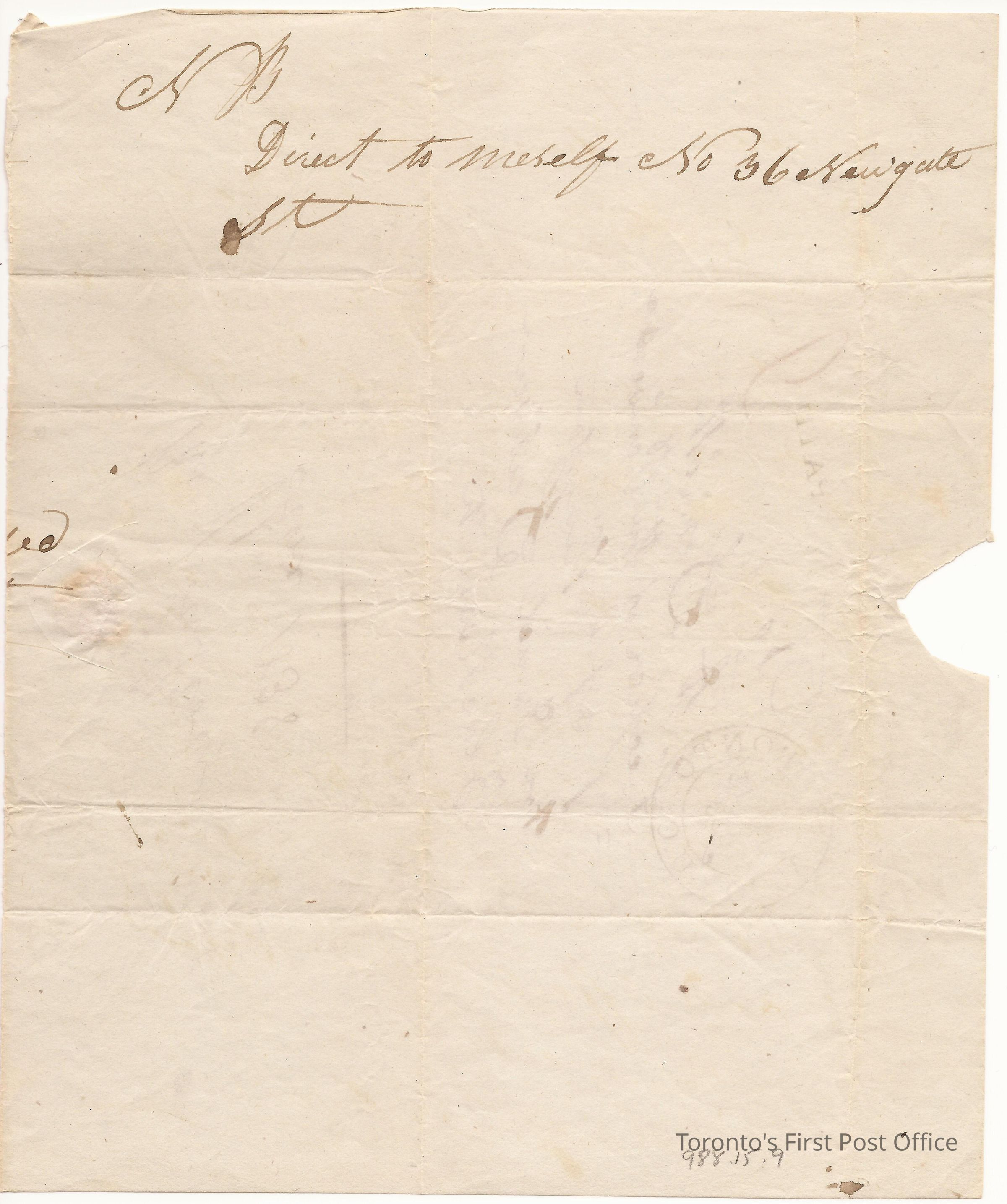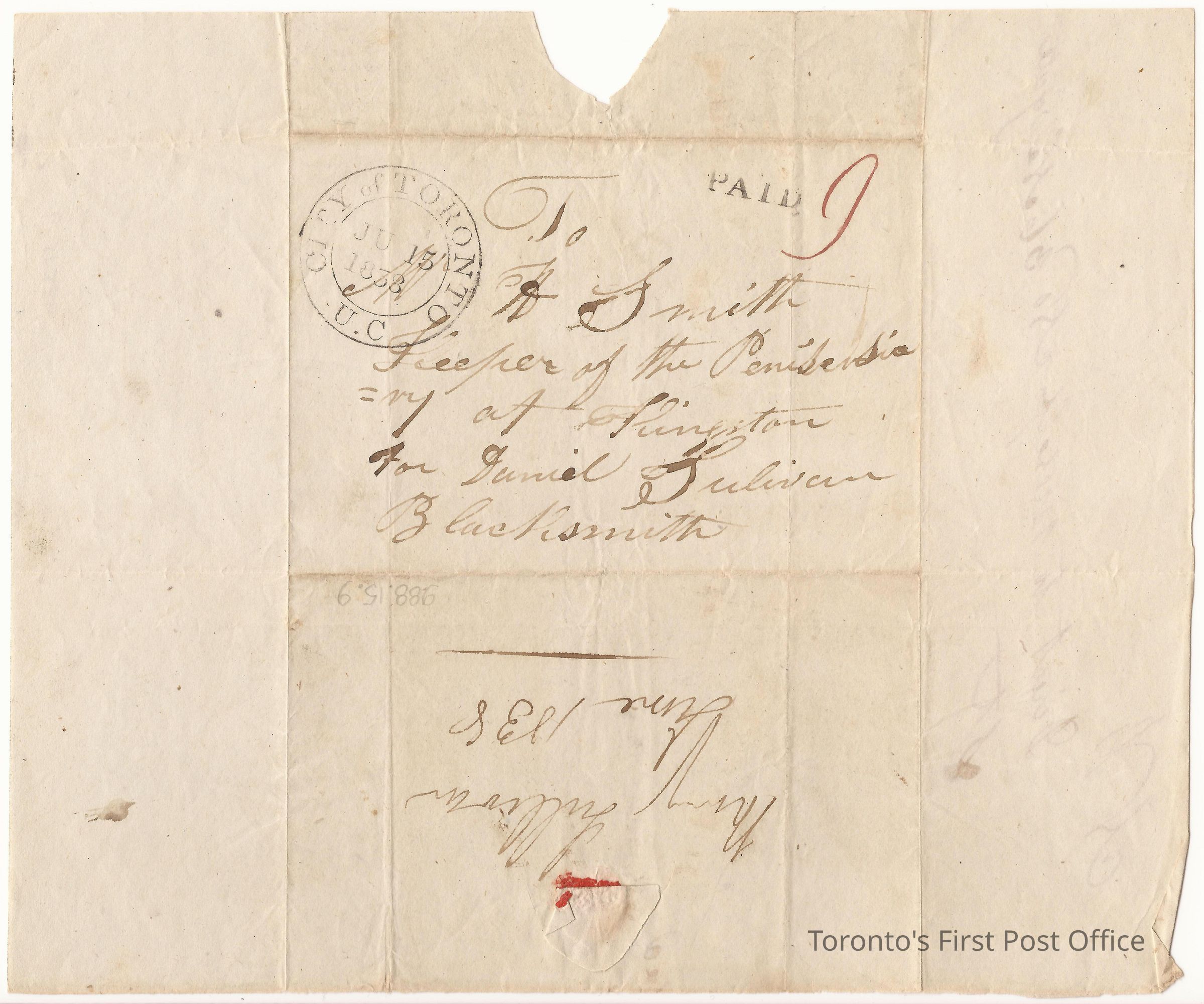 Folded cover; cancelled at Post Office on Duke St. 15 July 1838; addressed "To H. Smith, Keeper of the Penetentiary at Queenston For Daniel Sullivan, Blacksmith"; grey paper; has had wax seal; red mark on upper left corner: "Paid".Update Date